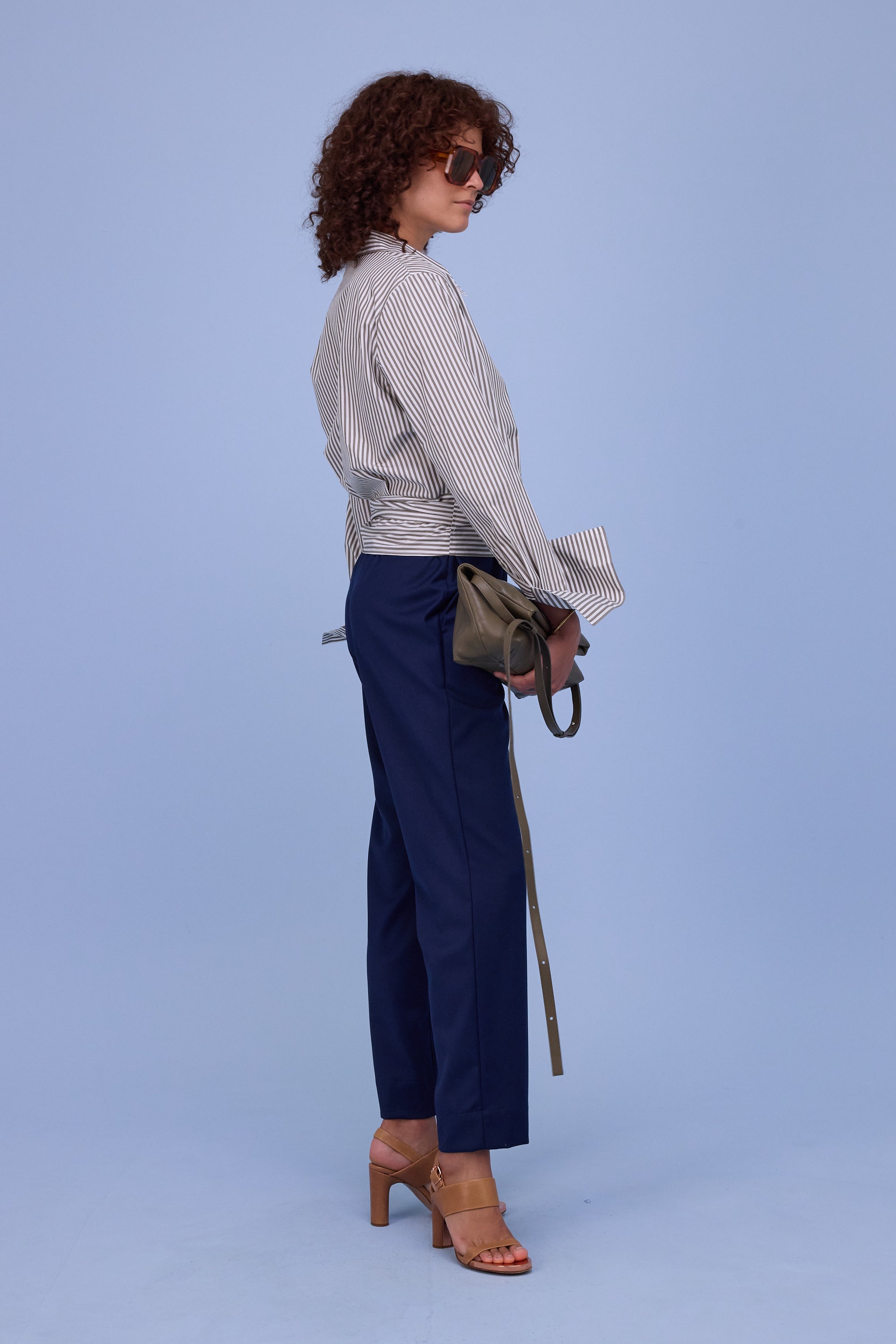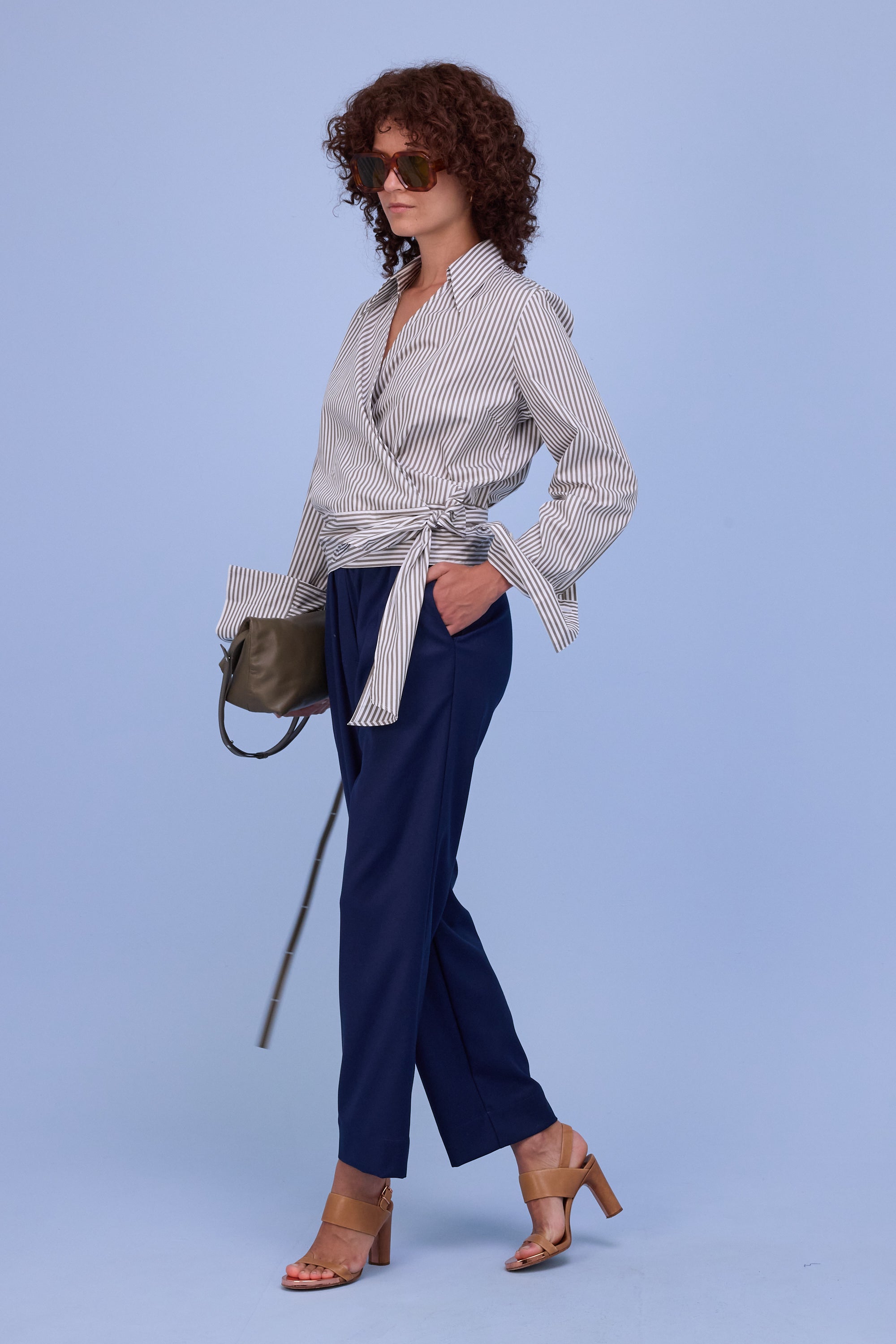 Blouse cache-cœur élégante avec col, en coton à rayures. Cintrée grâce à la fermeture à nouer et, avec sa longueur plus courte, idéale à combiner avec un pantalon taille haute, comme c’est habituel chez Nathalie Vleeschouwer.