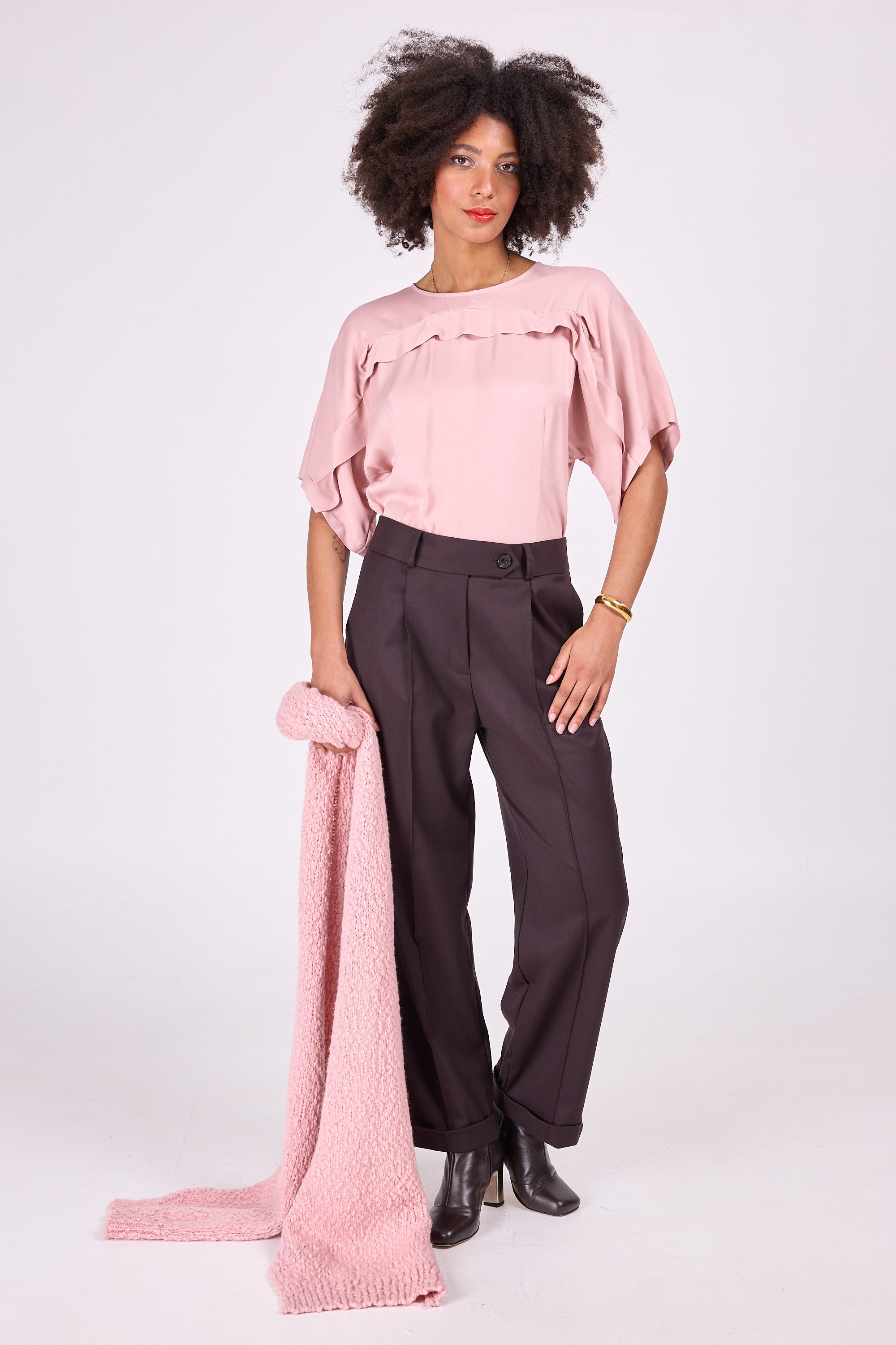 Enzo se situe entre un pantalon large et un pantalon étroit. Avec ses jambes droites et son pli marqué, il a un effet allongeant. Le revers rend le pantalon un peu plus ludique et idéal à combiner avec une botte.