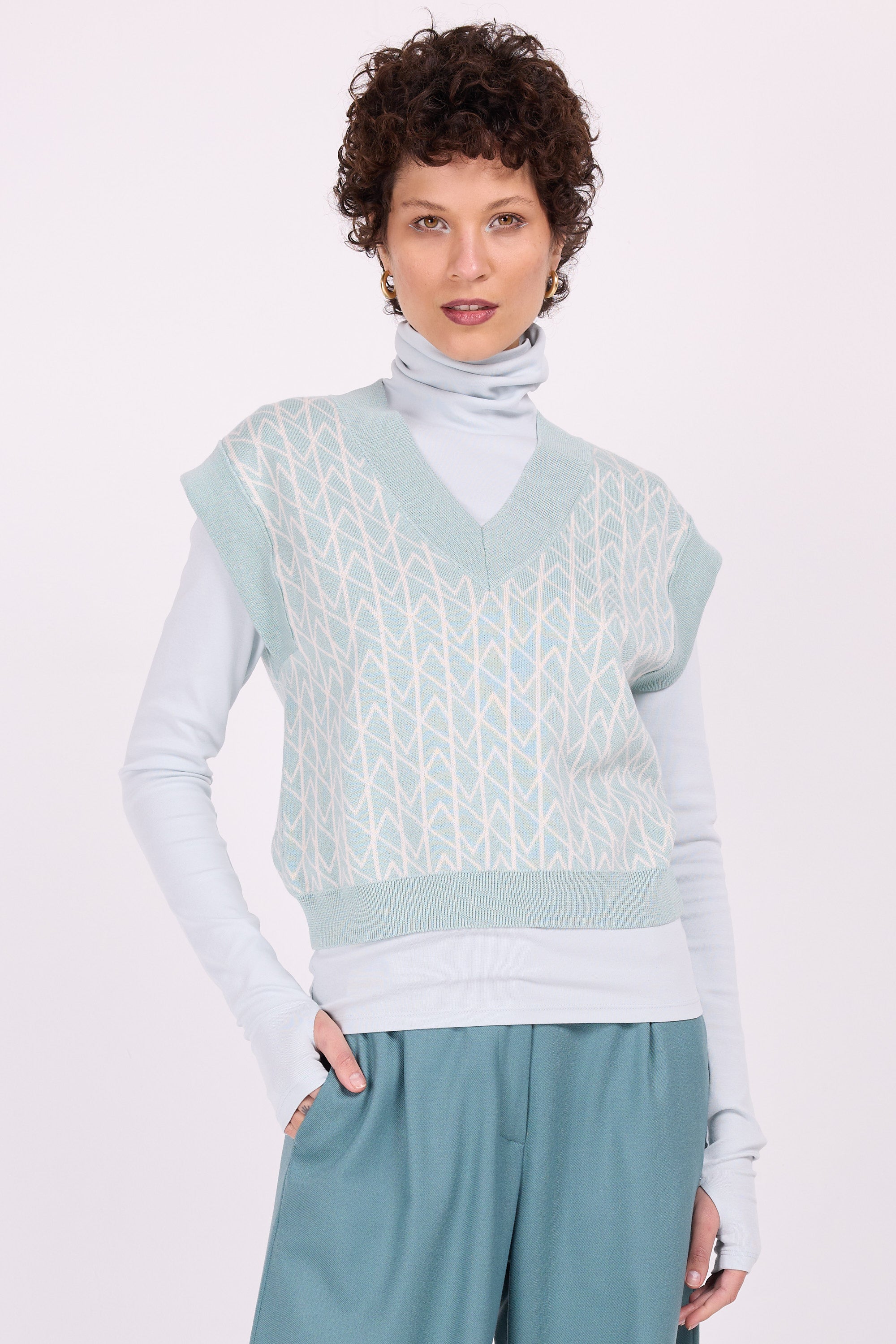 Grafische top in gesatineerd katoen, heerlijk zacht op de huid tijdens zonnige herfstdagen. Wanneer de dagen kouder worden, draag je de top door als debardeur over een hemd of rolkraagtruitje.