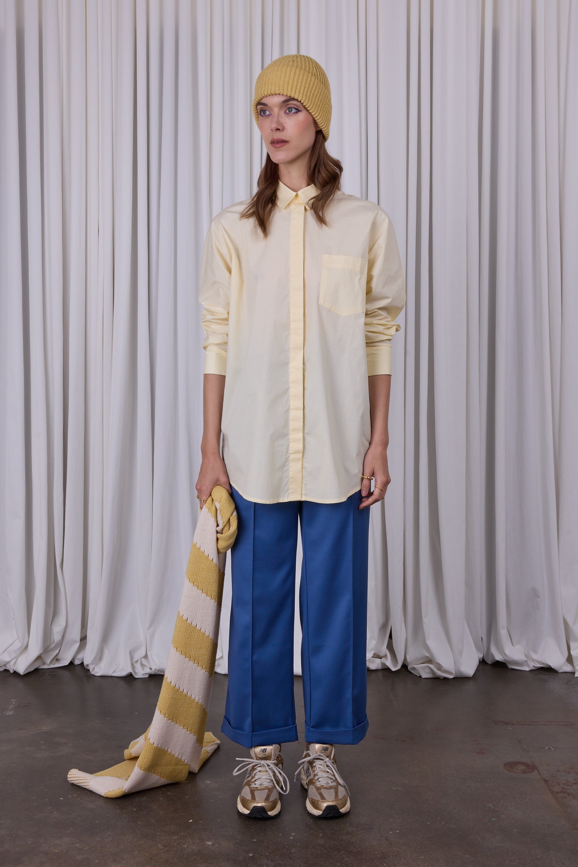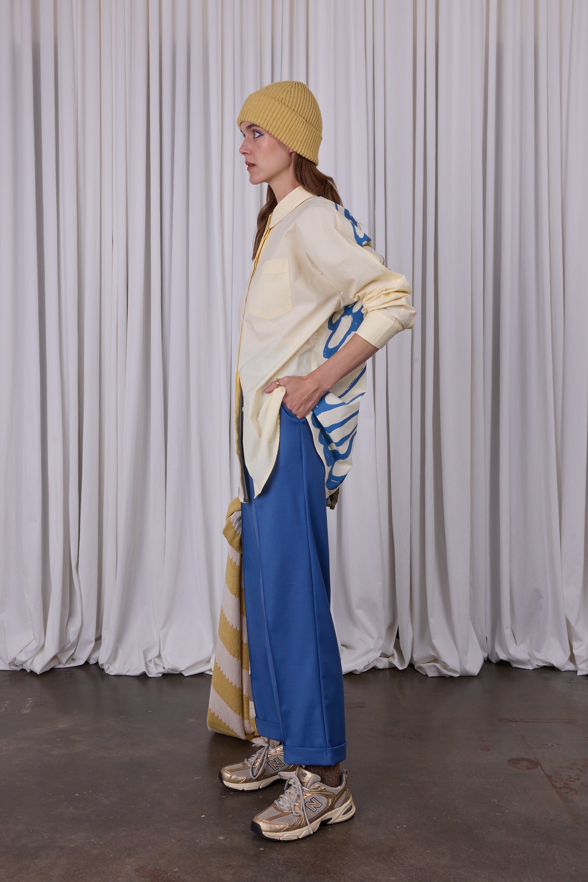 Enzo se situe entre un pantalon large et un pantalon étroit. Avec ses jambes droites et son pli marqué, il a un effet allongeant. Le revers rend le pantalon un peu plus ludique et idéal à combiner avec une botte.
