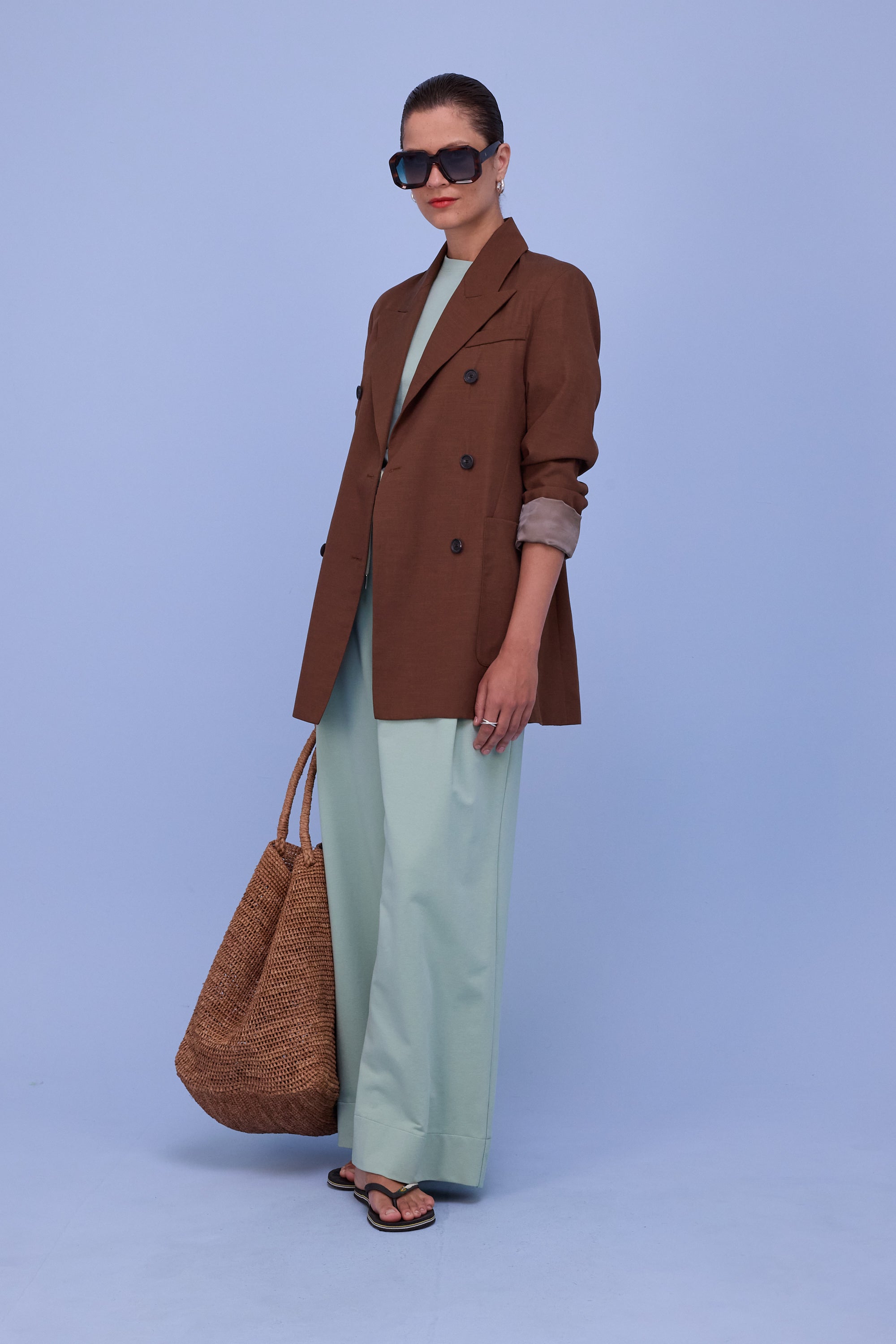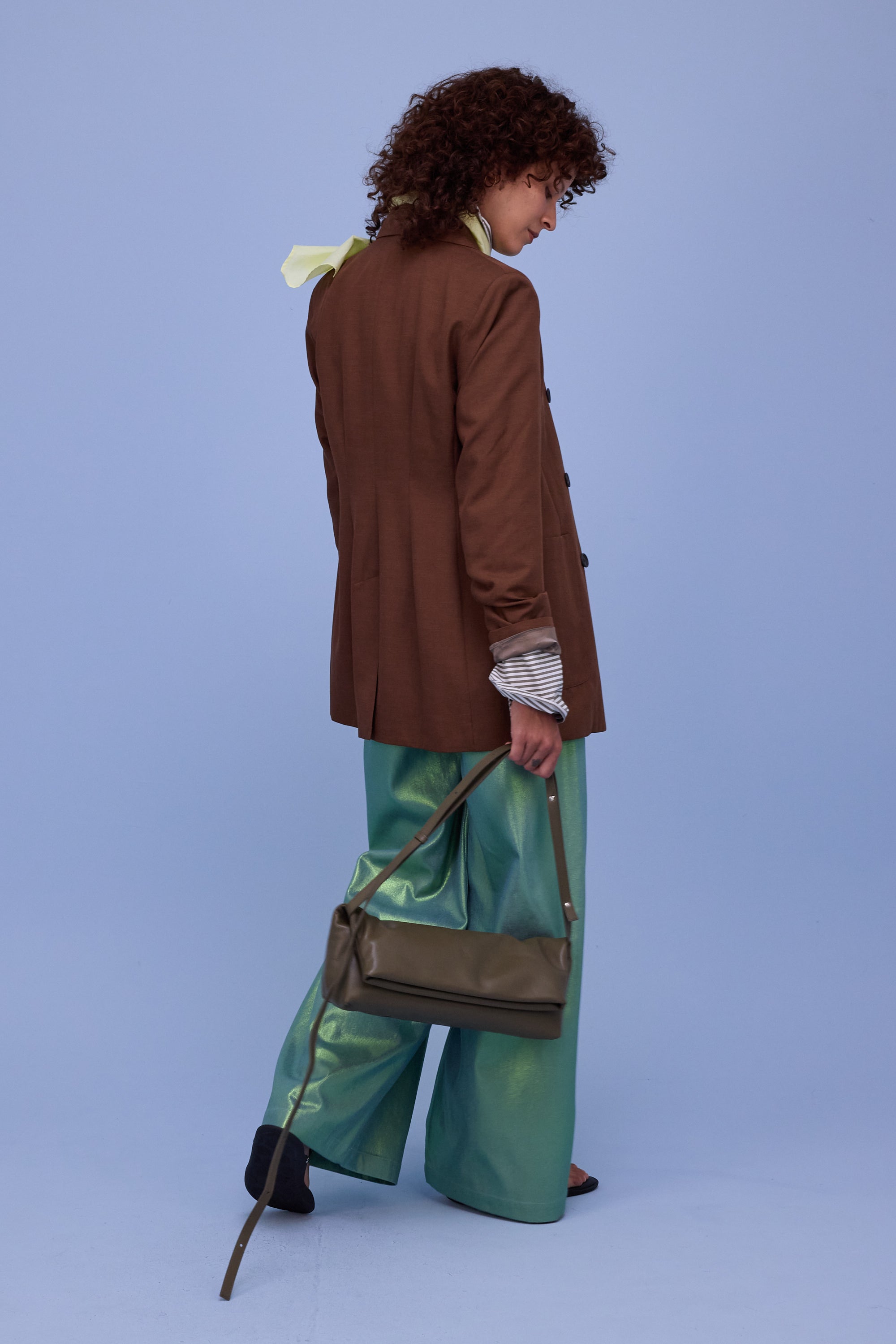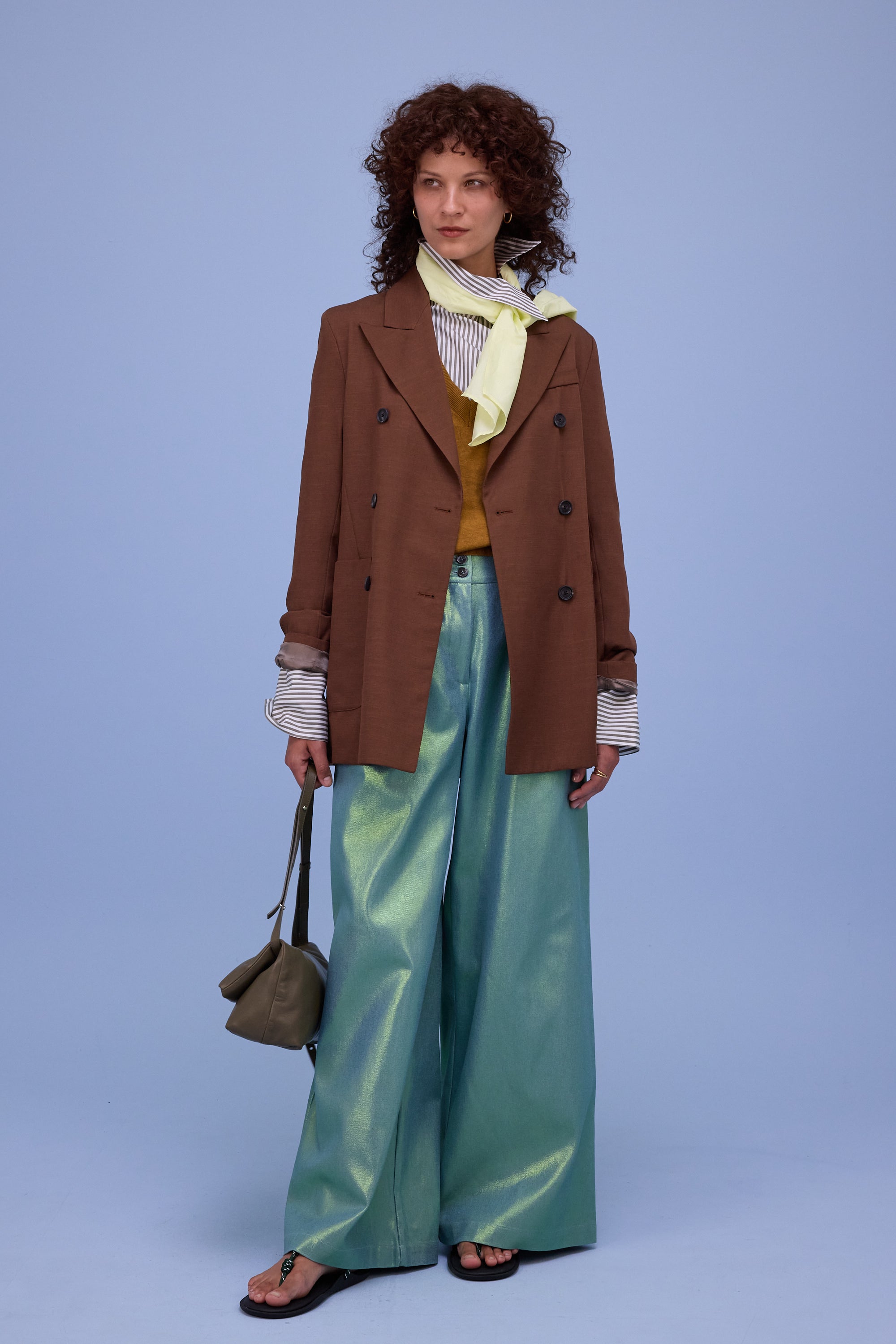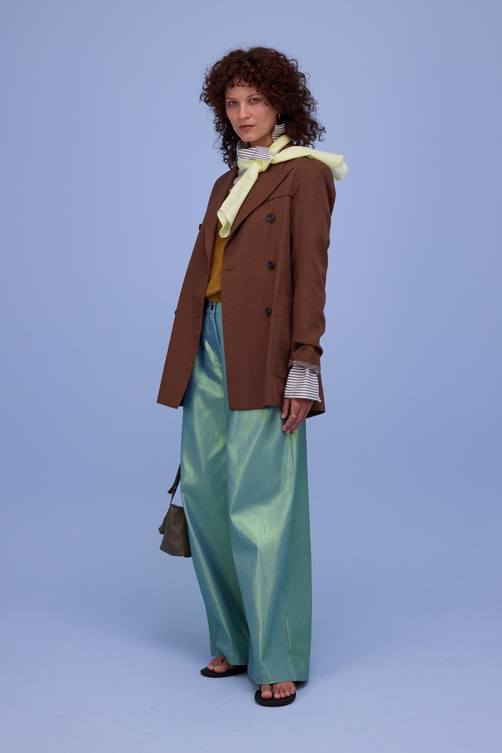 Ce blazer croisé ajusté présente une rangée de boutons marquée, de larges revers et une coupe longue. Glenn a fait son apparition la saison dernière et revient cette saison dans un nouveau tissu, le denim brillant : un coton épais avec un revêtement brillant.