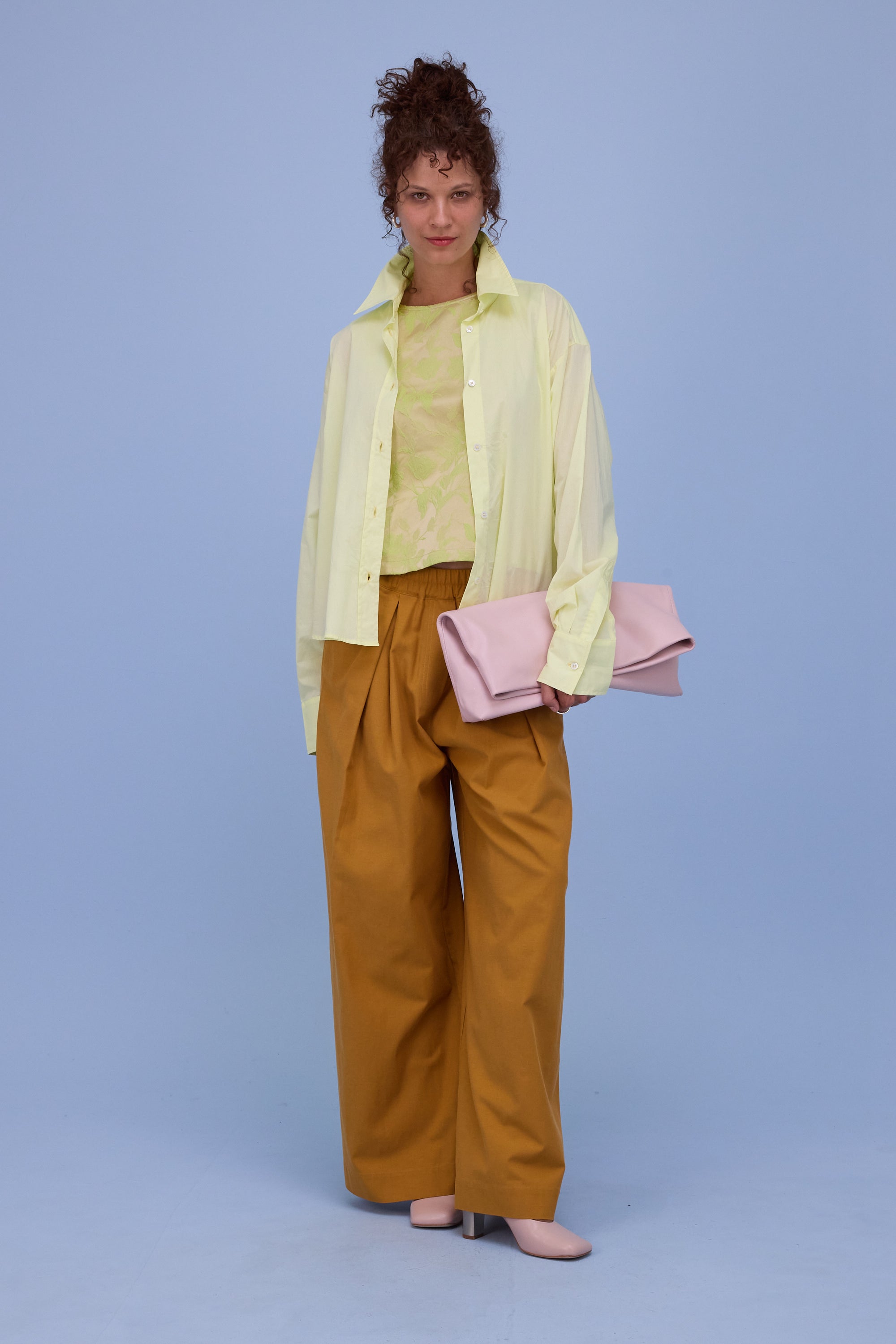 Taille étroite avec élastique froncé et plis, poches latérales, jambes larges.