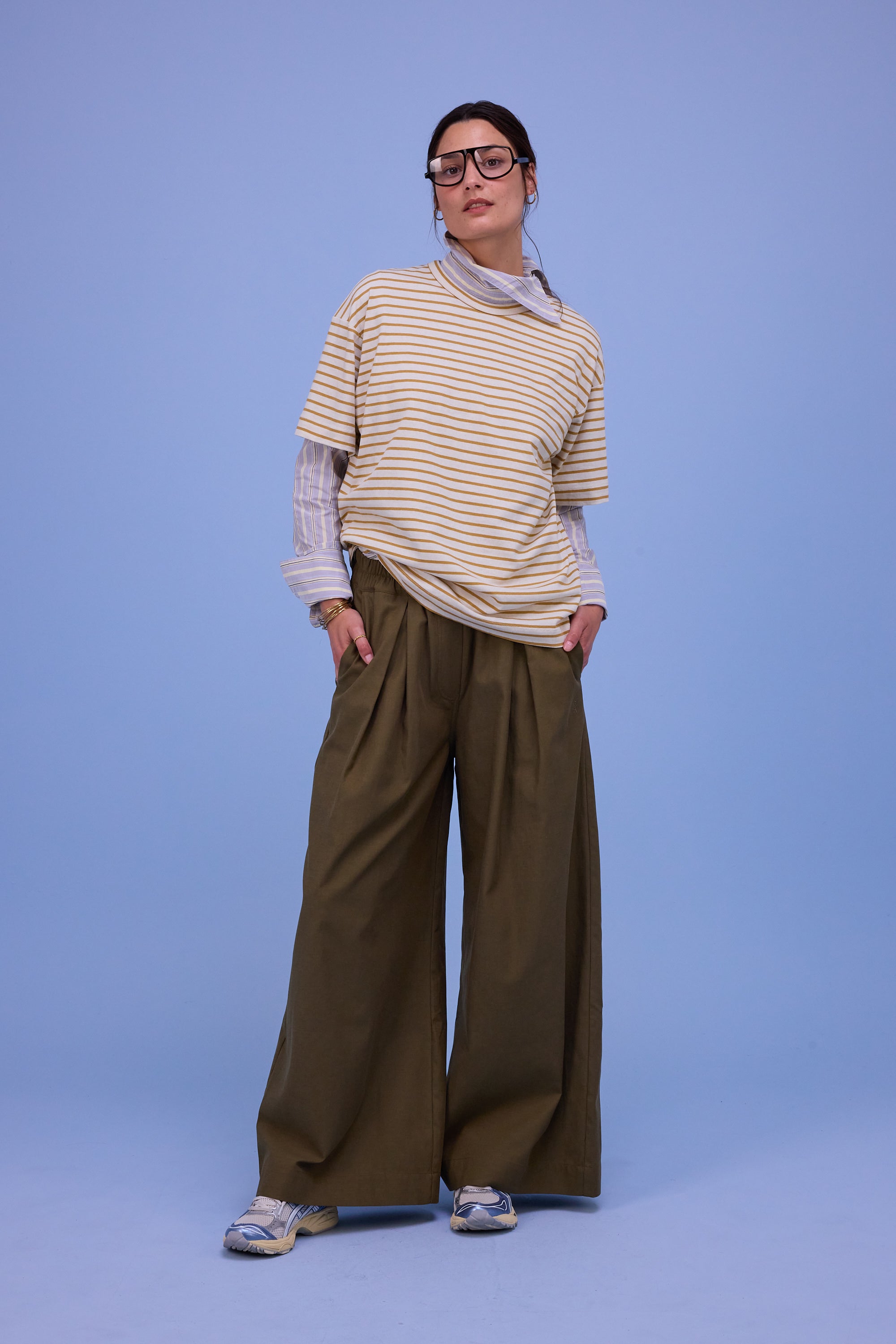 Taille étroite avec élastique froncé et plis, poches latérales, jambes larges.