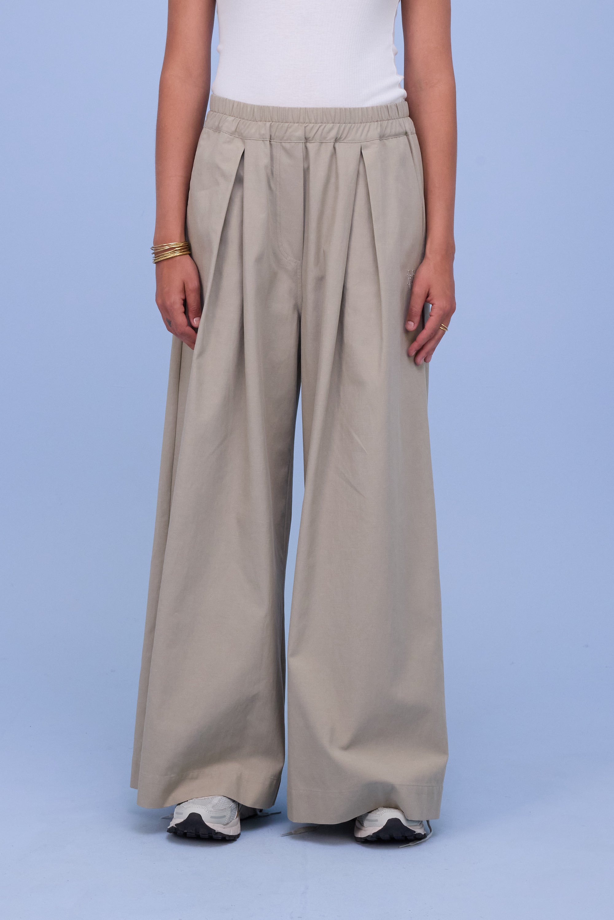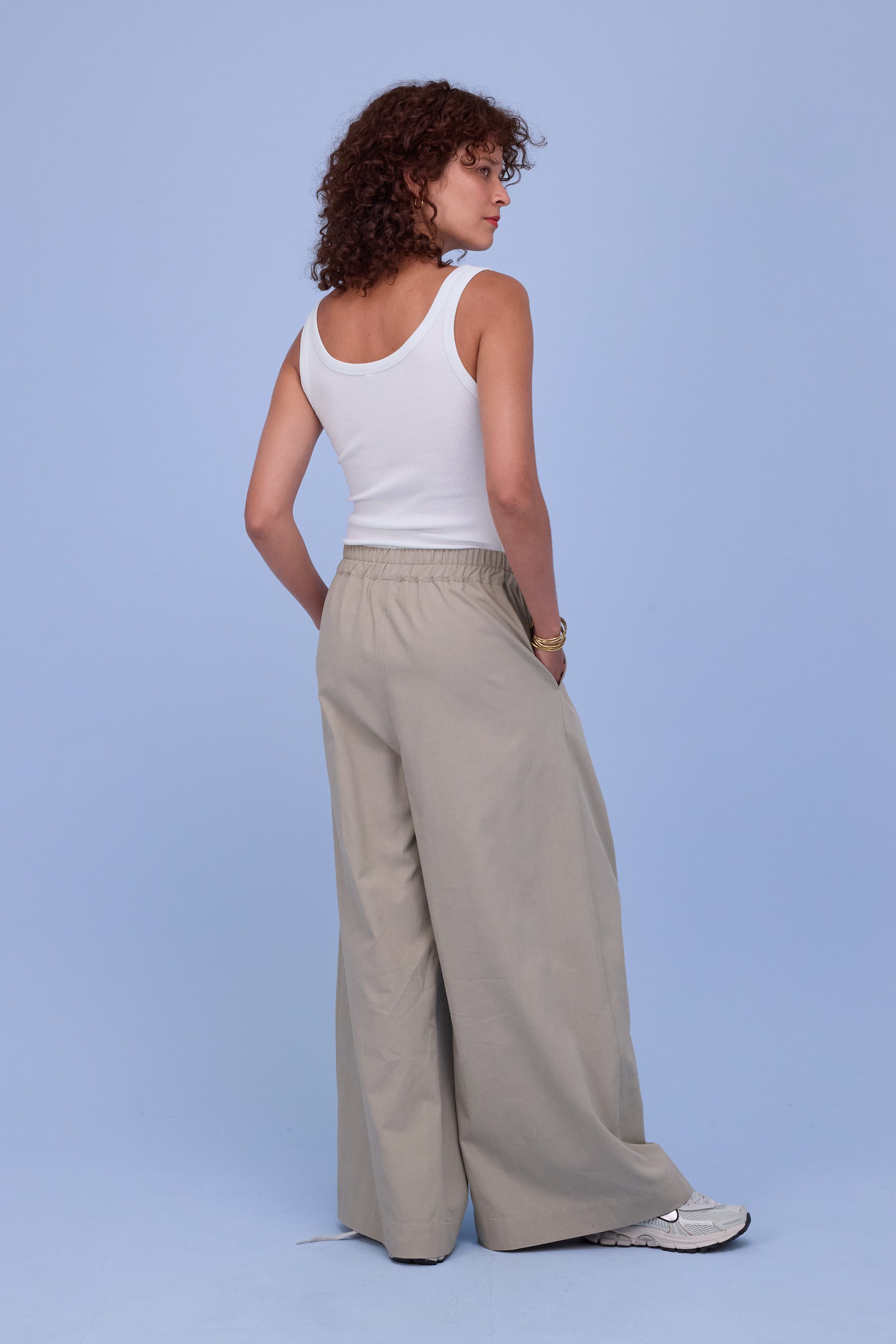 Pantalon volumineux à plis avec large ceinture élastique. Confectionné dans un mélange lyocell-coton, un tissu naturel à l’aspect mat. Modèle best-seller de la collection depuis l’été dernier.