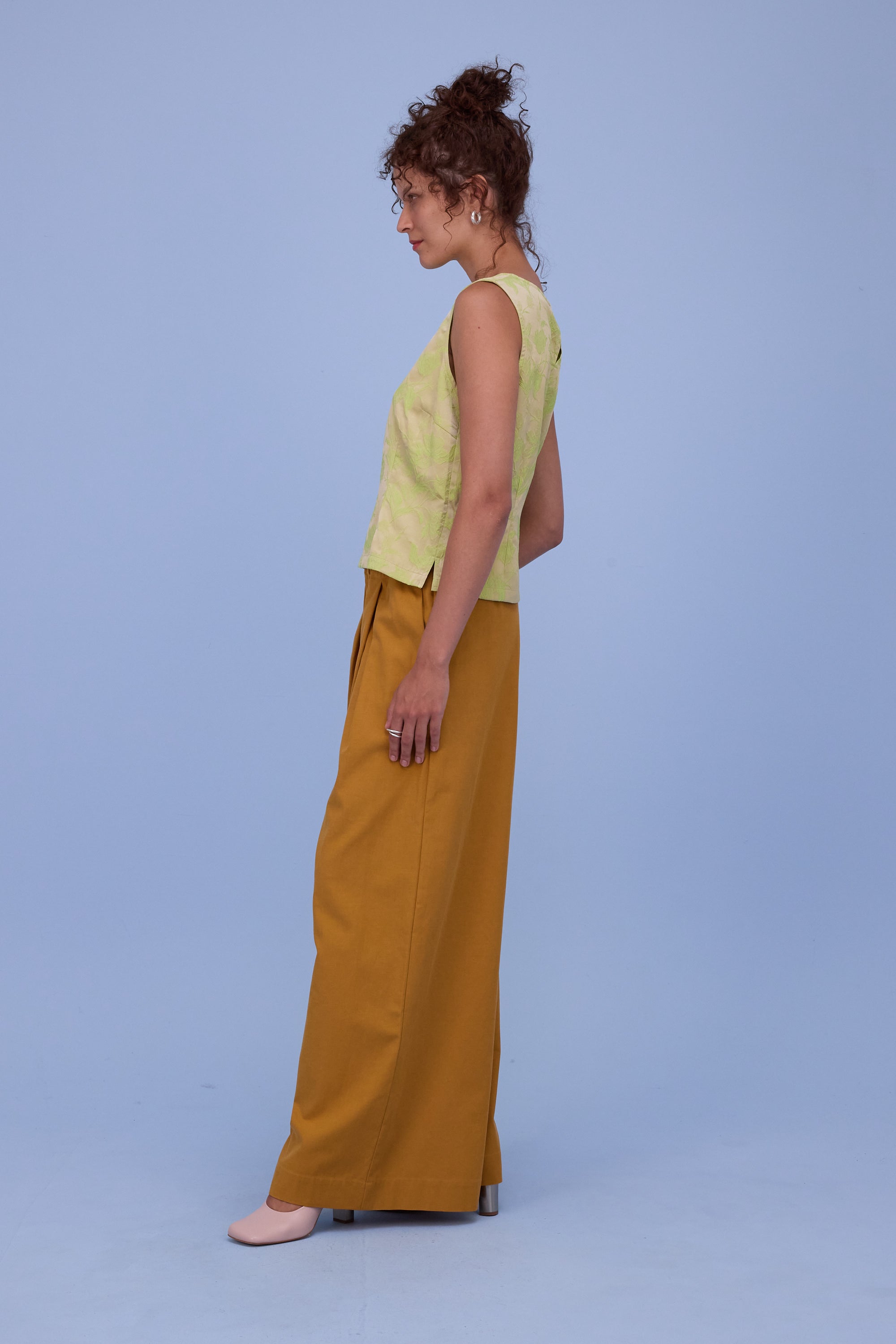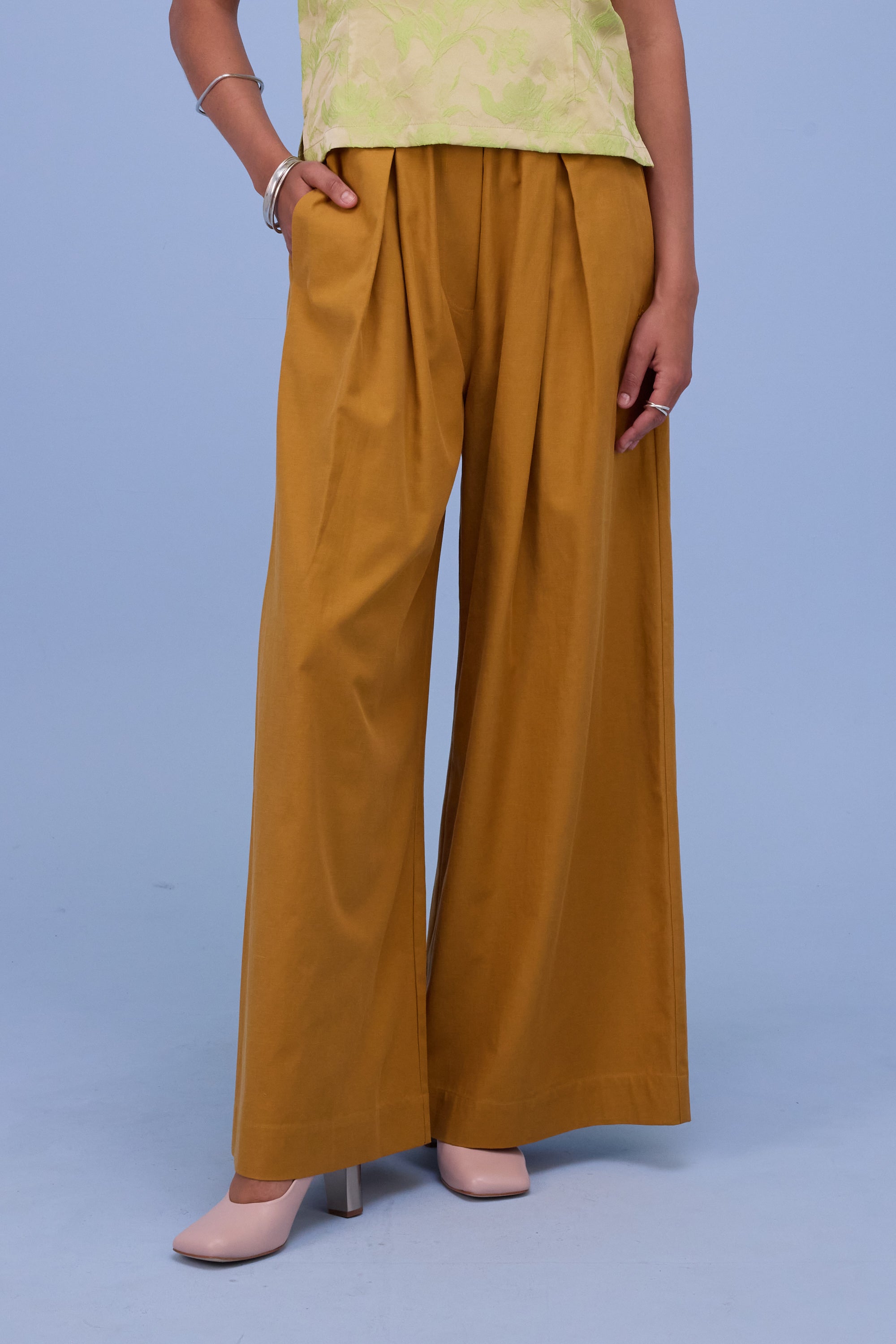 Schmale Taille mit elastischem Bund, Raffung und Falten, Eingrifftaschen, weites Beinvolumen.