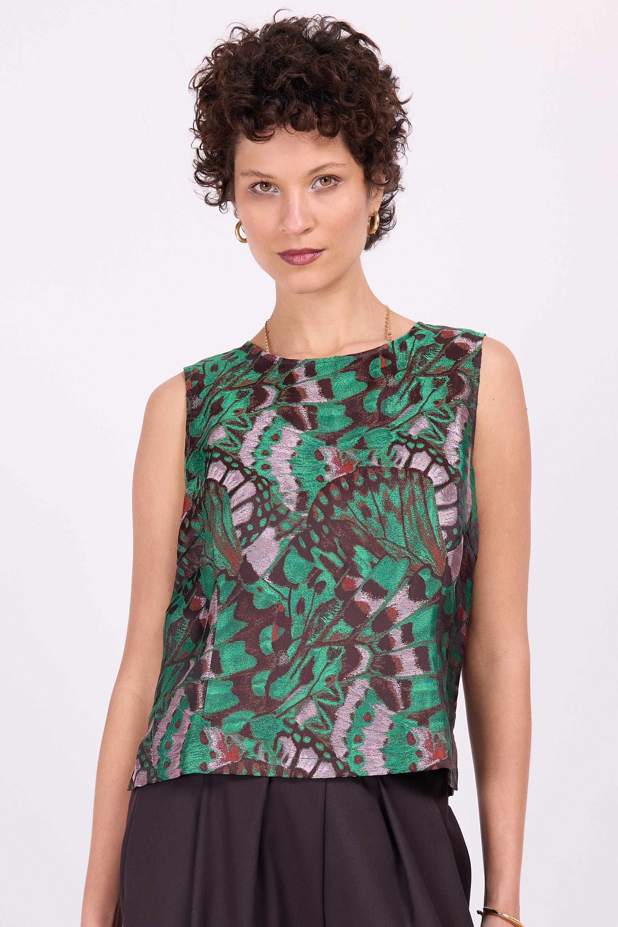 Zentriertes Oberteil, passt perfekt zu Ihrer Anzughose. Die geraden Schultern verleihen eine kraftvolle Silhouette. Ausgeführt in einem weich fließenden, gewebten Jacquardstoff mit eingewebtem Schmetterlingsdruck, mit wunderschönen Farbtönen, die von leuchtendem Grün und Kupfer bis hin zu zartem Rosa und tiefem Braun reichen.