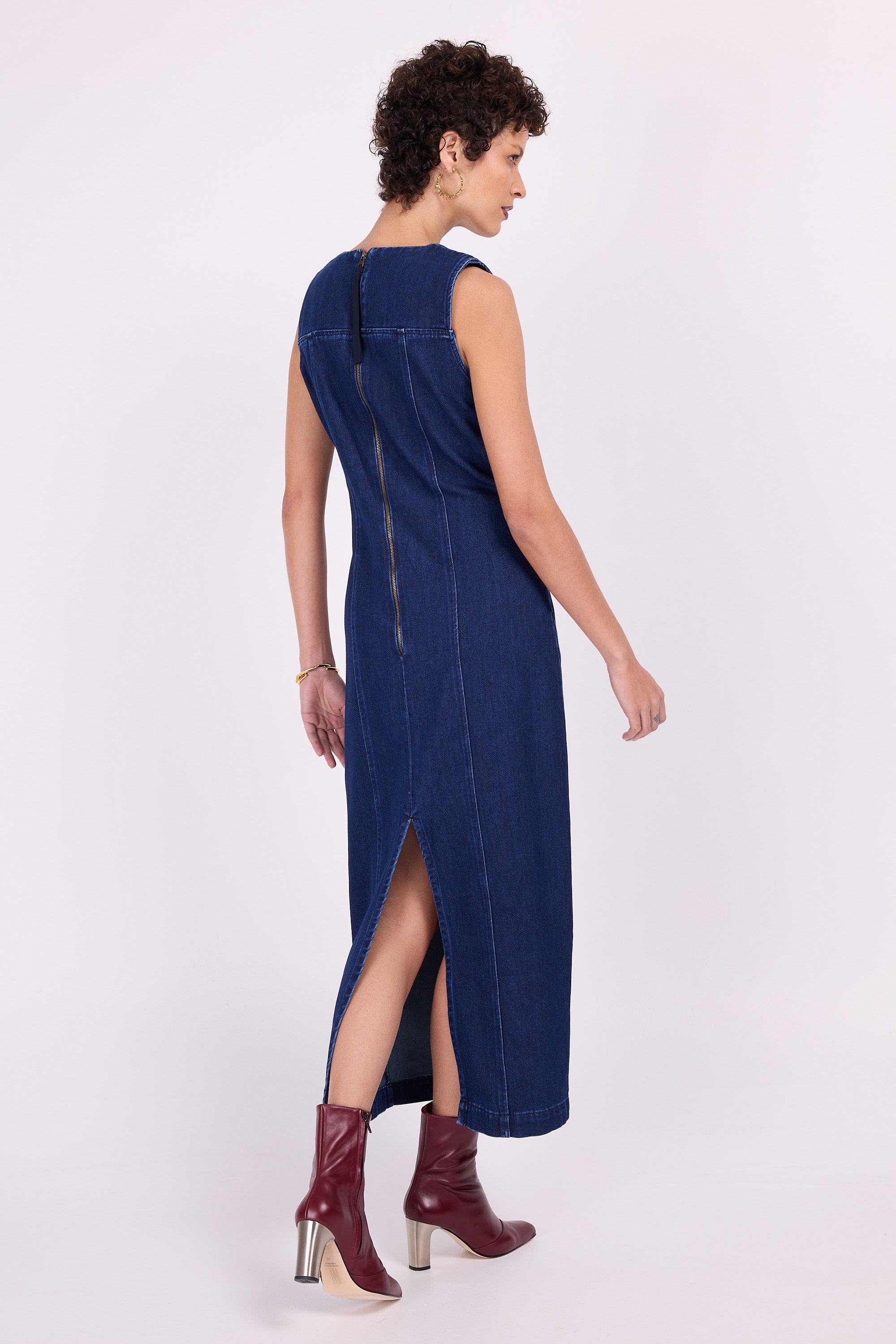 Fernab der ausgetretenen Denim-Pfade präsentiert sich Emilou: ein knöchellanges, tailliertes Kleid, das Ihre Silhouette streckt, Power ausstrahlt und Ihnen durch den hohen Schlitz in der Rückennaht dennoch volle Bewegungsfreiheit lässt.