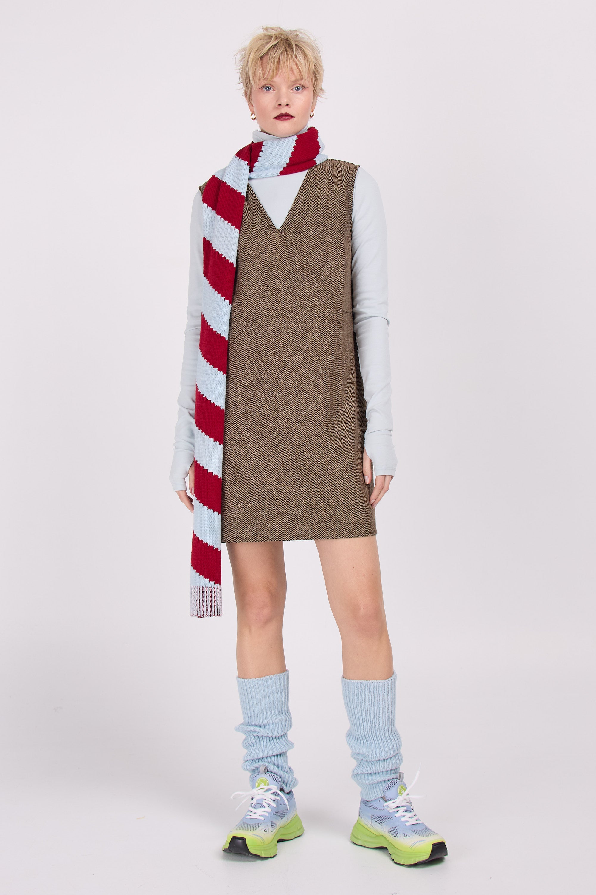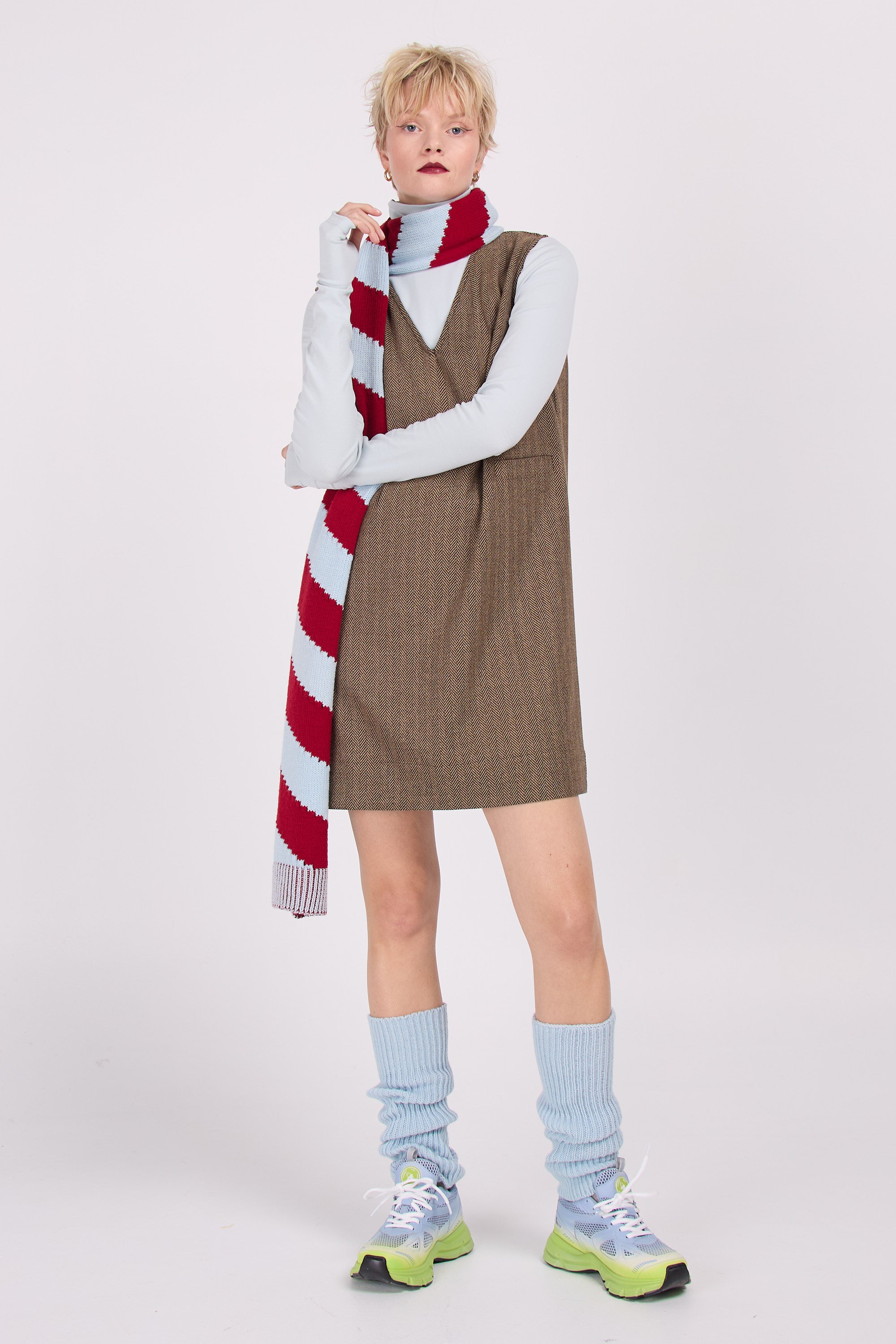 Kurzes Kleid mit V-Ausschnitt und Seitentaschen aus gewebtem Stoff mit Fischgrätenmuster. Tragen Sie Emmy im Winter als Trägerkleid über einem Rollkragenpullover für einen frischen Look, weit entfernt von traditionellen Kleidern.