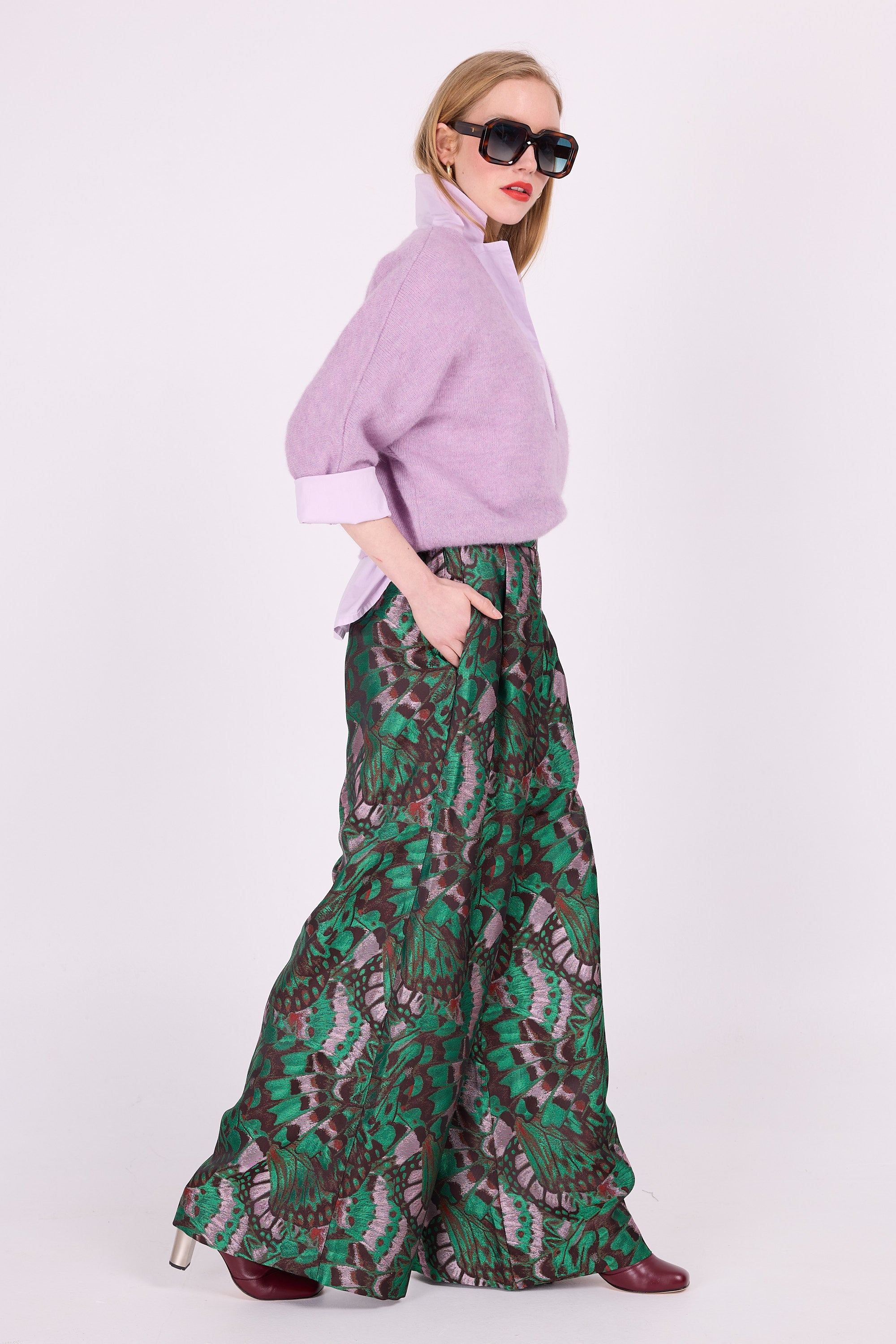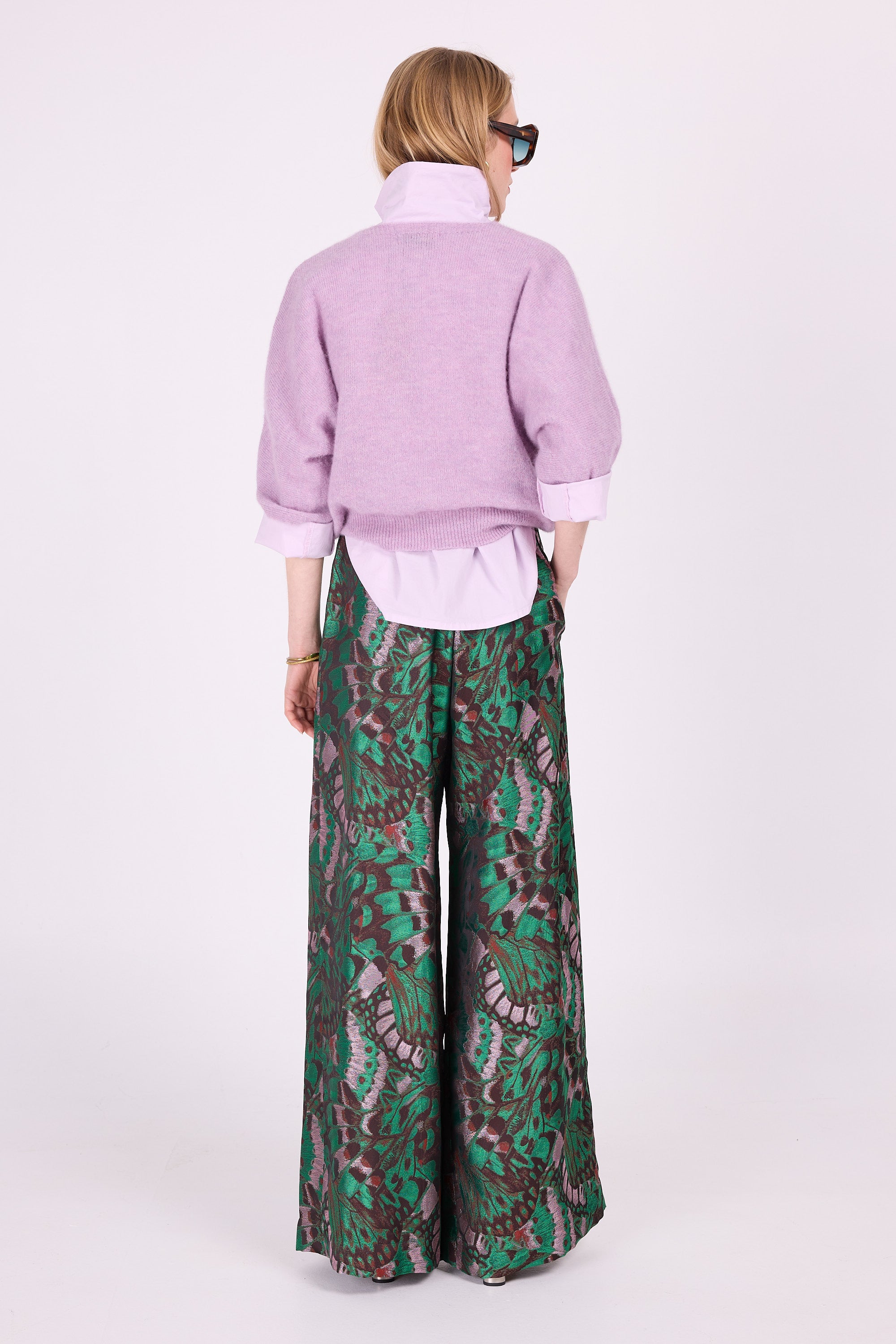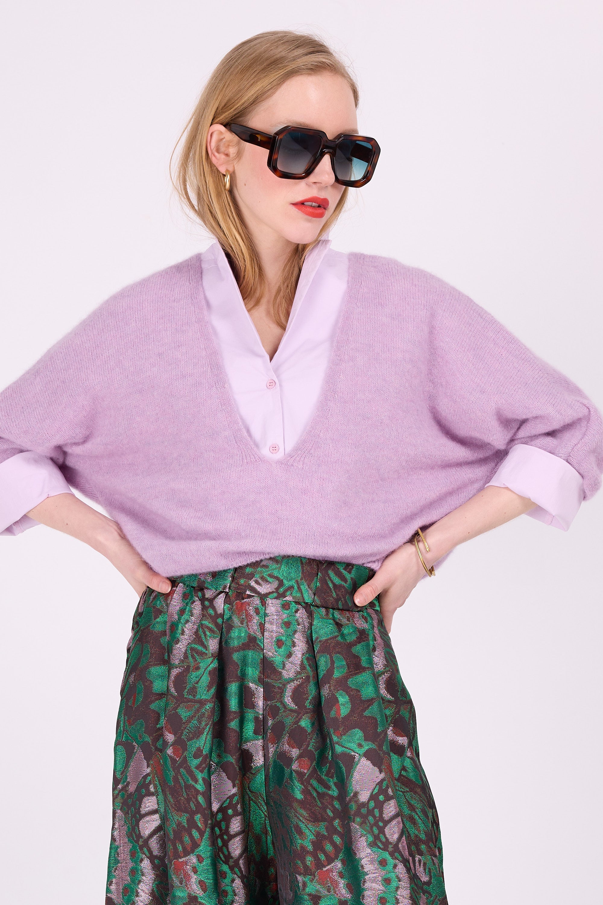 Fein gestricktes, lockeres Oberteil aus Alpaka-Wollmischung, gestrickt in Belgien. Dieses Oberteil mit Schmetterlingsärmeln, tiefem V-Ausschnitt und kurzer Länge kann als zusätzliche Schicht über einem Kleid oder einer Bluse mit hoch taillierten Hosen getragen werden. Sehr gemütlich in Kombination mit Schal Angelo oder Alvros.
