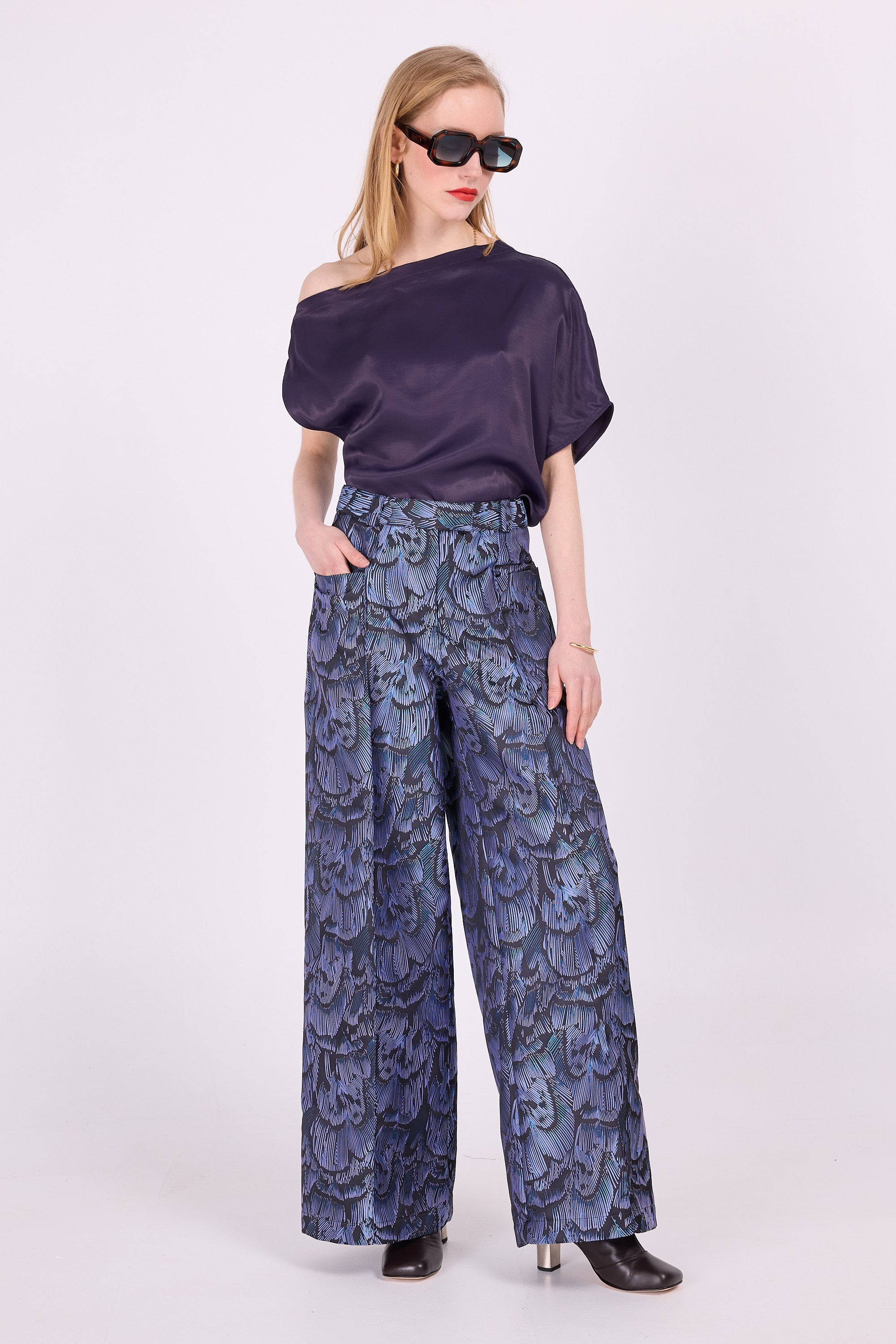 Anzughose aus Libellen-Jacquard mit glänzendem blauem Metallic-Effekt. Das weit geschnittene Modell verfügt über seitliche Eingrifftaschen, die perfekt auf die vordere Mittelnaht ausgerichtet sind und so Ihre Silhouette optisch verlängern.