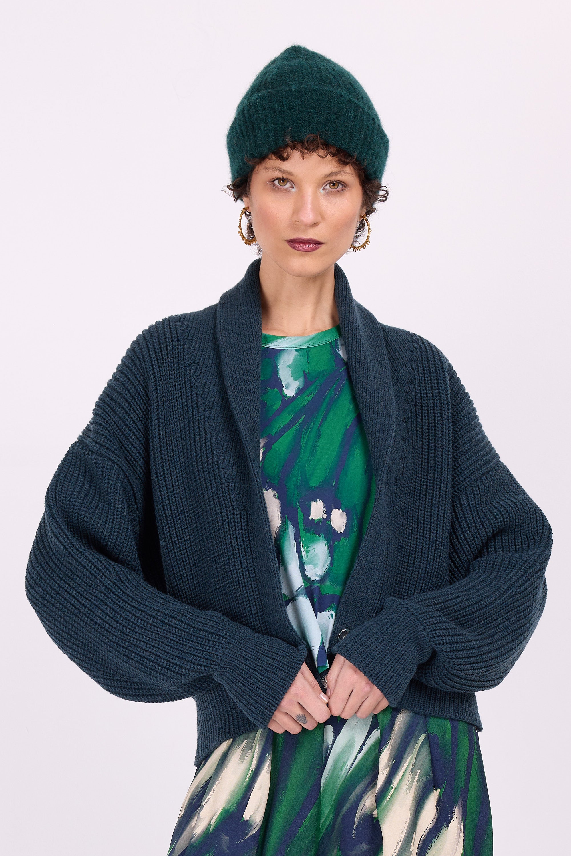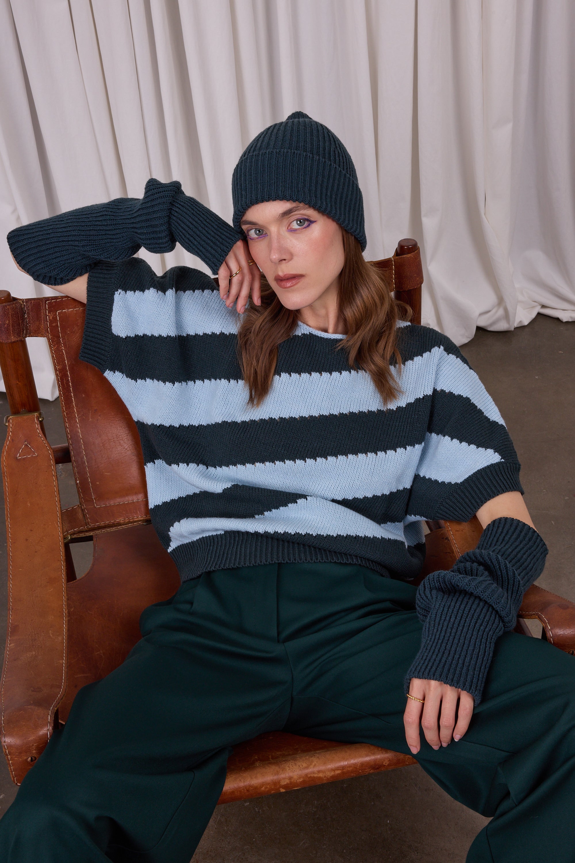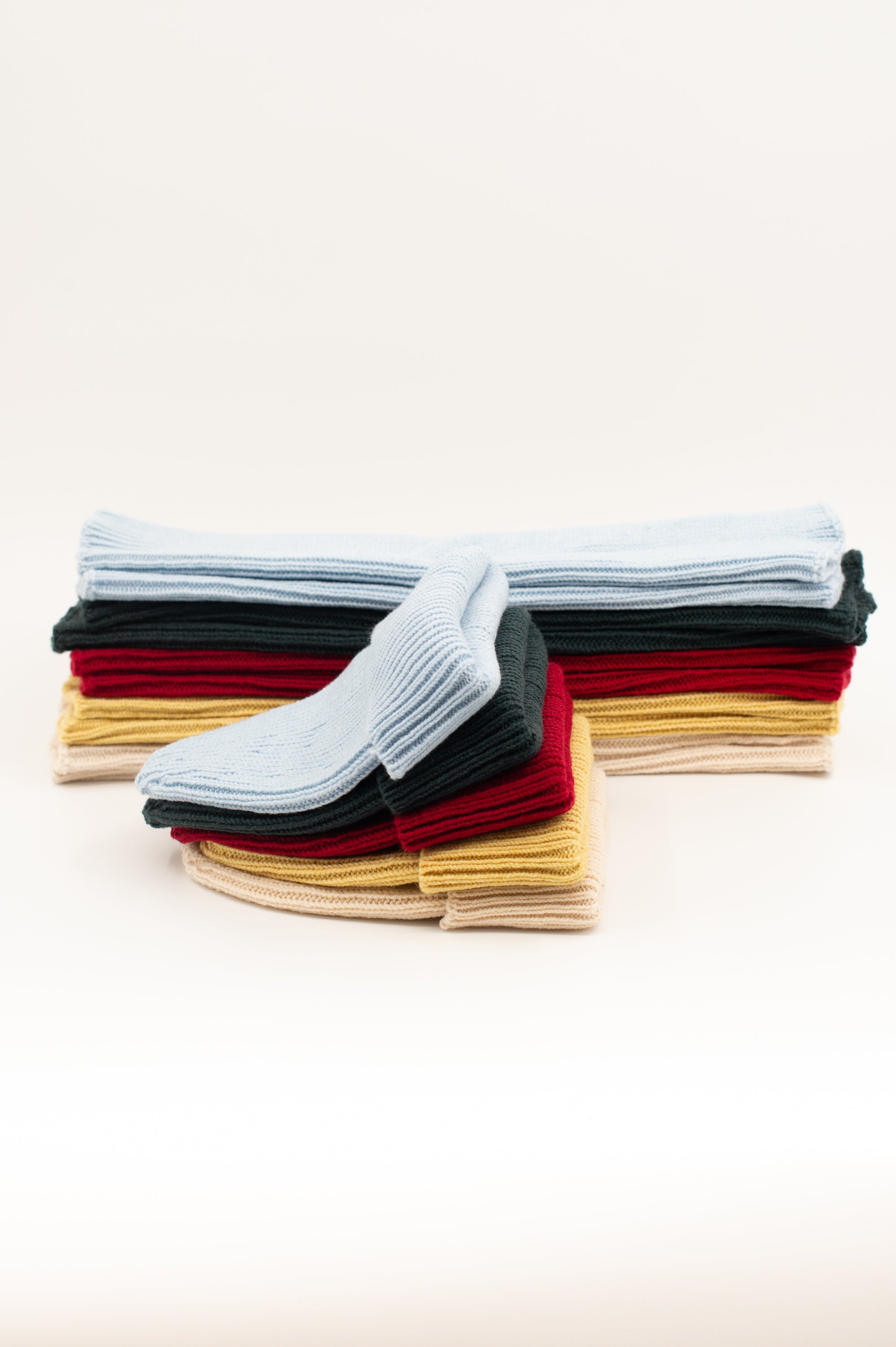Gerippte Mütze mit breitem Umschlag. In Belgien aus einer Merinowollmischung gestrickt, wunderbar warm und doch weich. Tragen Sie es als Set in Kombination mit dem Wales-Schal und den Bein- und Armstulpen Warren.