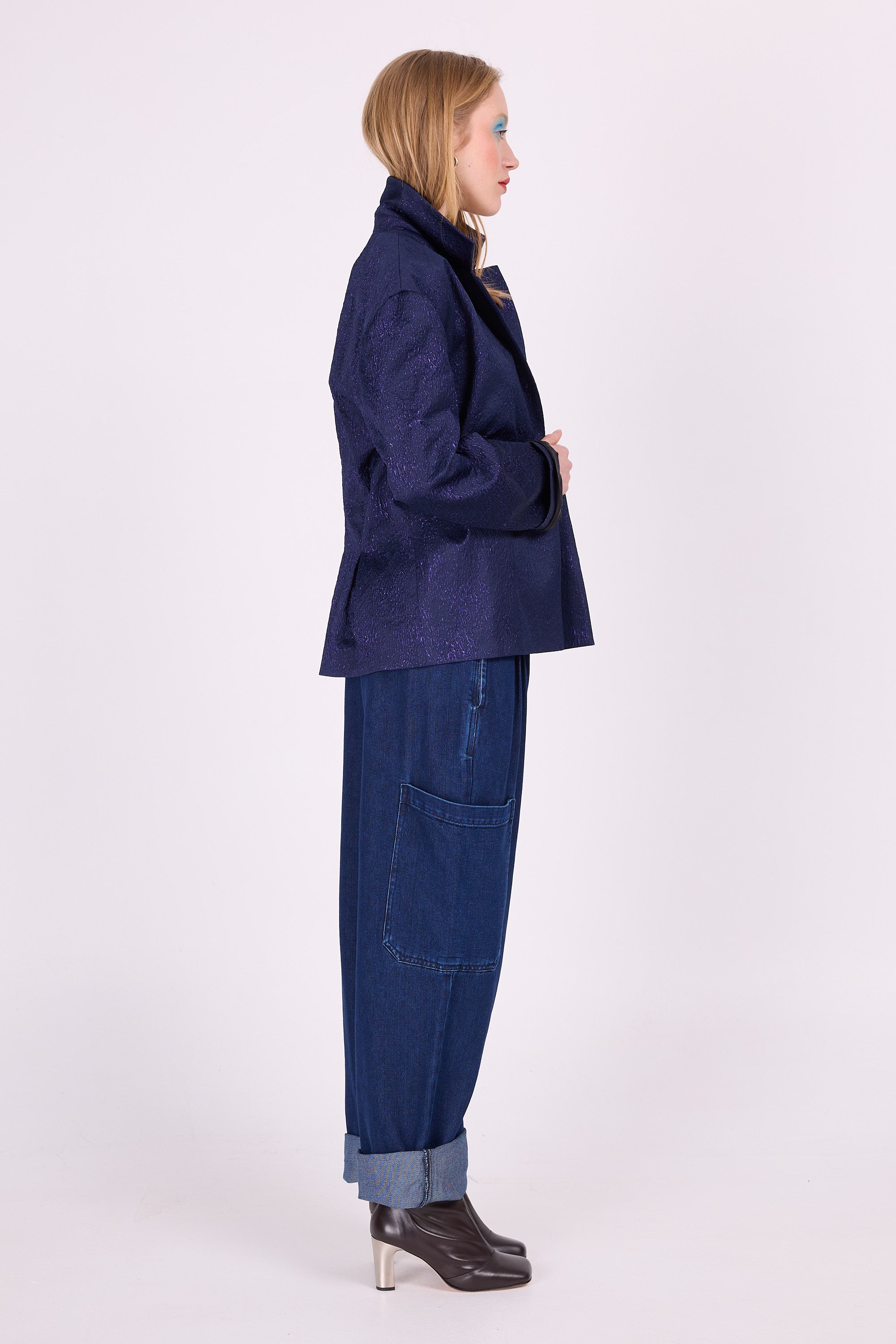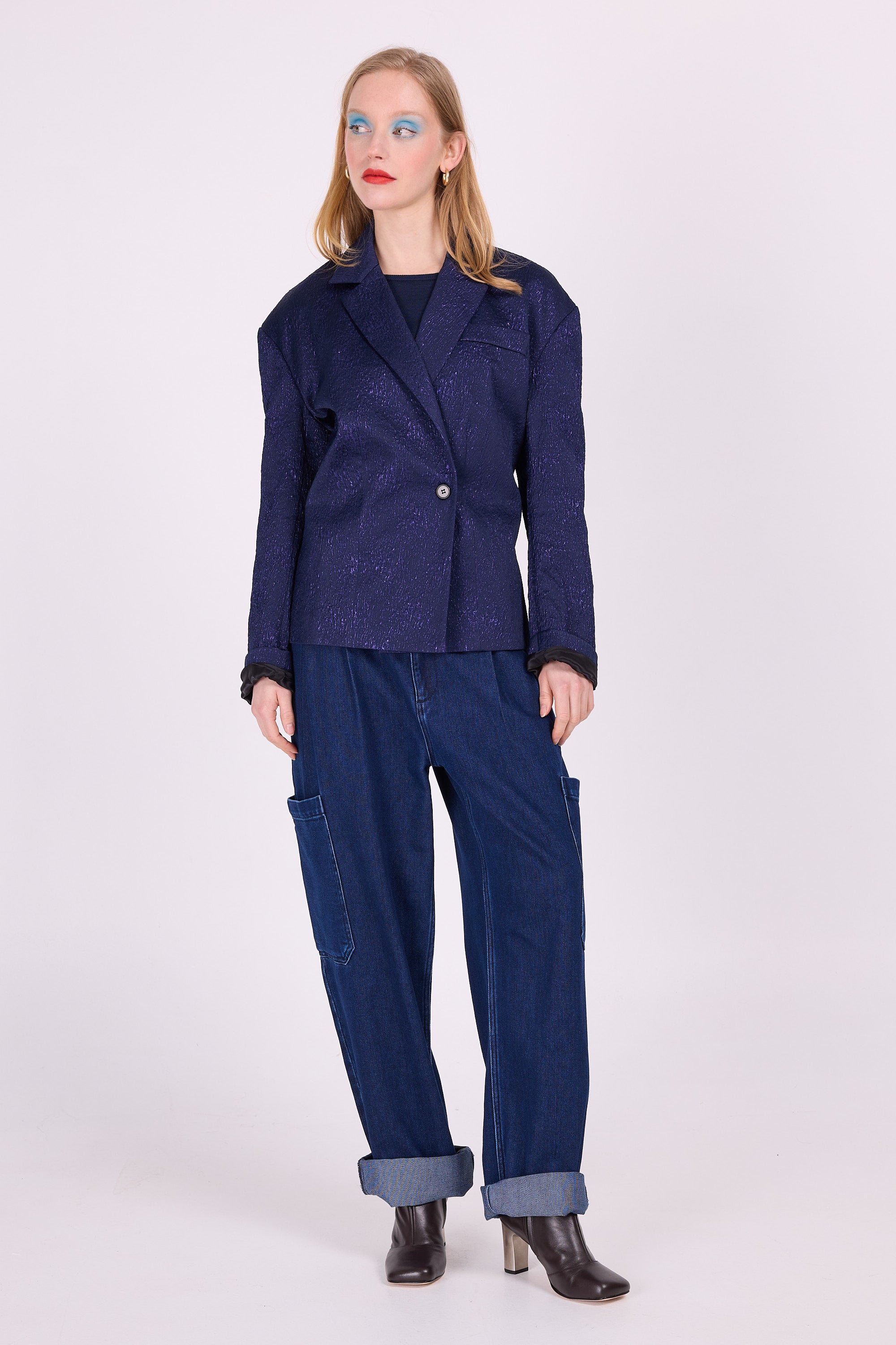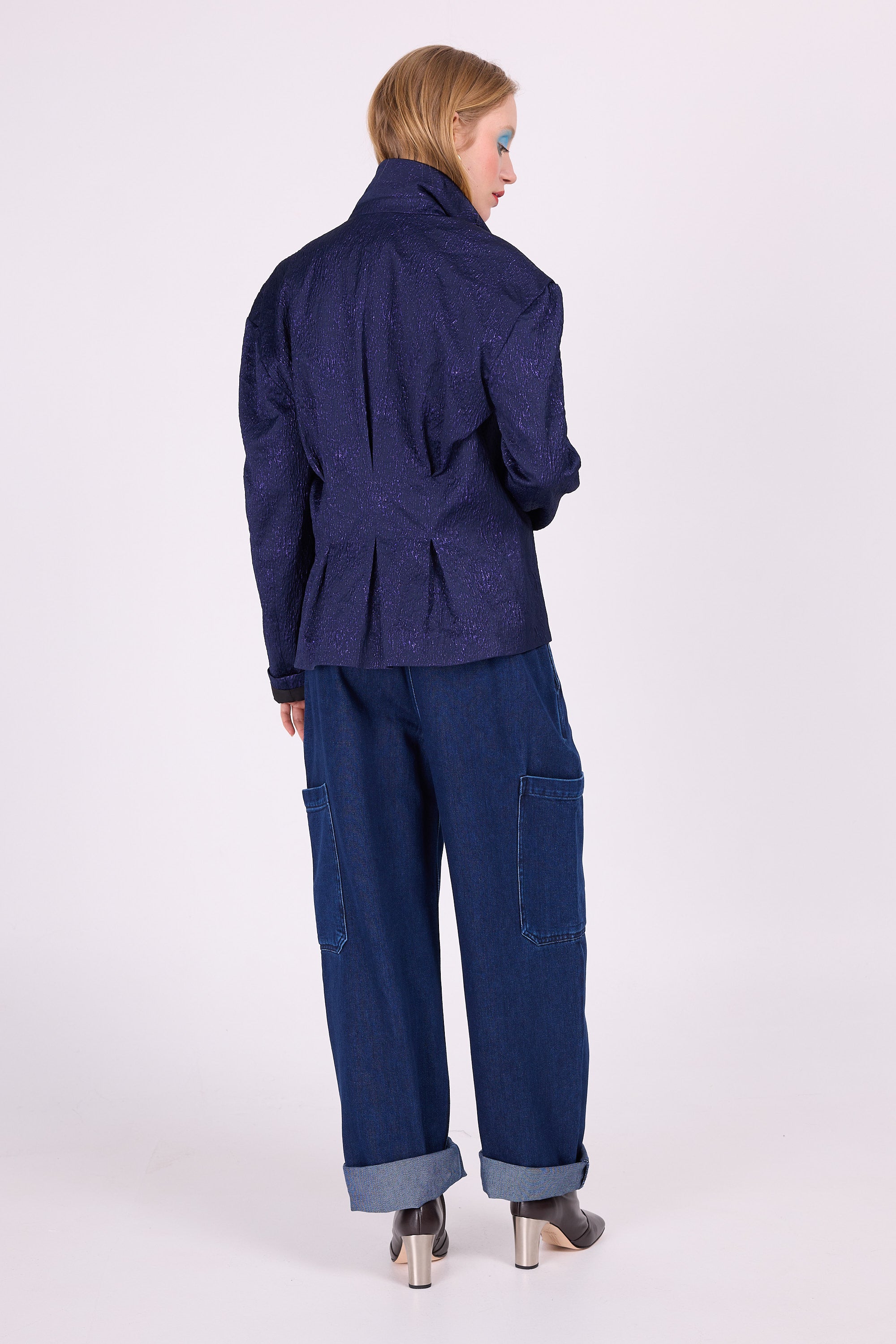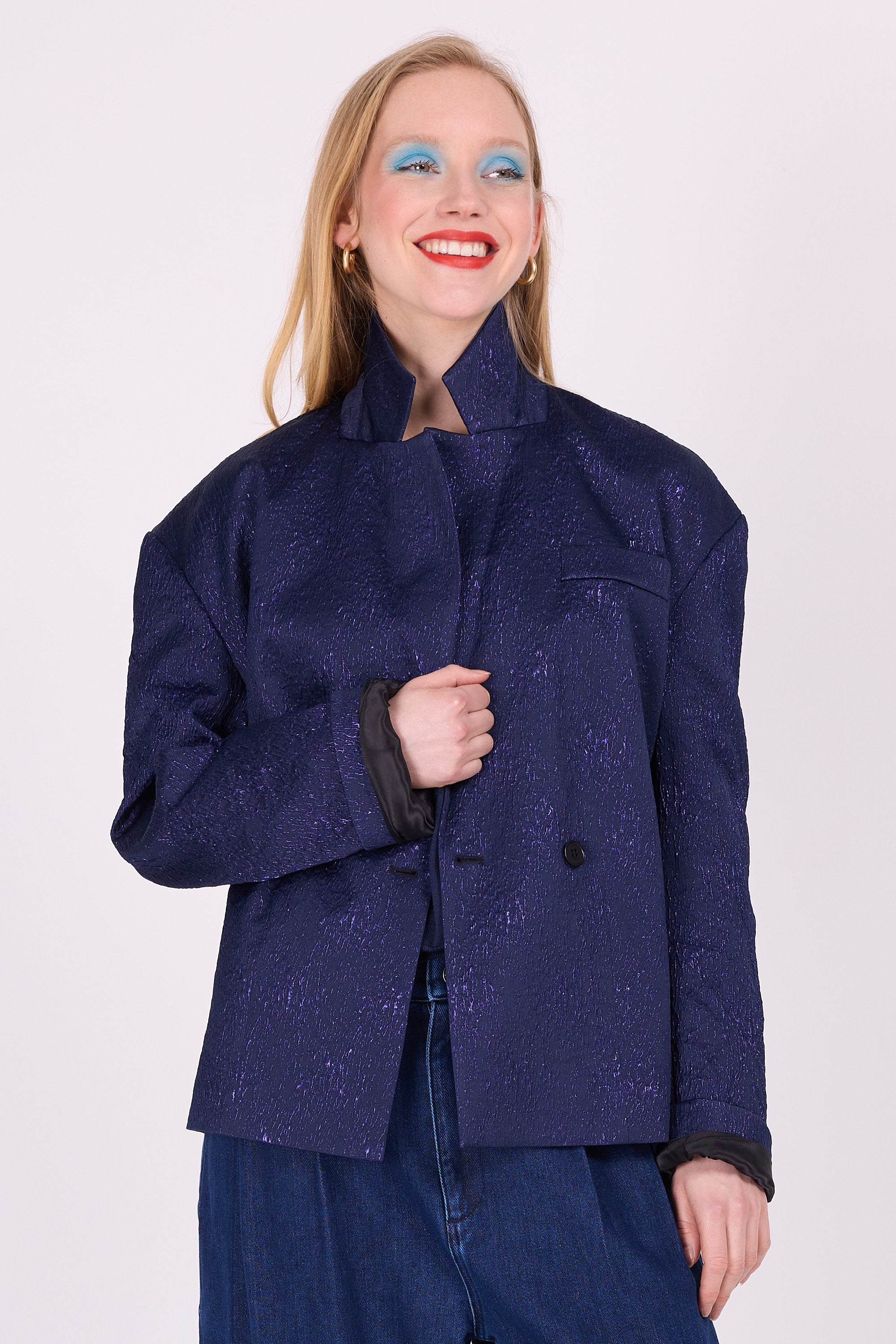 Diego ist ein Blazer, der irgendwo zwischen cool und formell liegt, mit überschnittenen Schultern und einer ausgeprägten Taille durch die Falten im Rücken. Design mit wellenförmiger Struktur im Jacquardgewebe, durchwoben mit einem lila Glitzerfaden, der dezent mit dem Licht spielt.