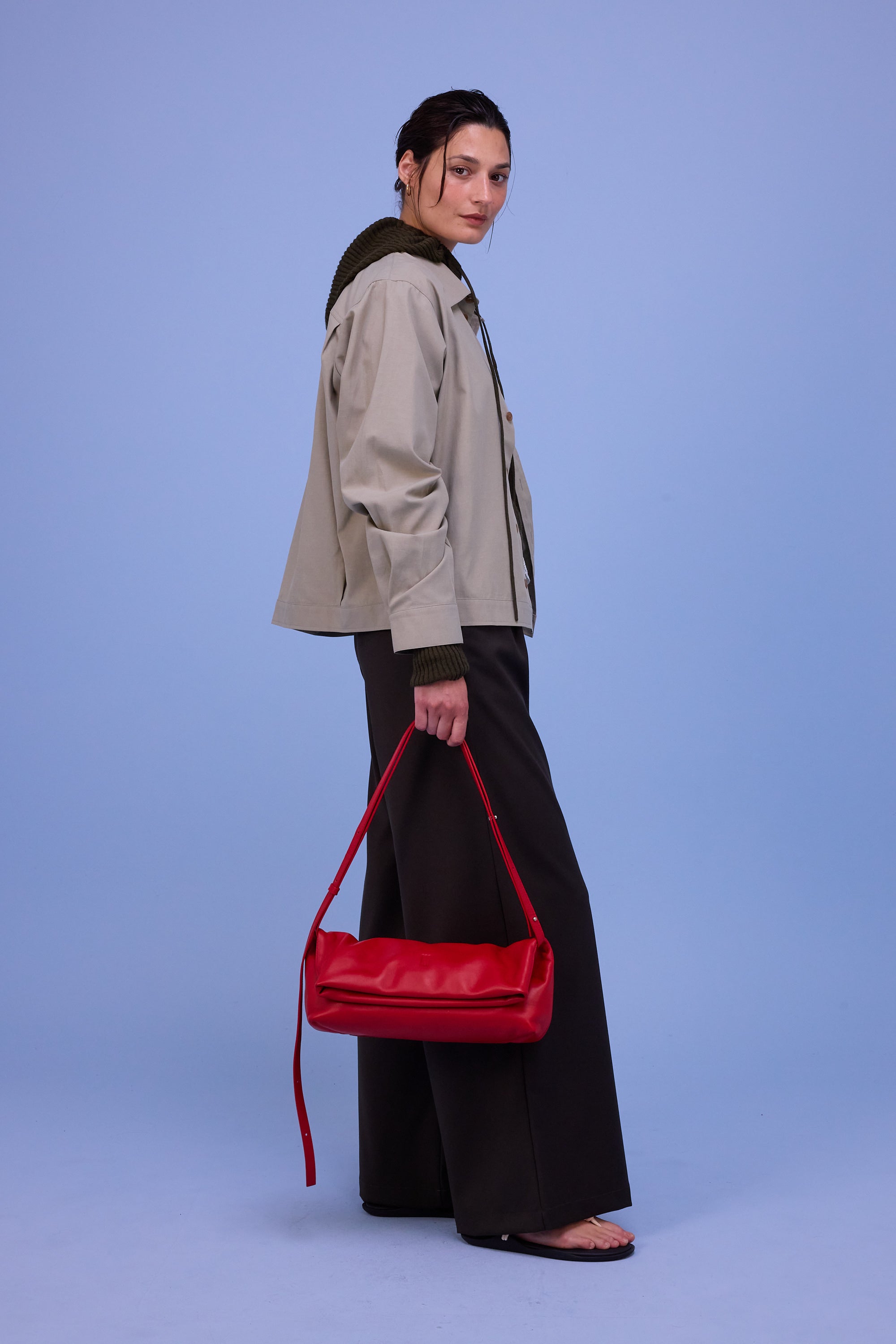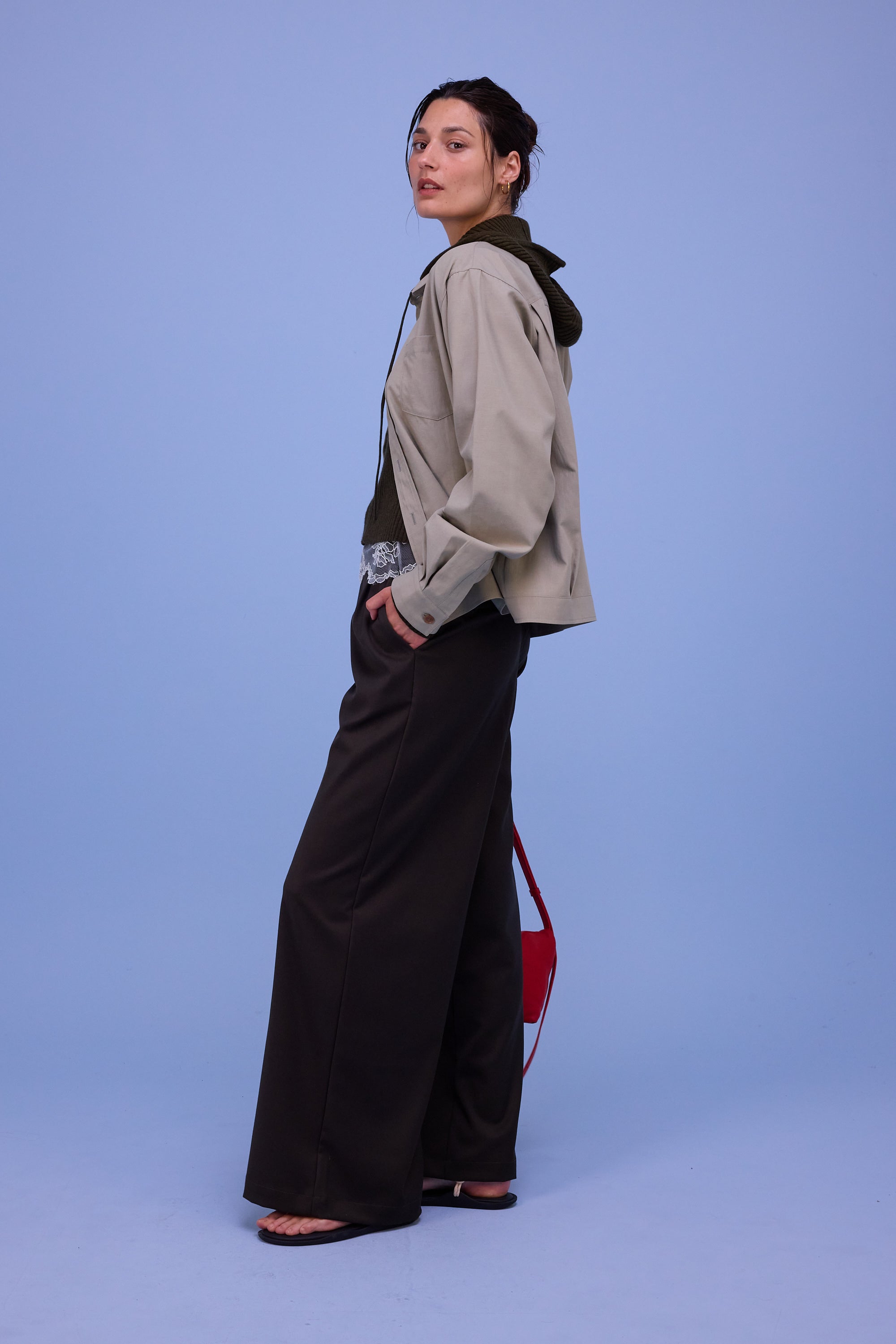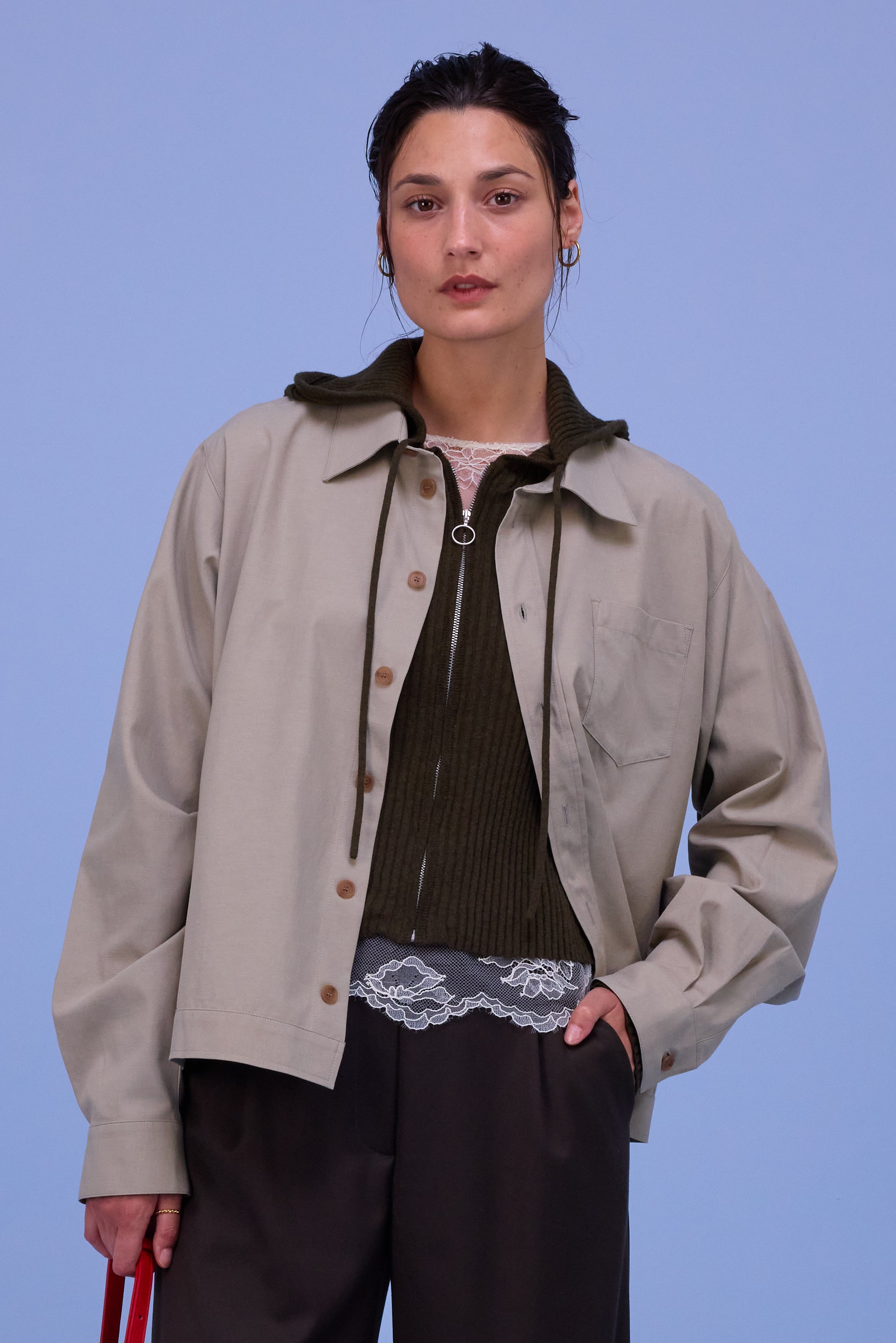 Unisex-Passform. Das weibliche Model trägt Größe 1. Das männliche Model trägt Größe 4. Bequeme Passform. Brusttasche. Leichte Raffung an der horizontalen Rückennaht. Die Ärmel sind weit genug, um etwas darunter zu tragen.