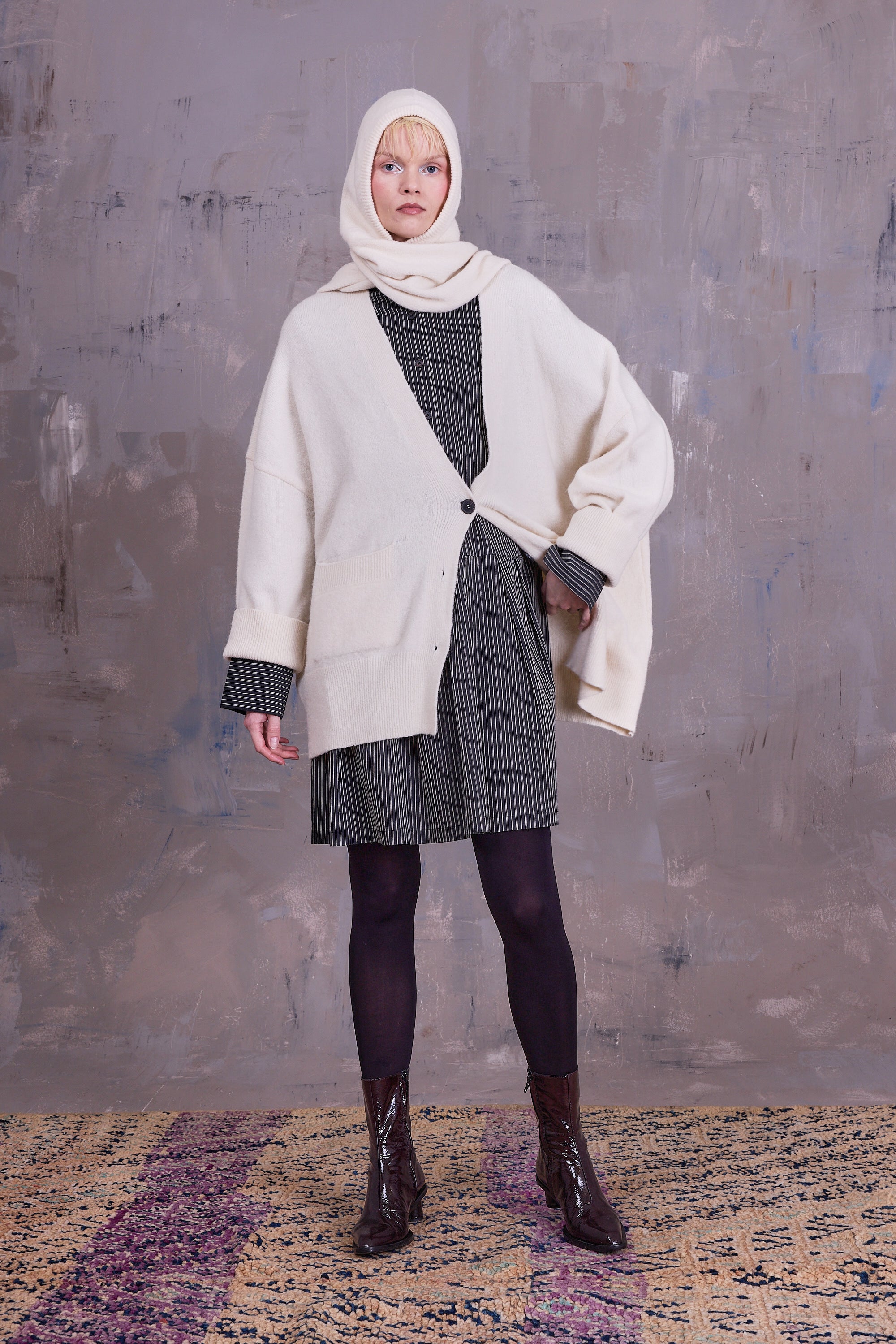 Jeder hat seinen Schal schon einmal bei extremer Kälte über den Kopf gezogen, aber der Schal Gerlynn ist wirklich dafür gemacht, mit einer angenähten Kapuze, damit es auch wirklich stilvoll aussieht. Praktisch und schön! In Belgien gestrickt aus einer Baumwoll-Alpaka-Wollmischung.