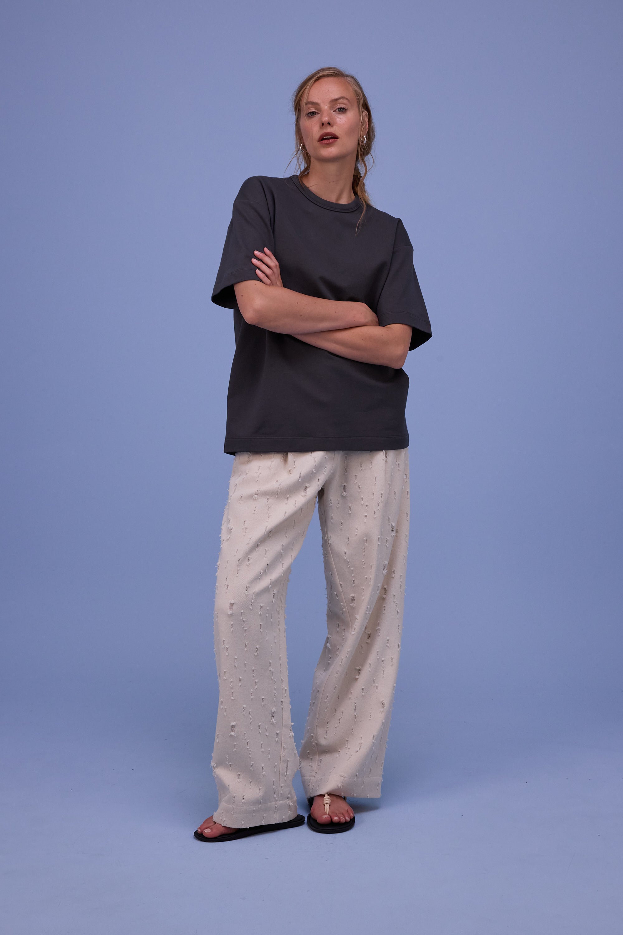 Locker sitzendes T-Shirt mit überschnittenen Schultern aus meliertem Jersey, das dem T-Shirt ein gewisses Gewicht verleiht, aber auch den Komfort einer Stretchqualität bietet.