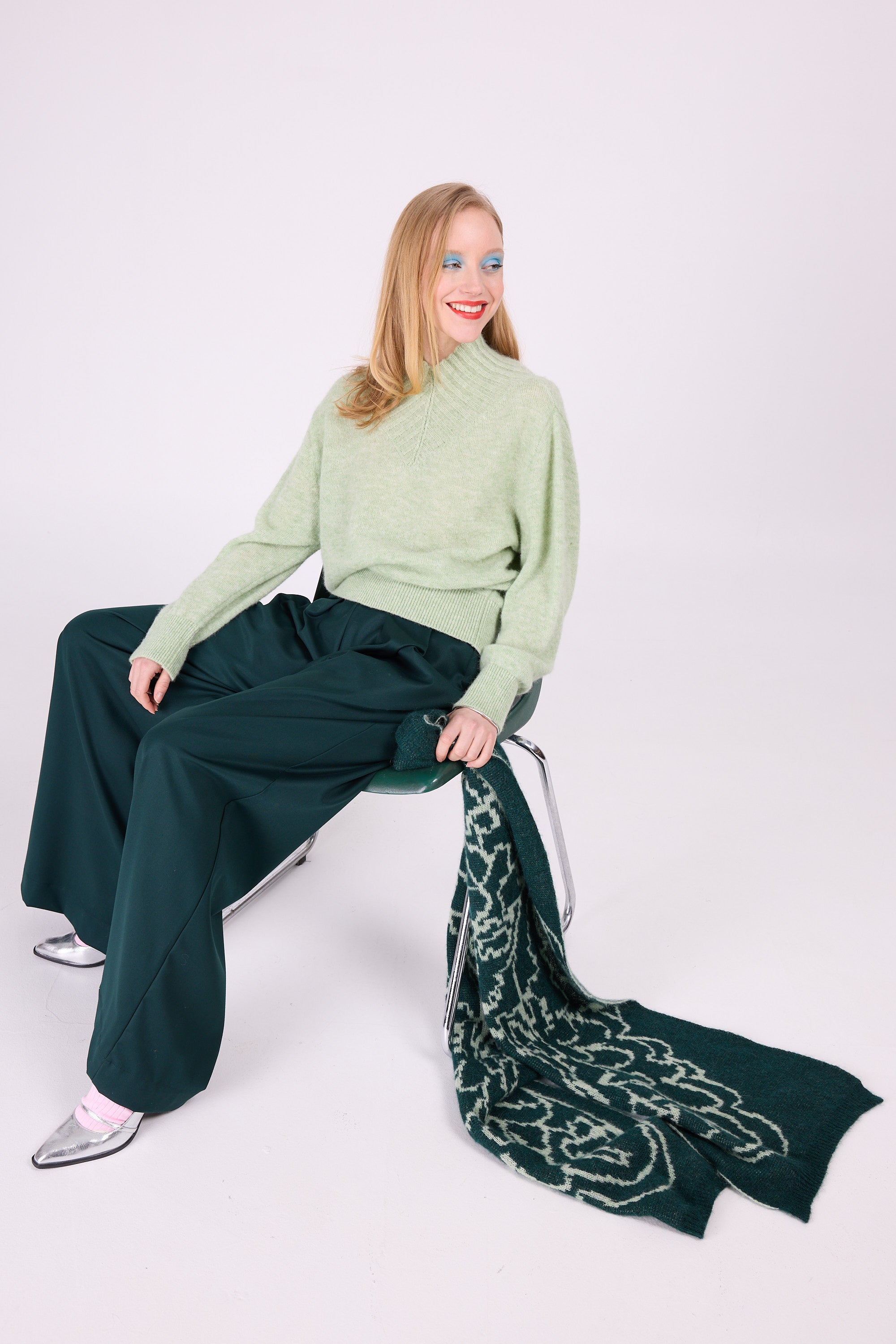 Voluminöse Hose aus anschmiegsamem Stoff, der ihr fast den Look einer Culotte verleiht. Die breiten Gürtelschlaufen bilden mit den Bügelfalten am Bein eine Linie. Kombinieren Sie es mit dem Camille-Top aus demselben Stoff mit dezentem Glanz für einen monochromen „Totallook“.