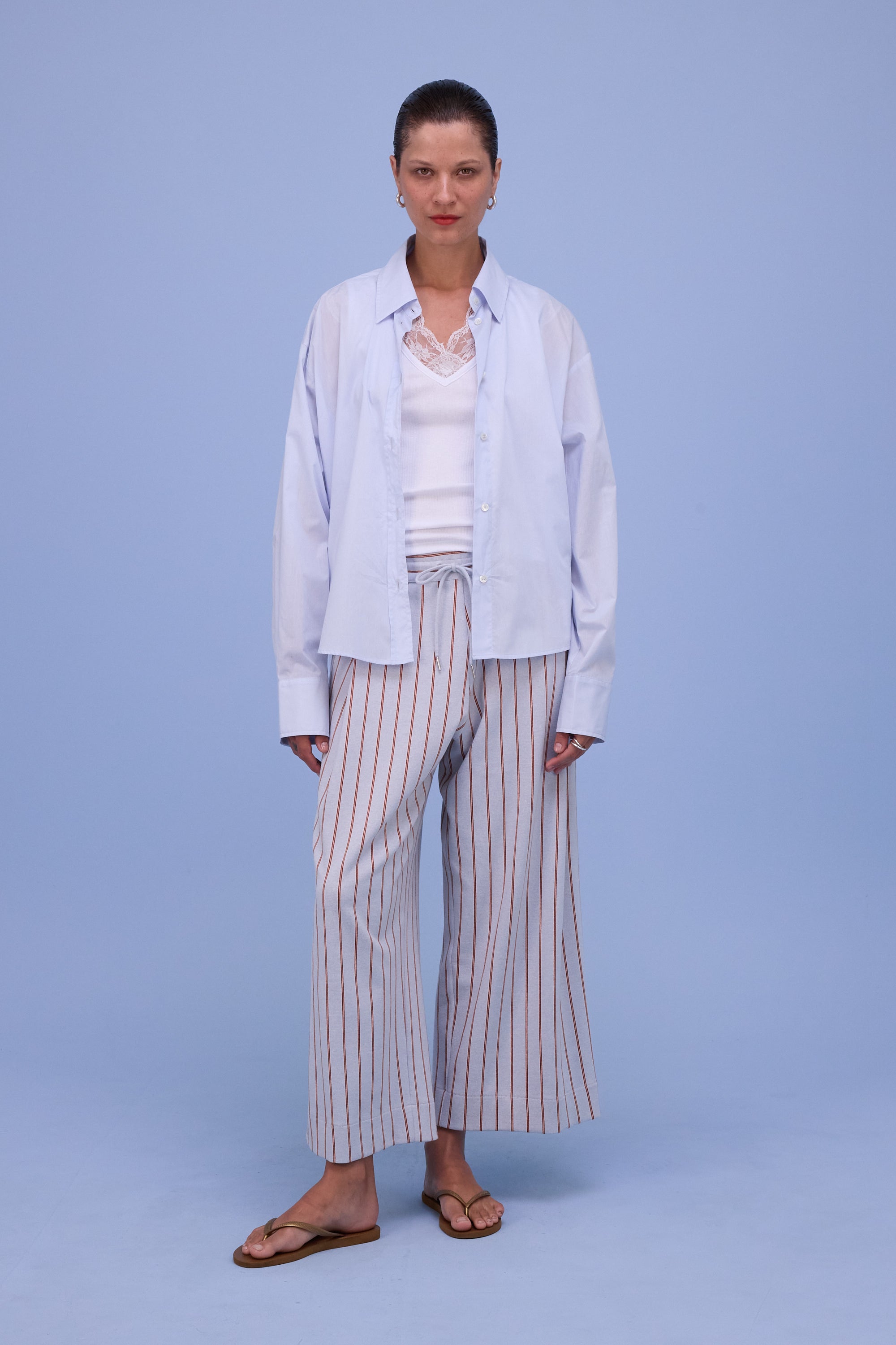 Helier ist die kürzere Variante der Hose Geano: Die verspielte Culotte-Länge sorgt sofort für ein sommerliches Gefühl. Diese bequeme Hose hat außerdem einen breiten elastischen Bund, ein Zugband und eine subtile Bundfalte. Ausführung in gestreiftem Jacquard-Jersey: ein hellblauer Hintergrund mit feinen, doppelten, vertikalen roten Streifen.