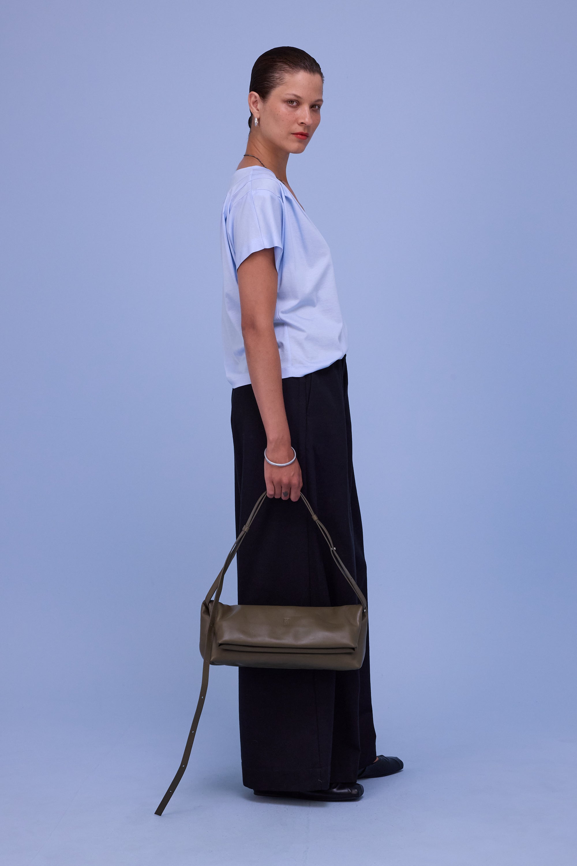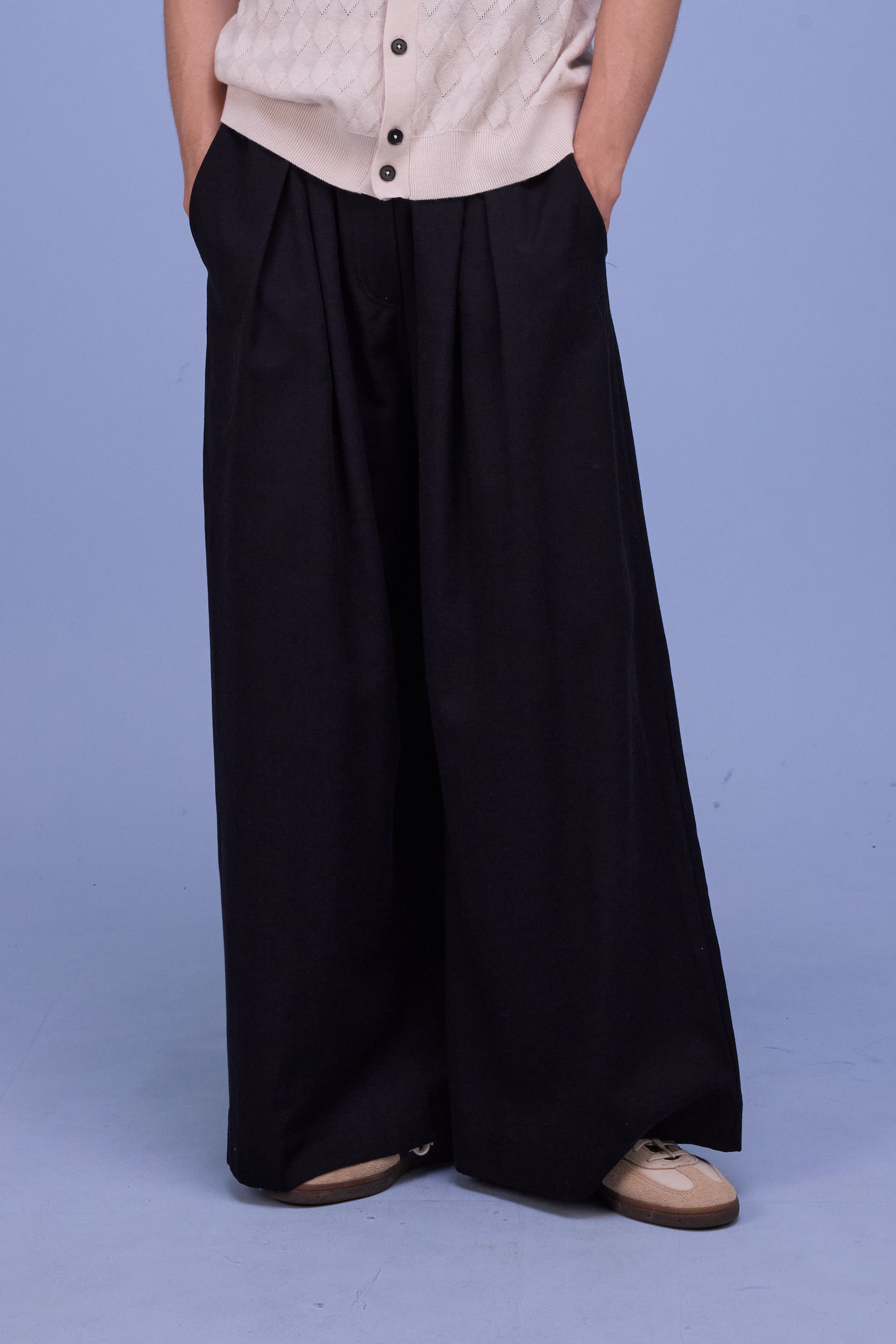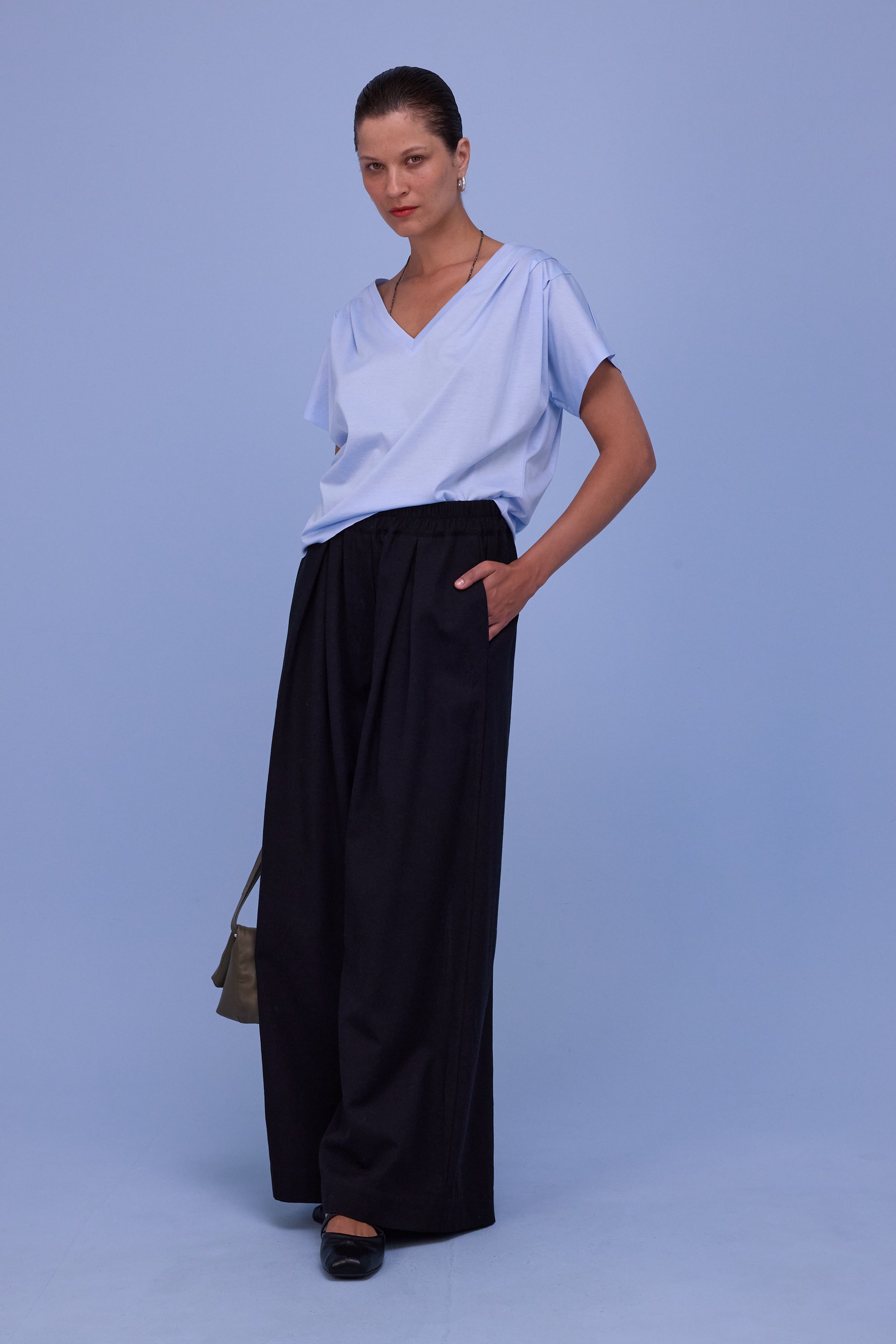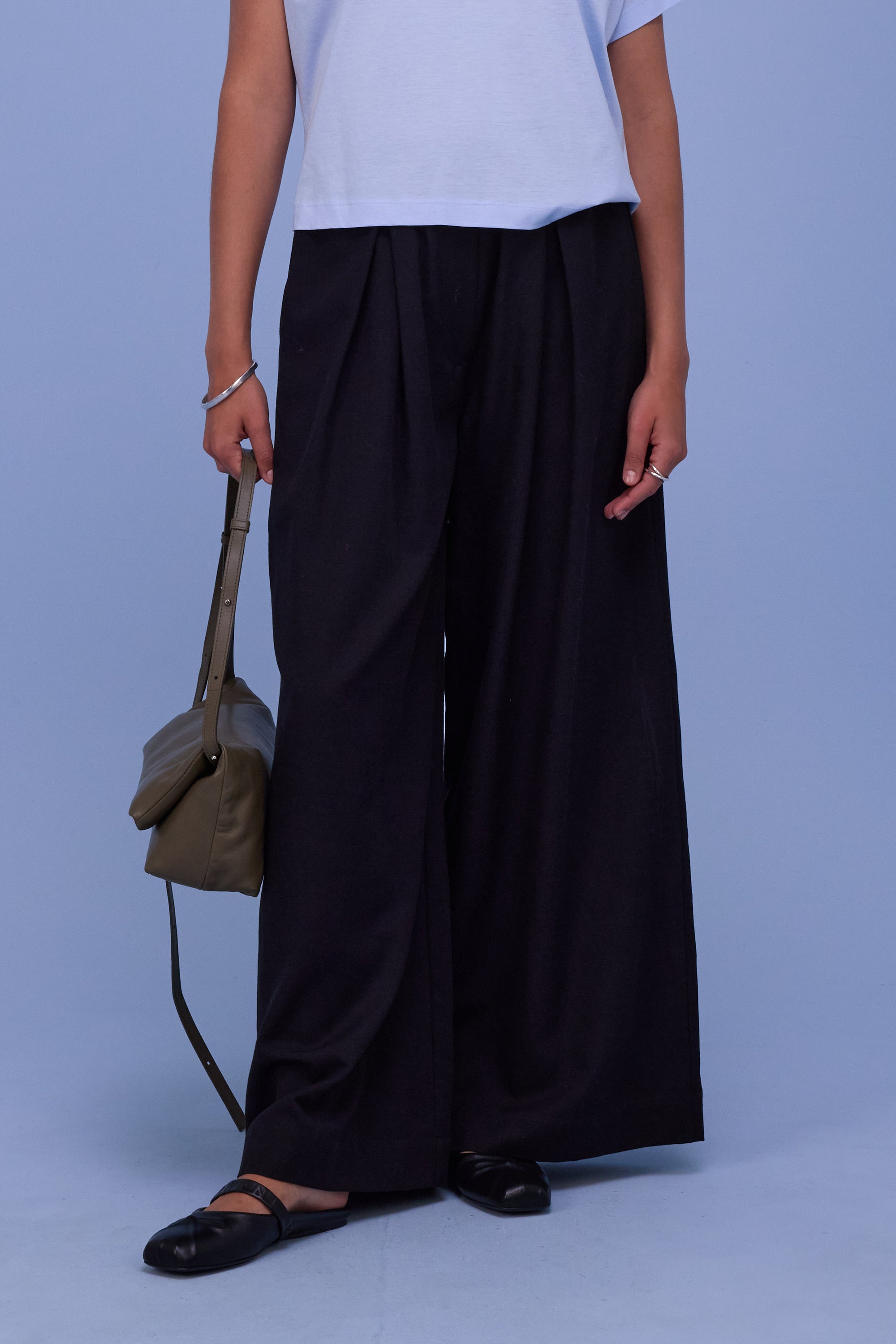 Schmale Taille mit elastischem Bund, Raffung und Falten, Eingrifftaschen, weites Beinvolumen.