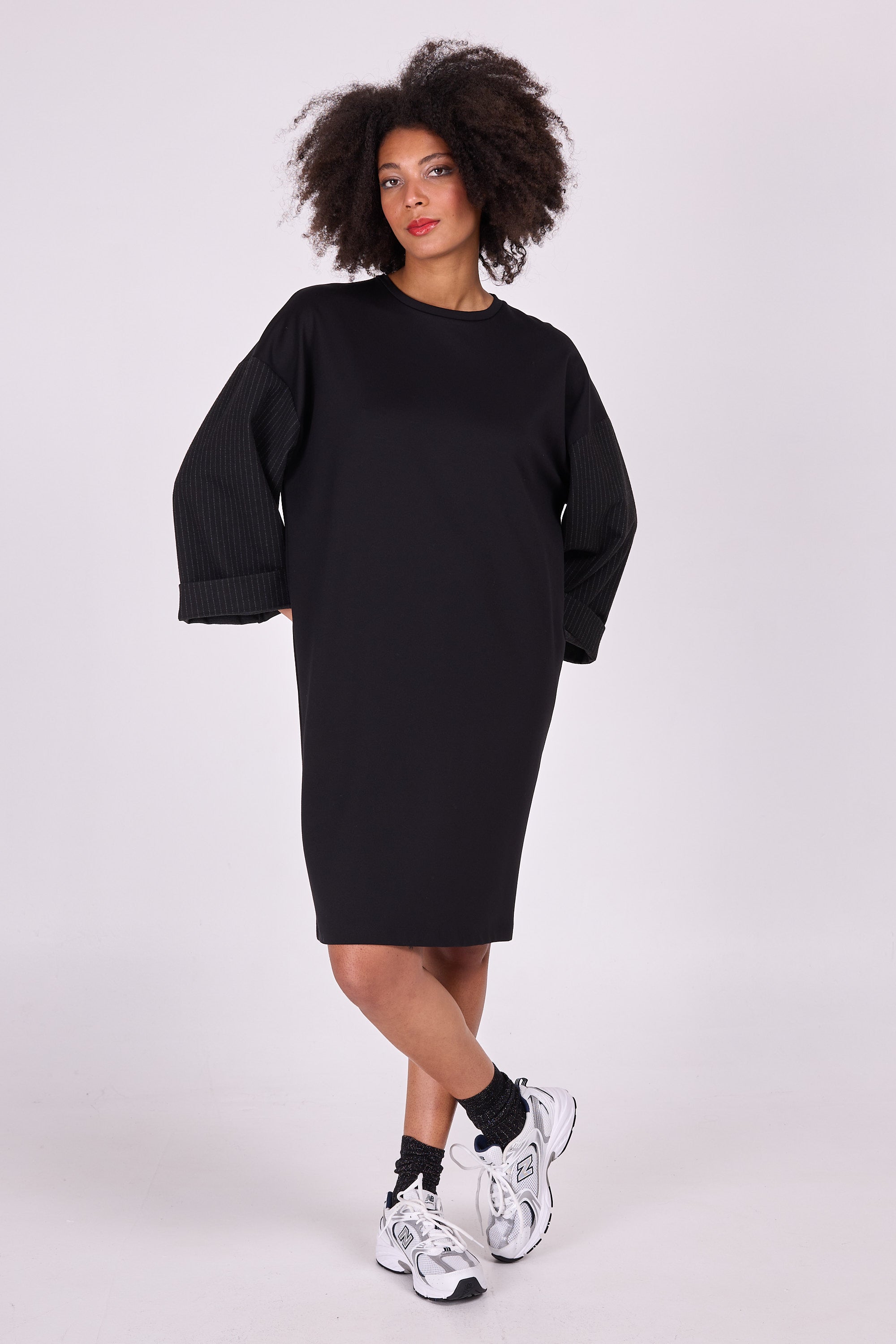 Elona schwarzes Kleid mit Nadelstreifenärmeln