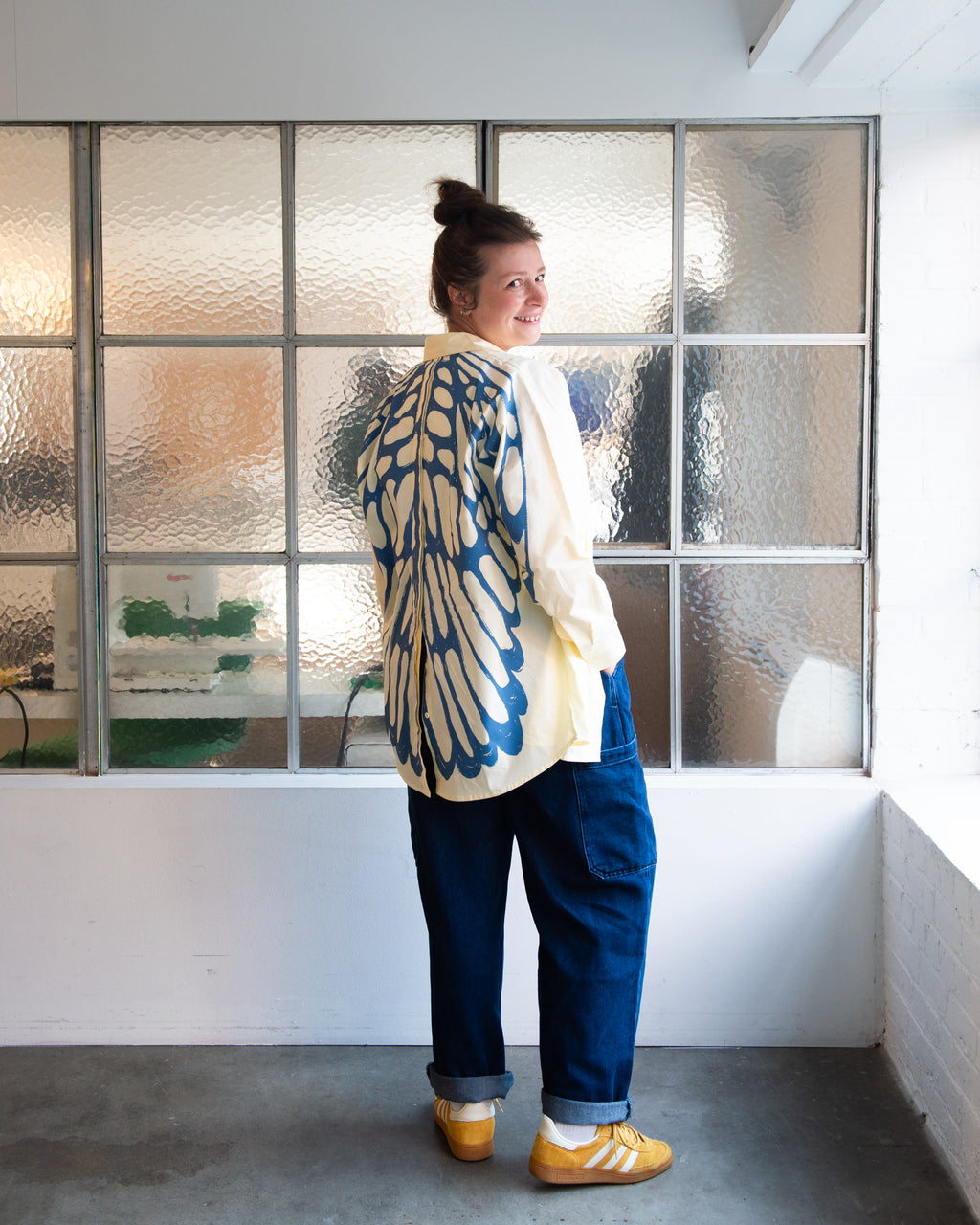 She already has a lot of denim pieces in her closet and therefore chose these atypical cargo pants . She thinks the Emmelie shirt is a real eye-catcher, but because the print is on the back, it is not a piece that you will quickly get tired of. In the winter she will wear a thin sweater underneath or a very thick oversized one on top. She likes to wear her outfits loose and chose her usual size L.