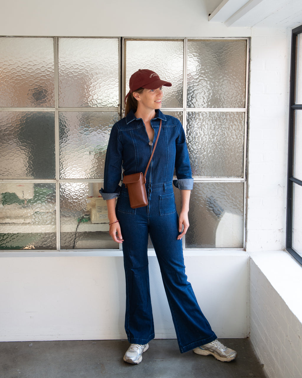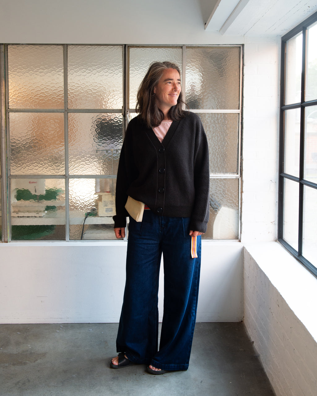 She combines the Ernesto denim pants with the knitted Majuro cardigan that came in handy during her morning bike ride to work. For the pants she chose her usual size S, the cardigan she chose in size XL for a relaxed oversized feel.
