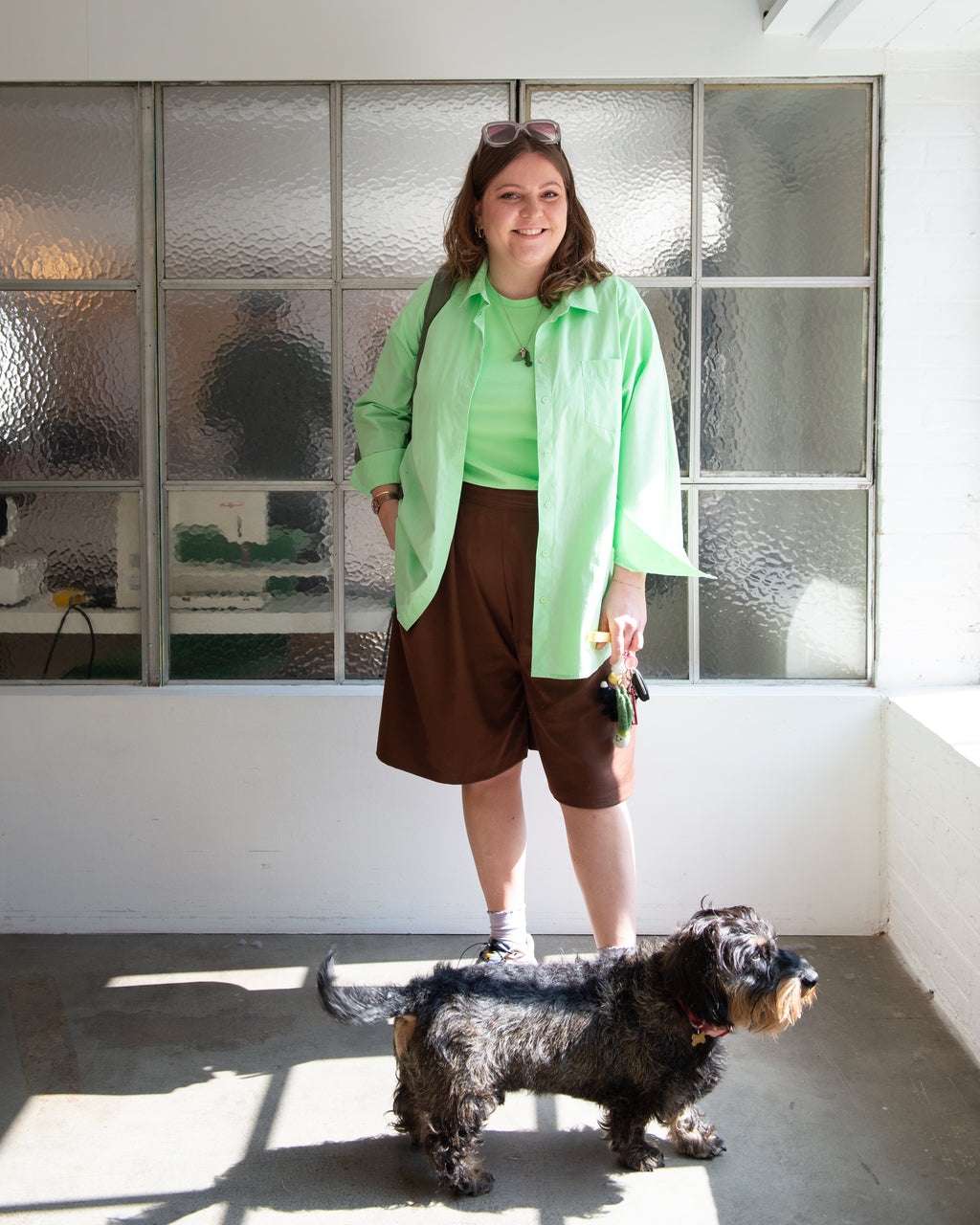 The colleagues always know that Felix is coming when they see her dog Oscar appear. This little 'happiness manager' is excited to come to the office every day. Felix combines the popular Eddie Bermuda shorts with the Emmelie shirt for which she designed the arm-to-arm print herself and wears both pieces in XXL.