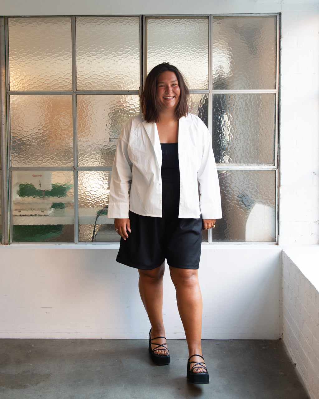 She wears the Davos blazer in size L for an oversized look, Esther shirt and Eddie bermuda shorts in size M.