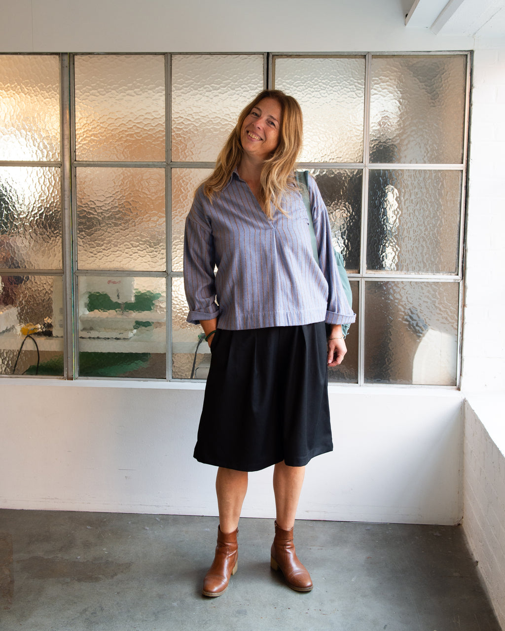 Aline was the first of all colleagues to choose the Bermuda (in two colours) and thus became a real trendsetter. She chose neutral black and combined it with striped shirt Daan, both in size S.