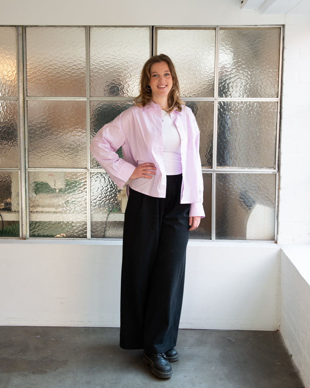 Elisabeth loves timeless looks and this season she chose the pinstripe Egbert trousers in combination with the shirt Esther . She chose both pieces in her usual size S. When it gets colder, she adds a woolly sweater as an extra layer.