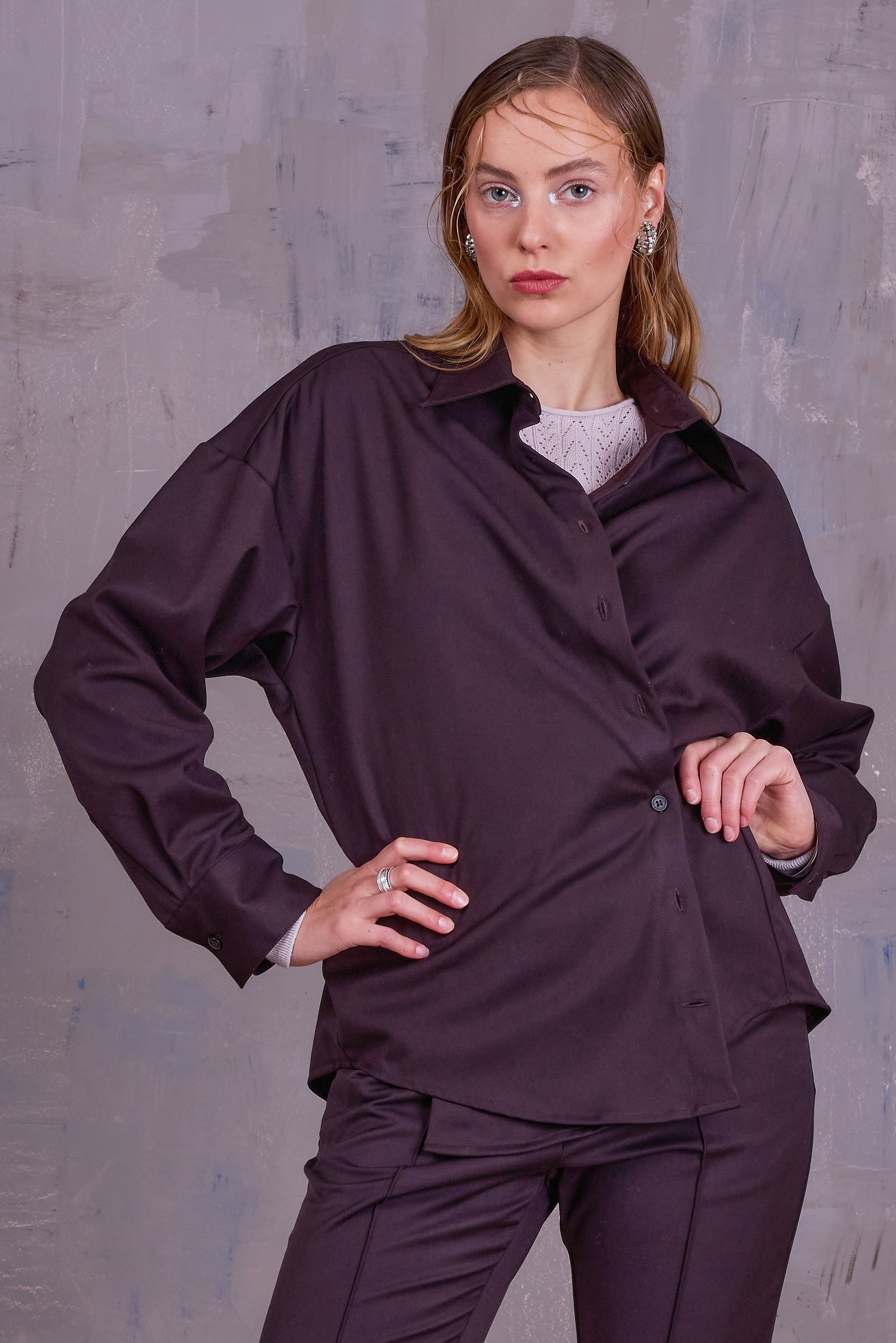 You have those days when you don't feel like wearing a formal blazer, but still want to add some power to your outfit. On such a day, Gia is your partner in crime. This surprising blouse is asymmetrically knotted and atypically elegant. The back is centered and the design is made in a twill fabric that is heavier than a usual blouse fabric. You can perfectly combine Gia with trousers in the same fabric for a full look.