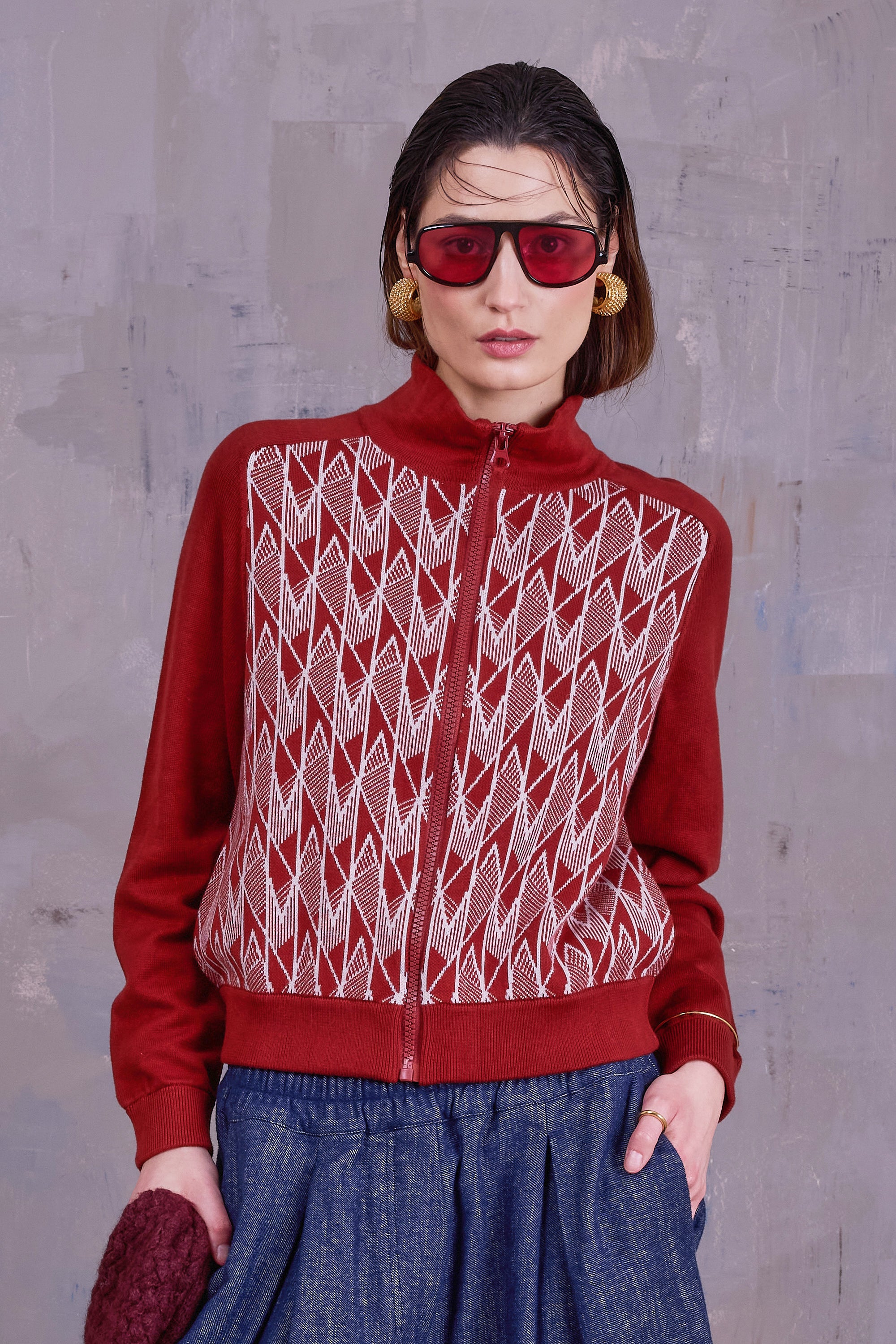 Cotton knitted cardigan with retro sportswear flair. The high stand-up collar and the graphic pattern define the look. A real eye-catcher in the collection.