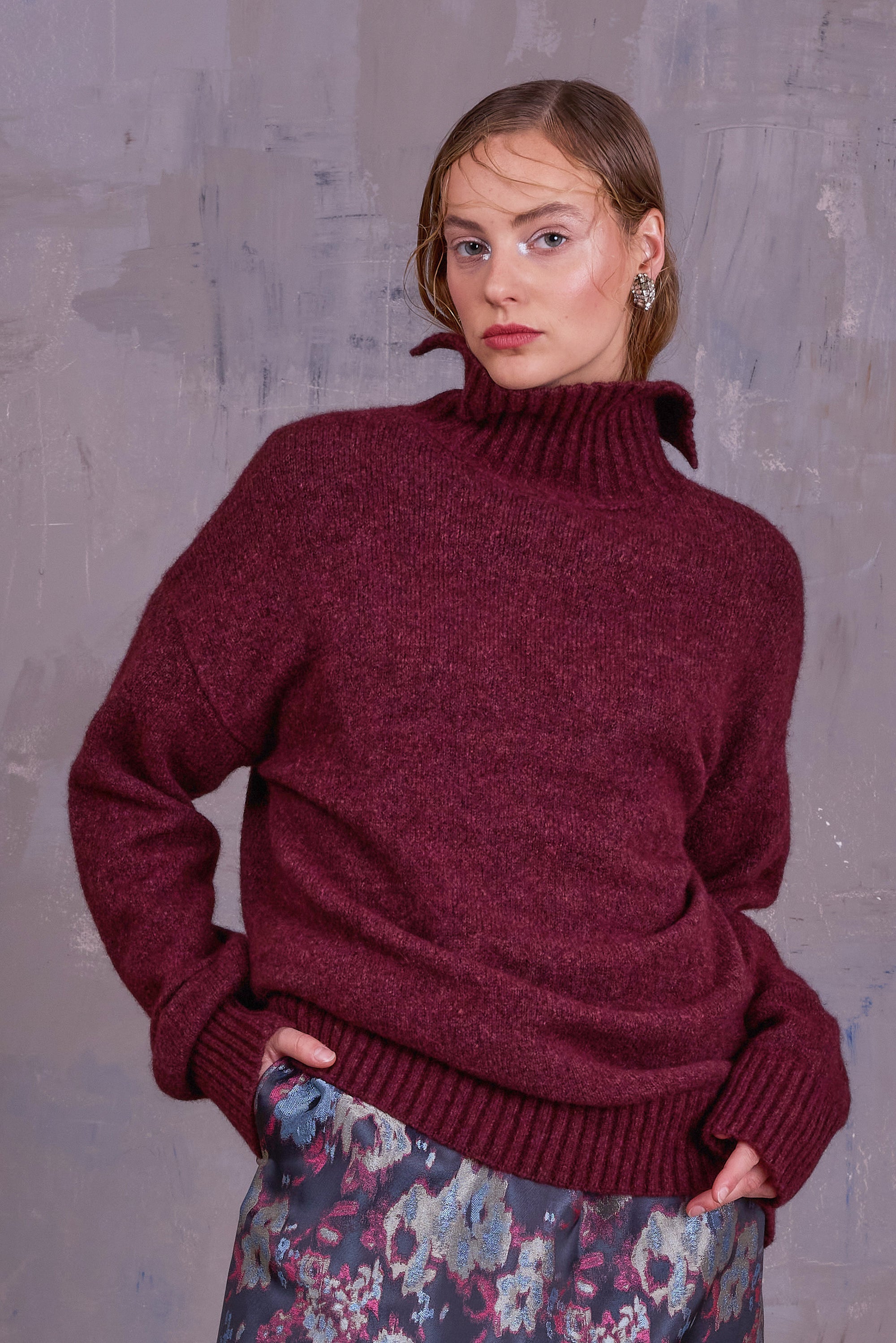 Oversized turtleneck sweater with split detail in the back of the collar. The extra-long body makes it an ideal piece to pair with the Etienne leggings or slim trousers. Knitted in Belgium in a cotton-alpaca wool blend.