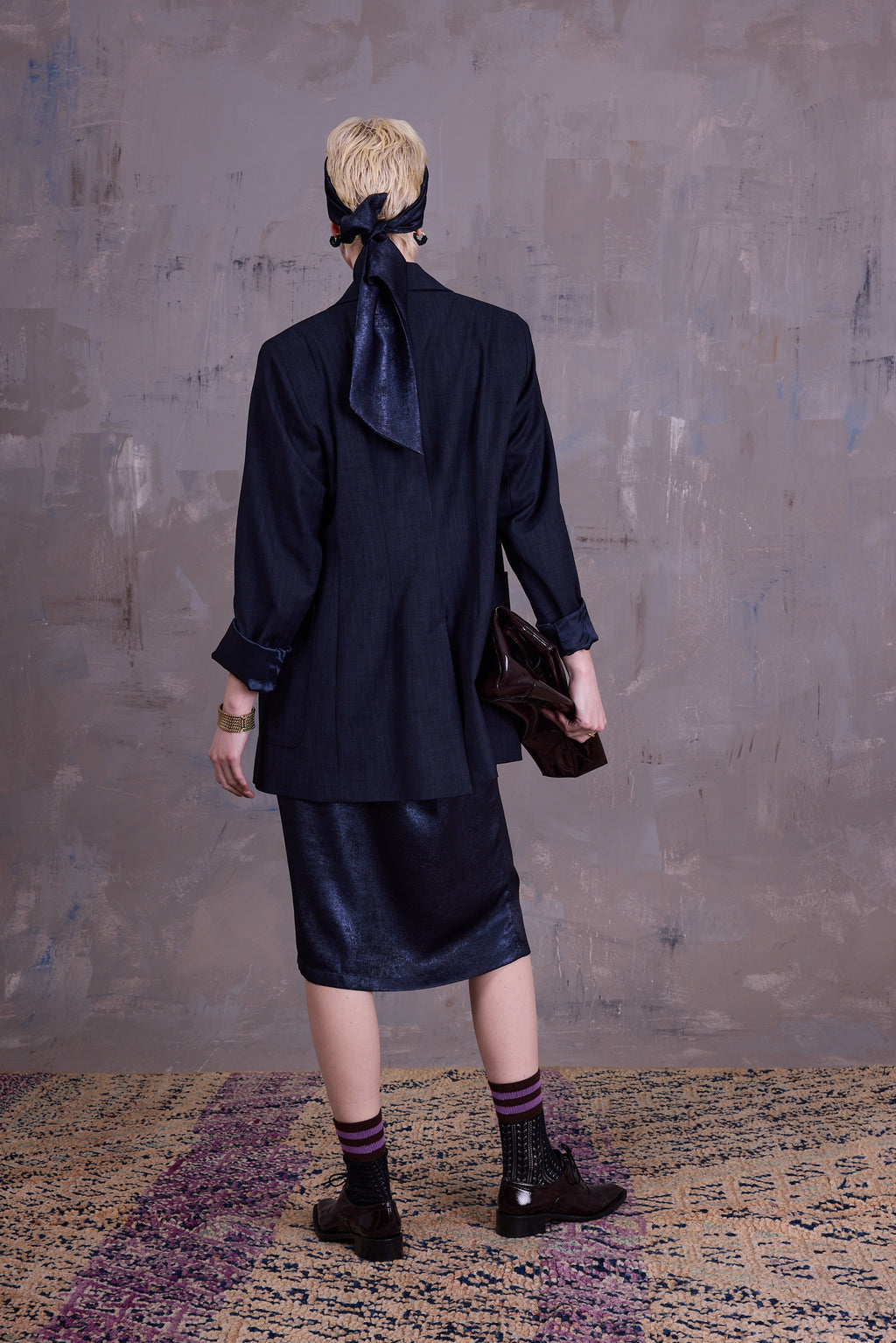 Versatile scarf in flowing, shiny fabric. The scarf is long enough to use as a tie or to knot on your head. The logo is embroidered tone-on-tone. This accessory makes every outfit just that little bit dressier.