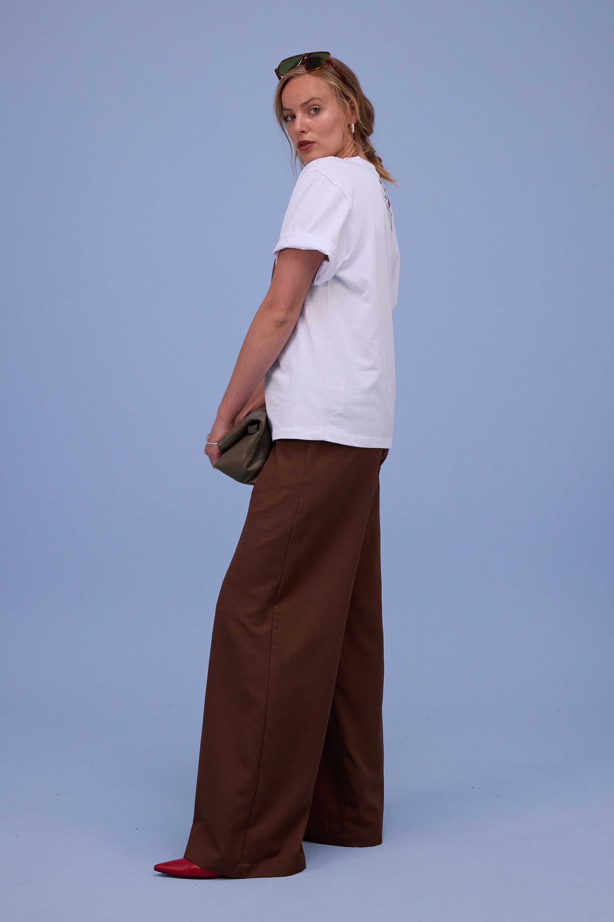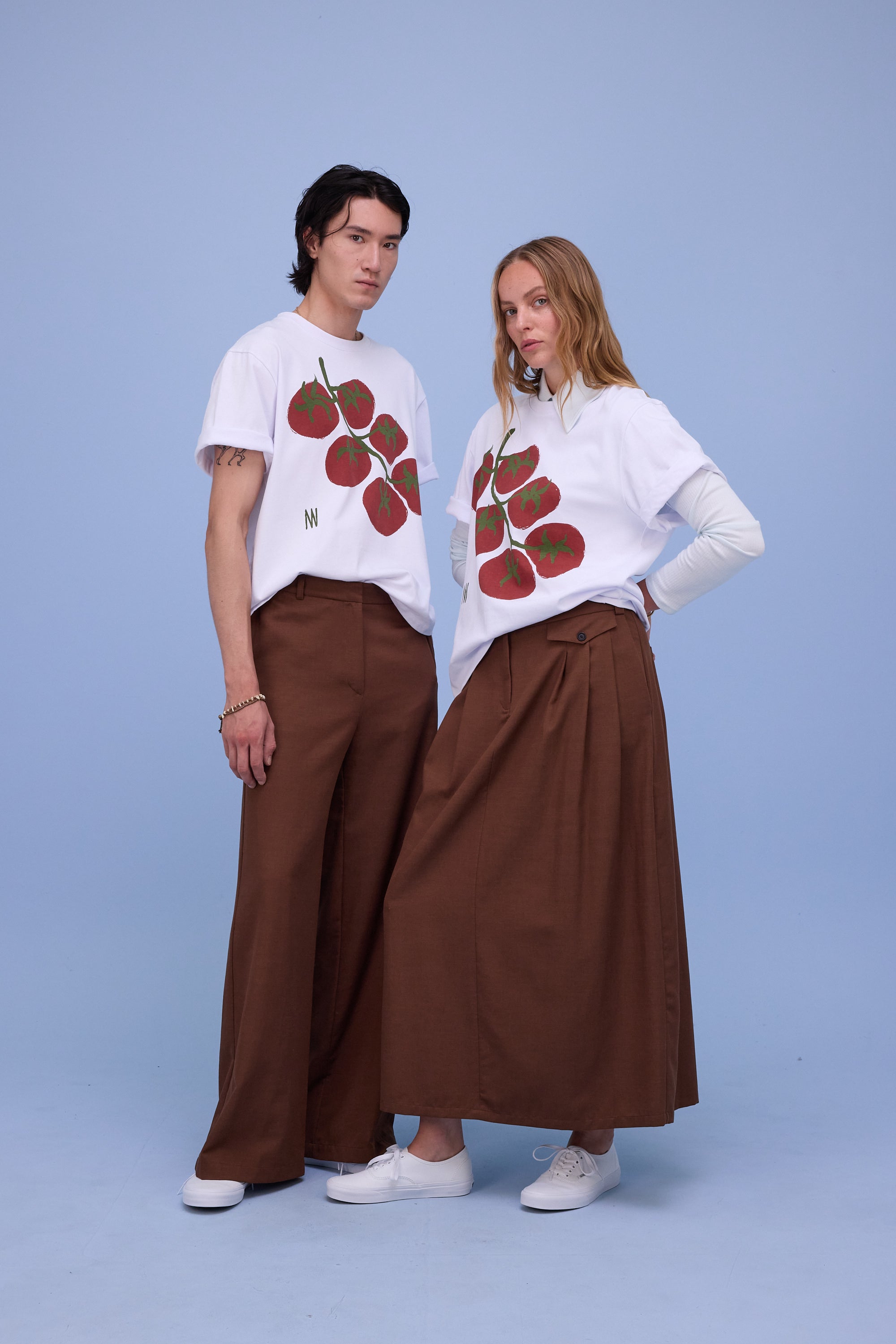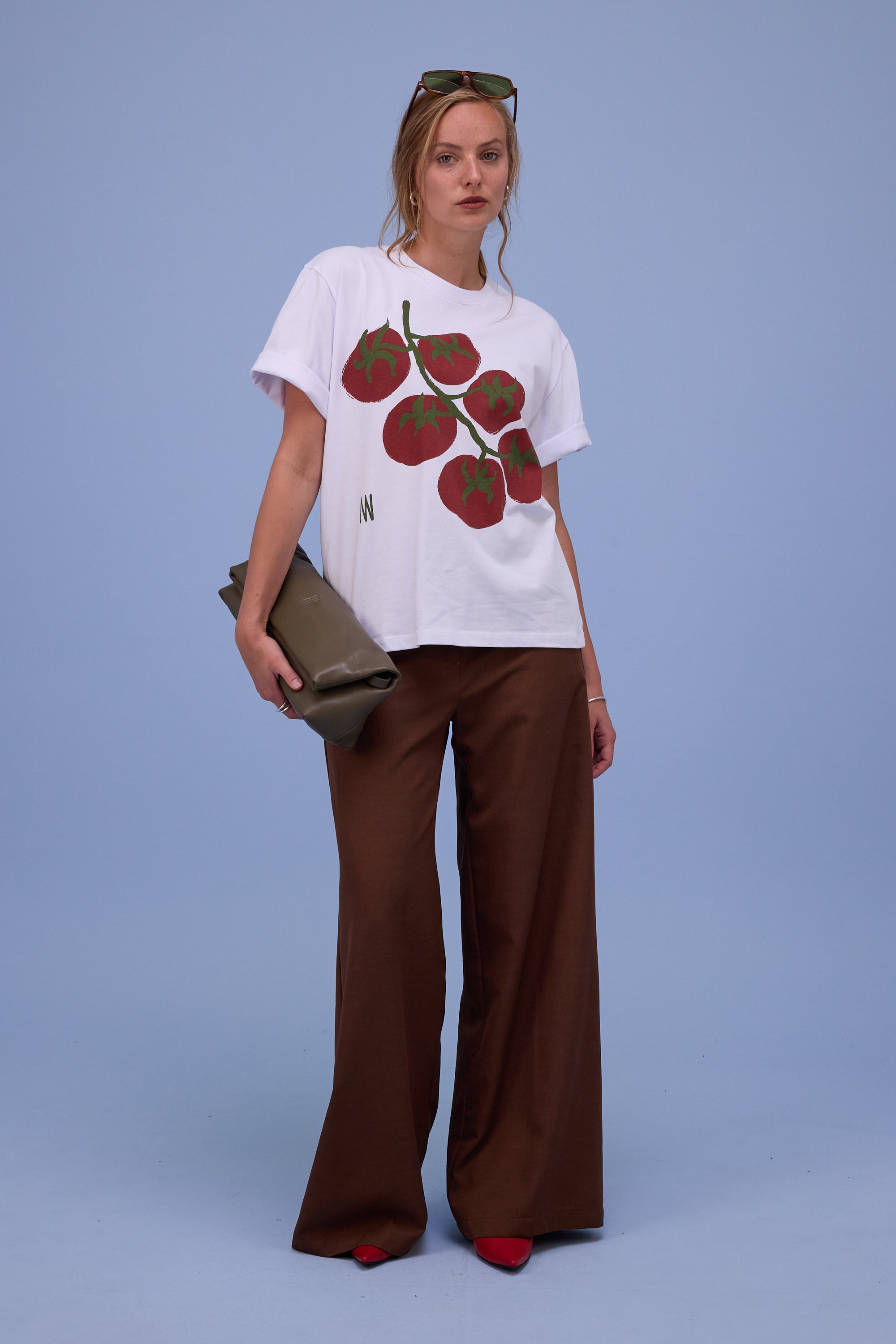 Unisex boxy T-shirt in heavy cotton jersey. Print with hand-drawn tomatoes, in the theme of the 'Tu es mon coeur de boeuf' Spring-Summer '26 collection. On the back there is a small tomato drawing and logo.