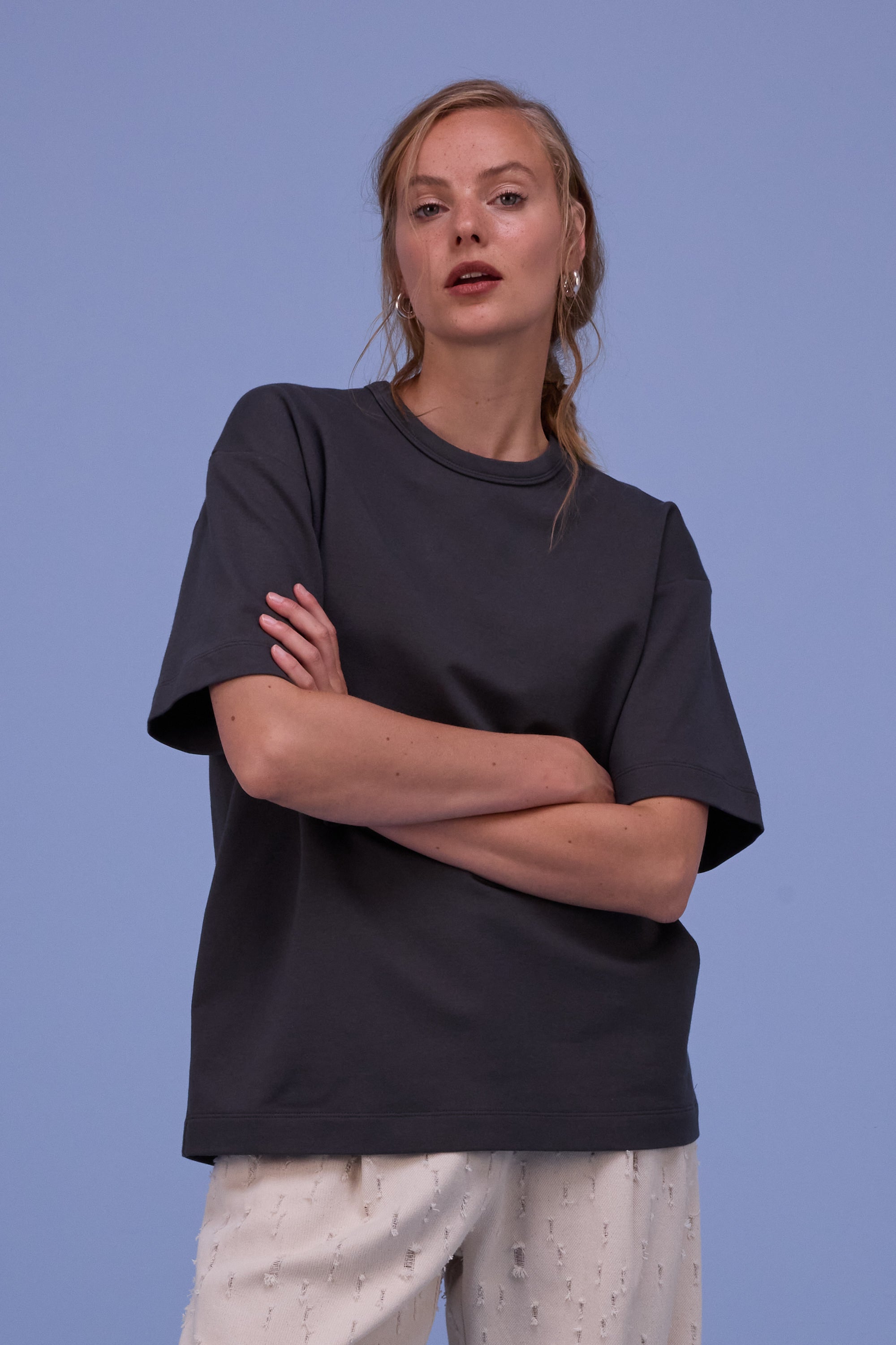 Loose-fitting T-shirt with dropped shoulders in brushed jersey, giving the T-shirt a certain weight while also providing the comfort of a stretch quality.