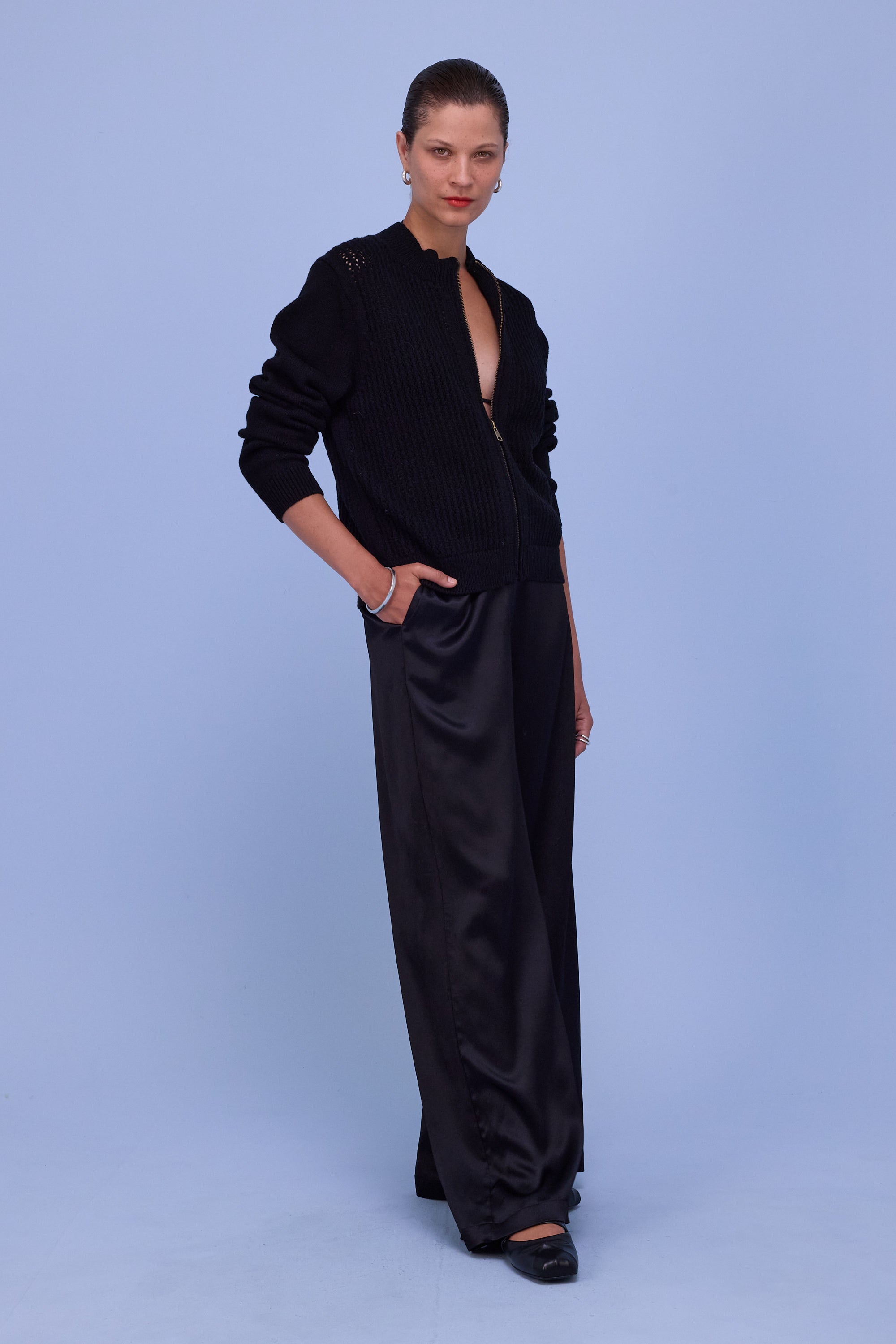 Cardigan with zip fastening in a robust blend of cotton and merino wool, crafted in a thick yarn that gives the knit a certain volume and weight. The front and back panels are knitted in an openwork fantasy stitch, creating a subtle see-through effect.