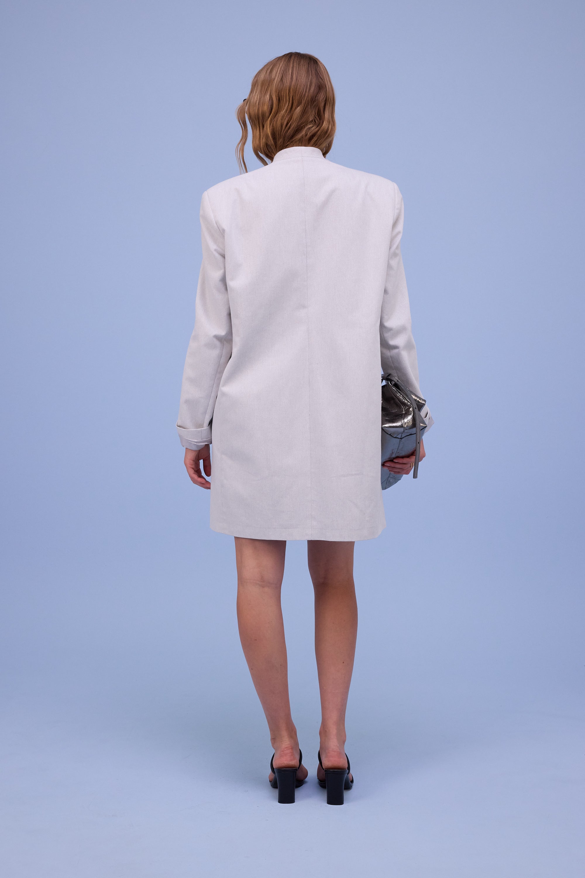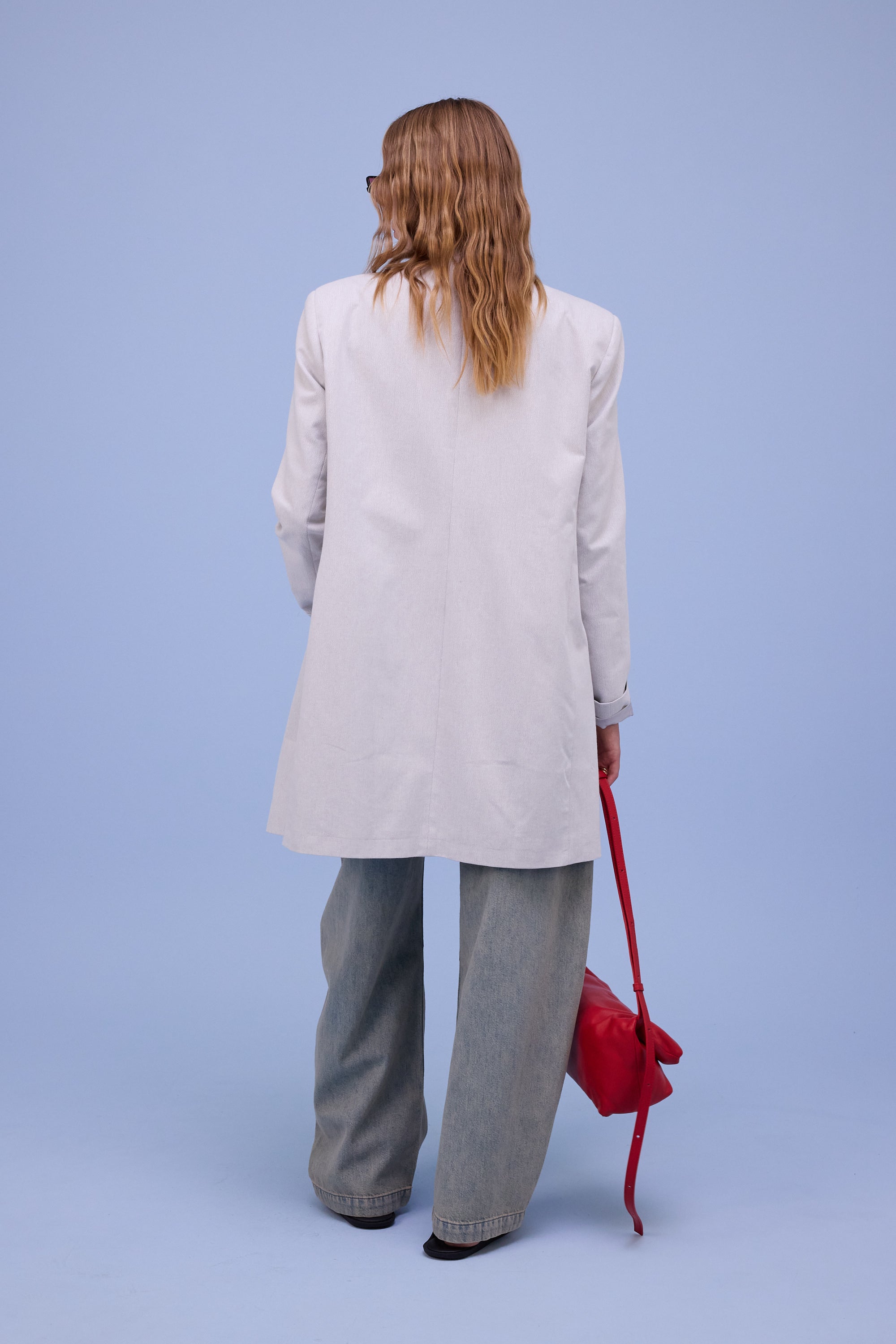 Collarless long coat with double row of buttons in a cotton fabric interwoven with subtle tone-on-tone lurex thread.