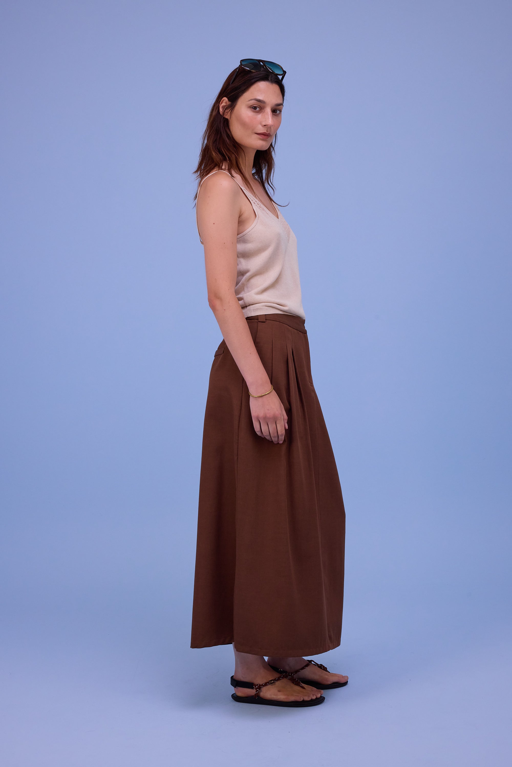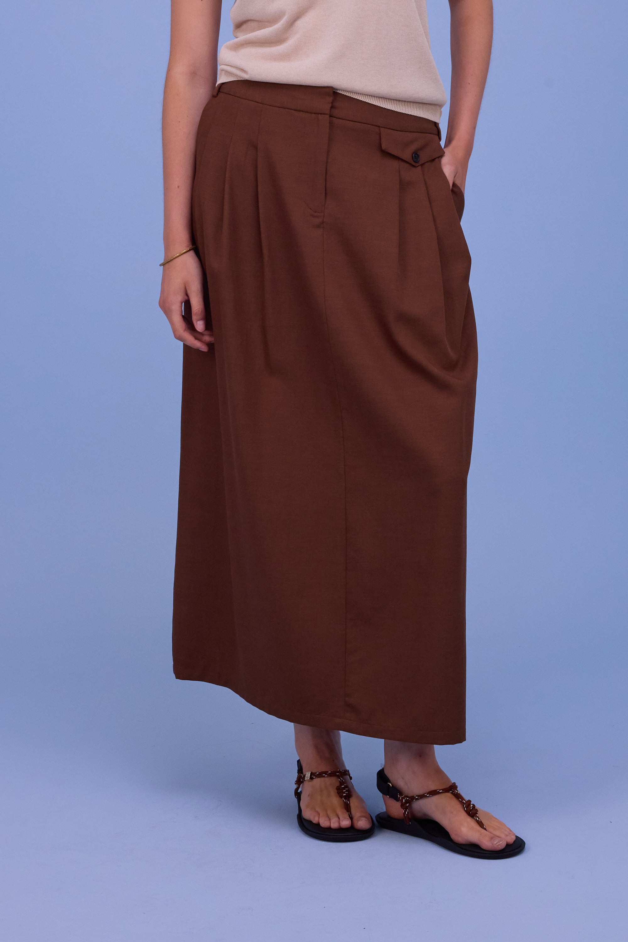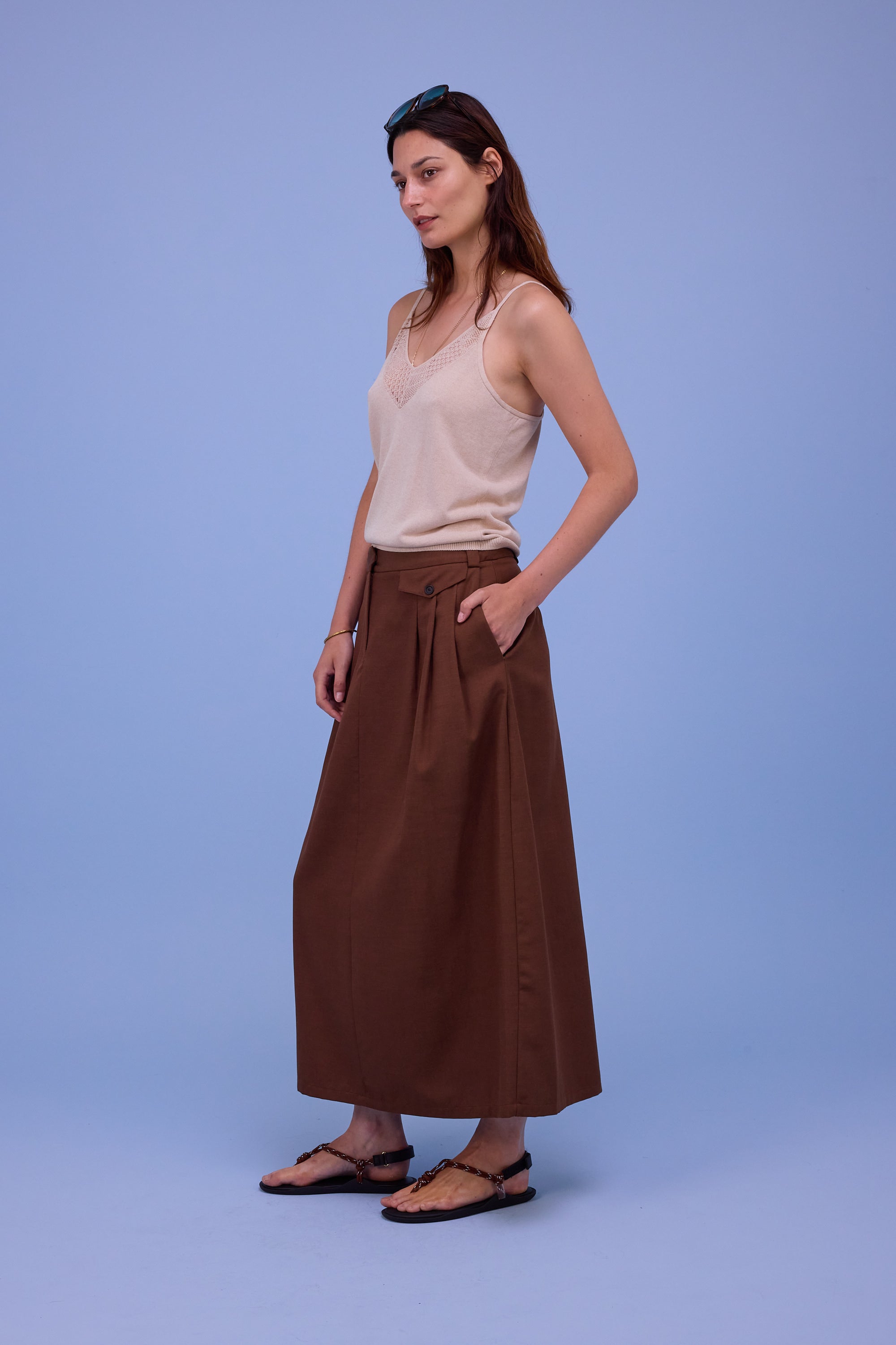 Elegant long skirt with an attached flap that suggests a pocket, a nod to the popular Guy trousers. Made from lyocell gabardine, a 100% natural fabric with a fine twill structure.