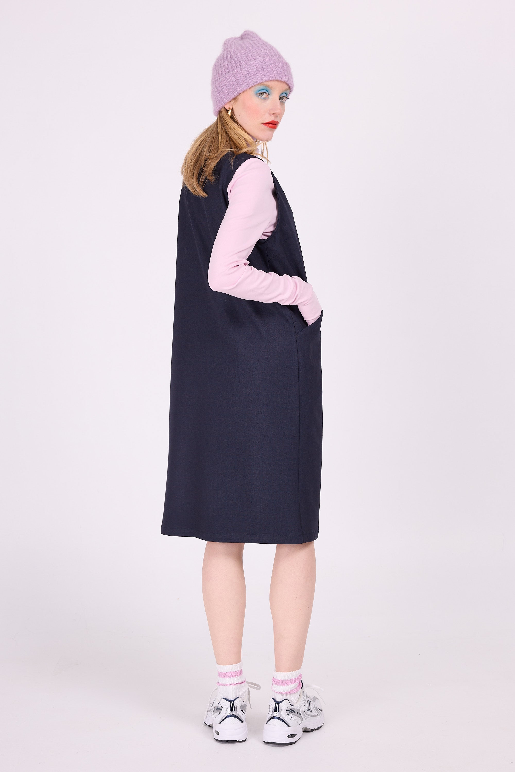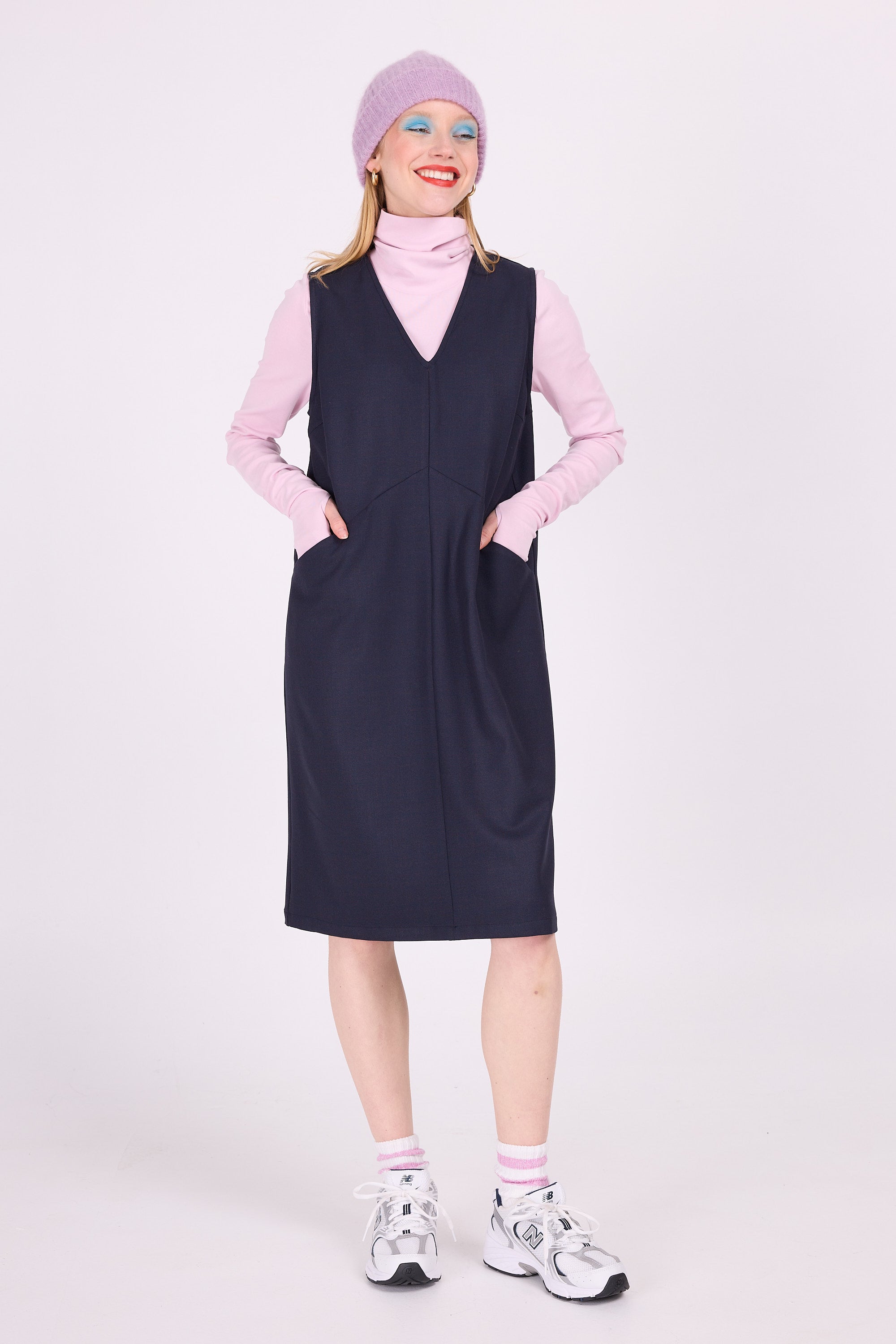 A-lijn jurk met V-hals in nachtblauwe geweven stof met subtiele rode spikkel. De steekzakken zijn subtiel ingewerkt in de schuinlopende naden die samen met de verticale middennaad de look van de jurk bepalen. Draag Emmy als overgooier op een rolkraagtruitje om de jurk langer te kunnen doordragen.