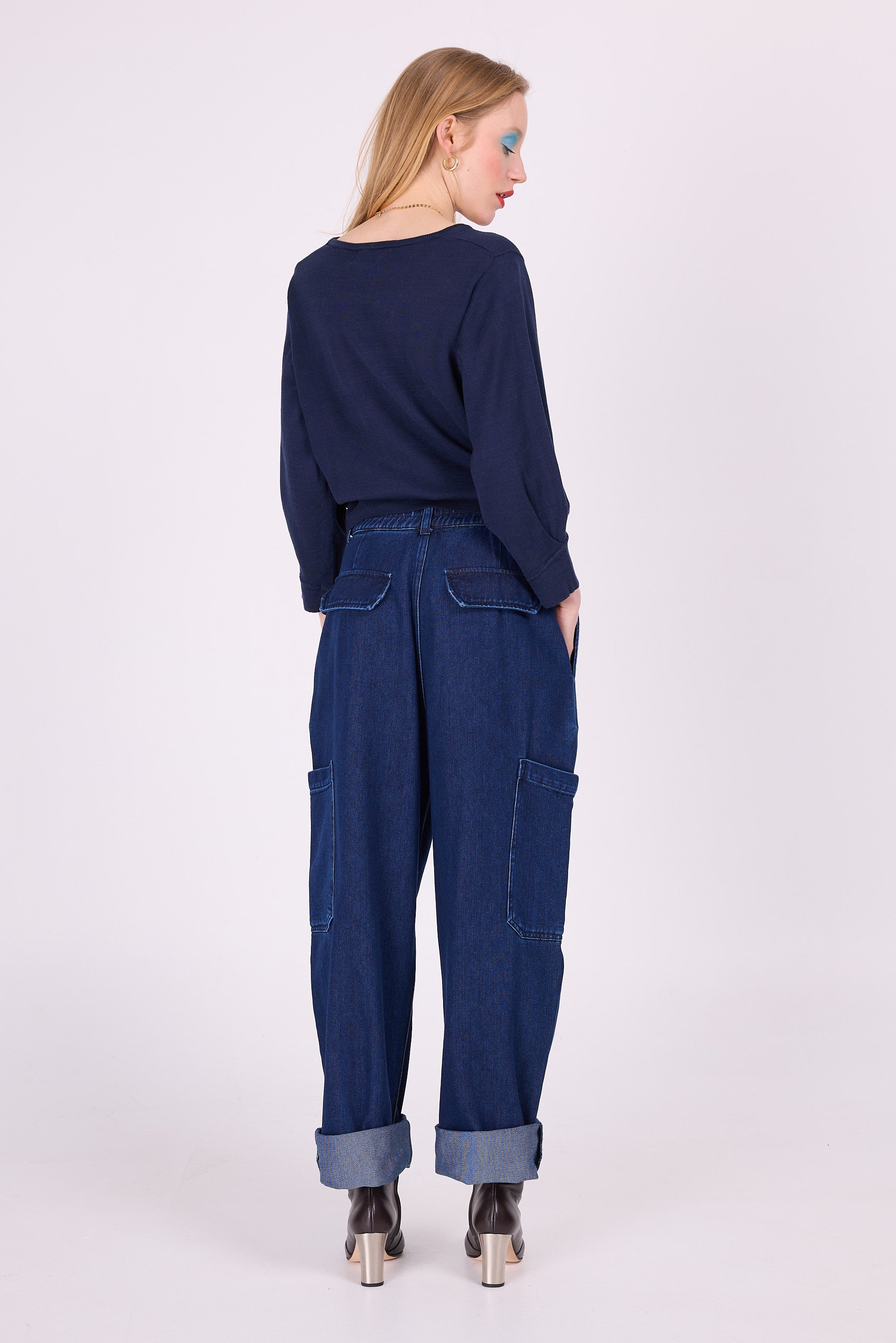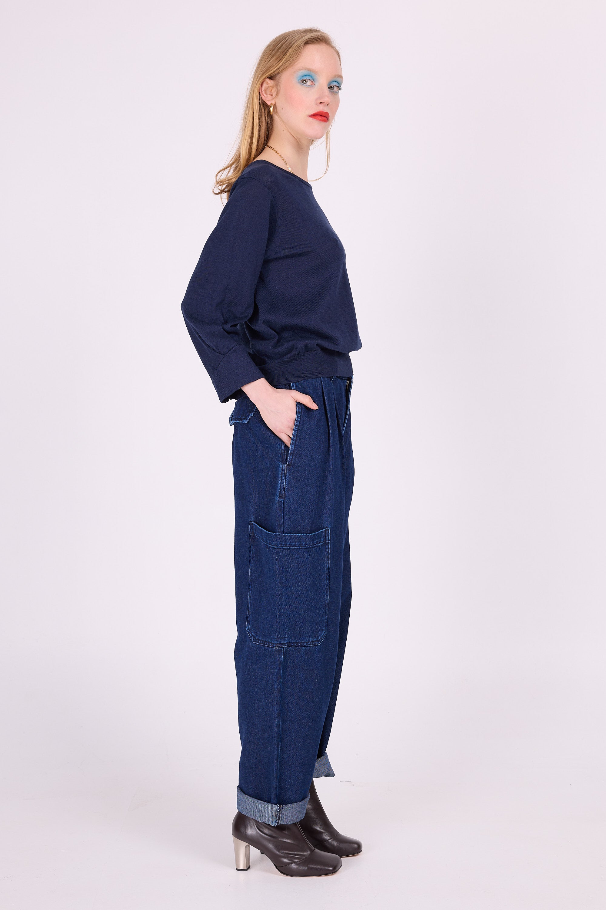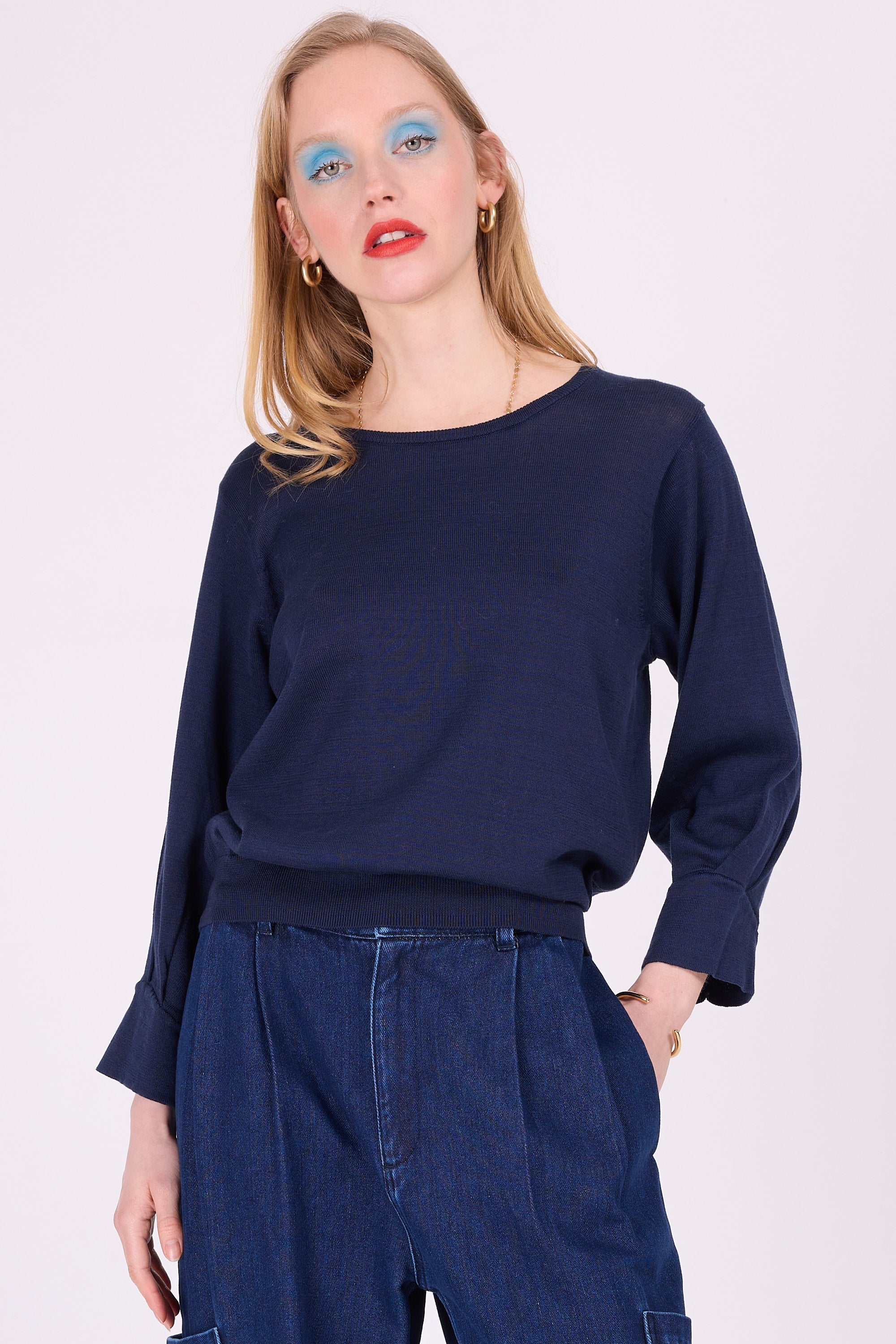 Passe-partout truitje met elegante vouw op de 7/8ste mouw, een vaste waarde in de collectie. Dit seizoen gebreid in gesatineerd katoen.