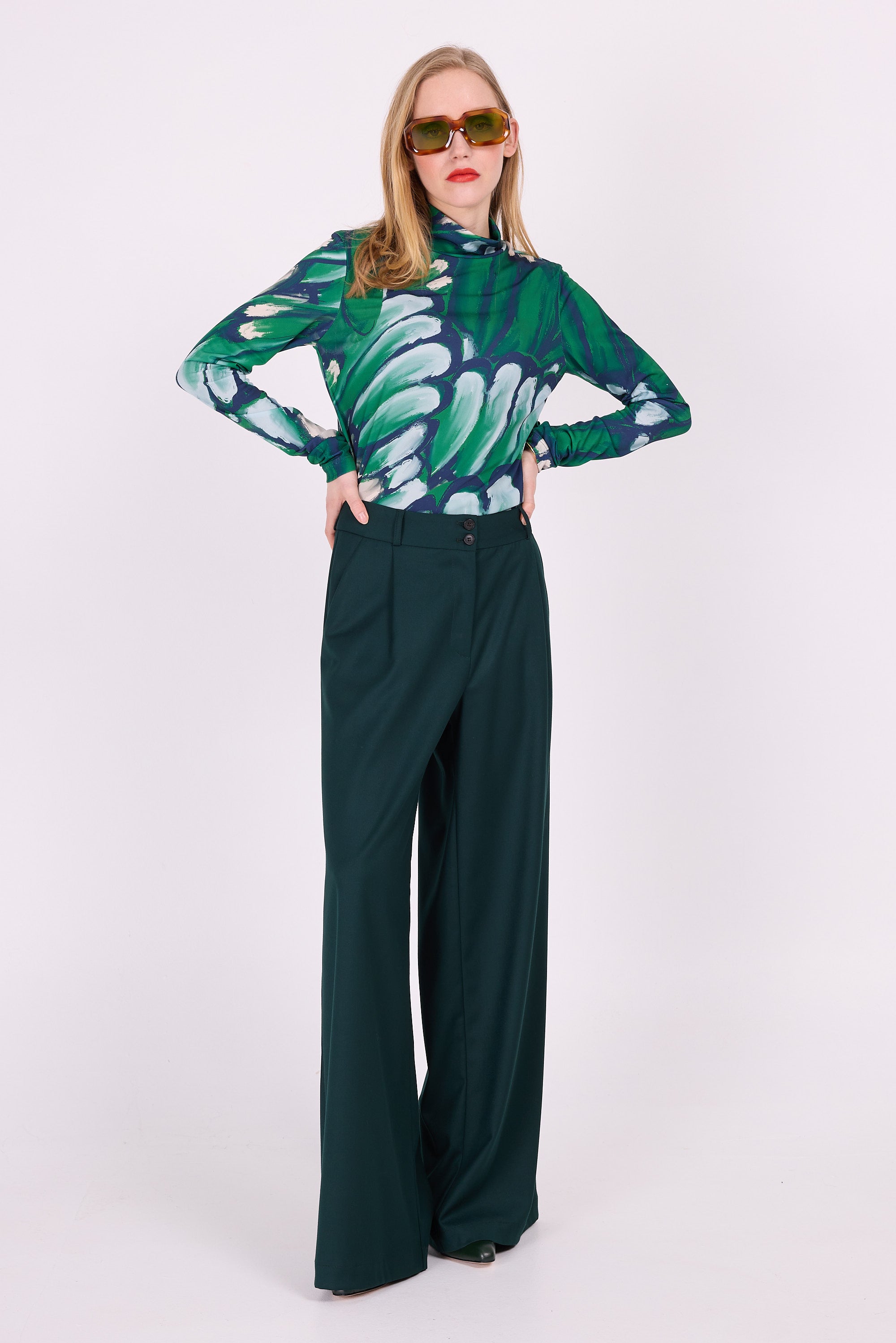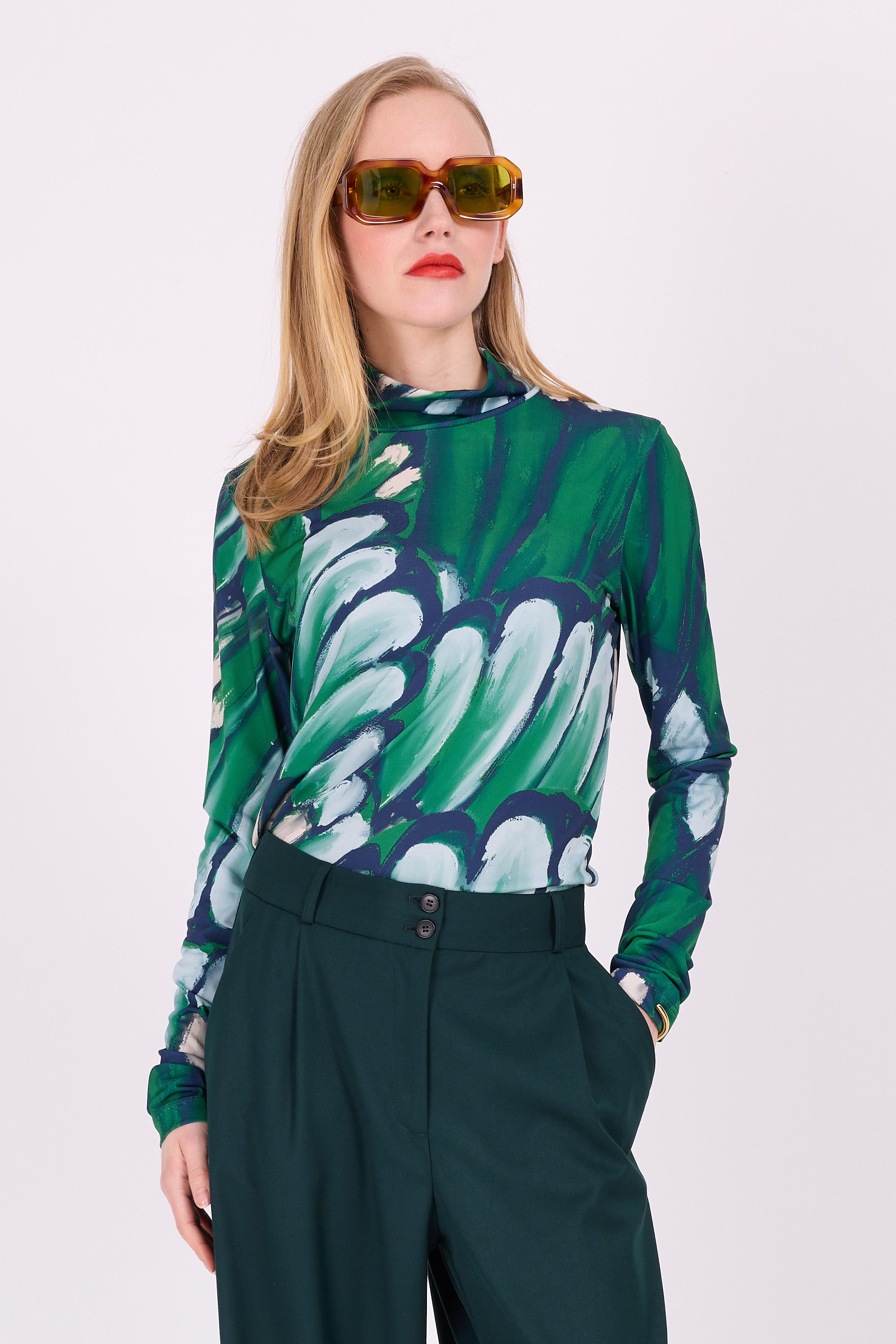 Aanpassend T-shirt met rolkraag in stretchstof met weelderige print. Net dat tikkeltje anders doordat de mouwen optisch verlengend zijn met de duimsgaten die de mouwen halverwege je hand houden. Ideaal stuk voor een outfit in laagjes.