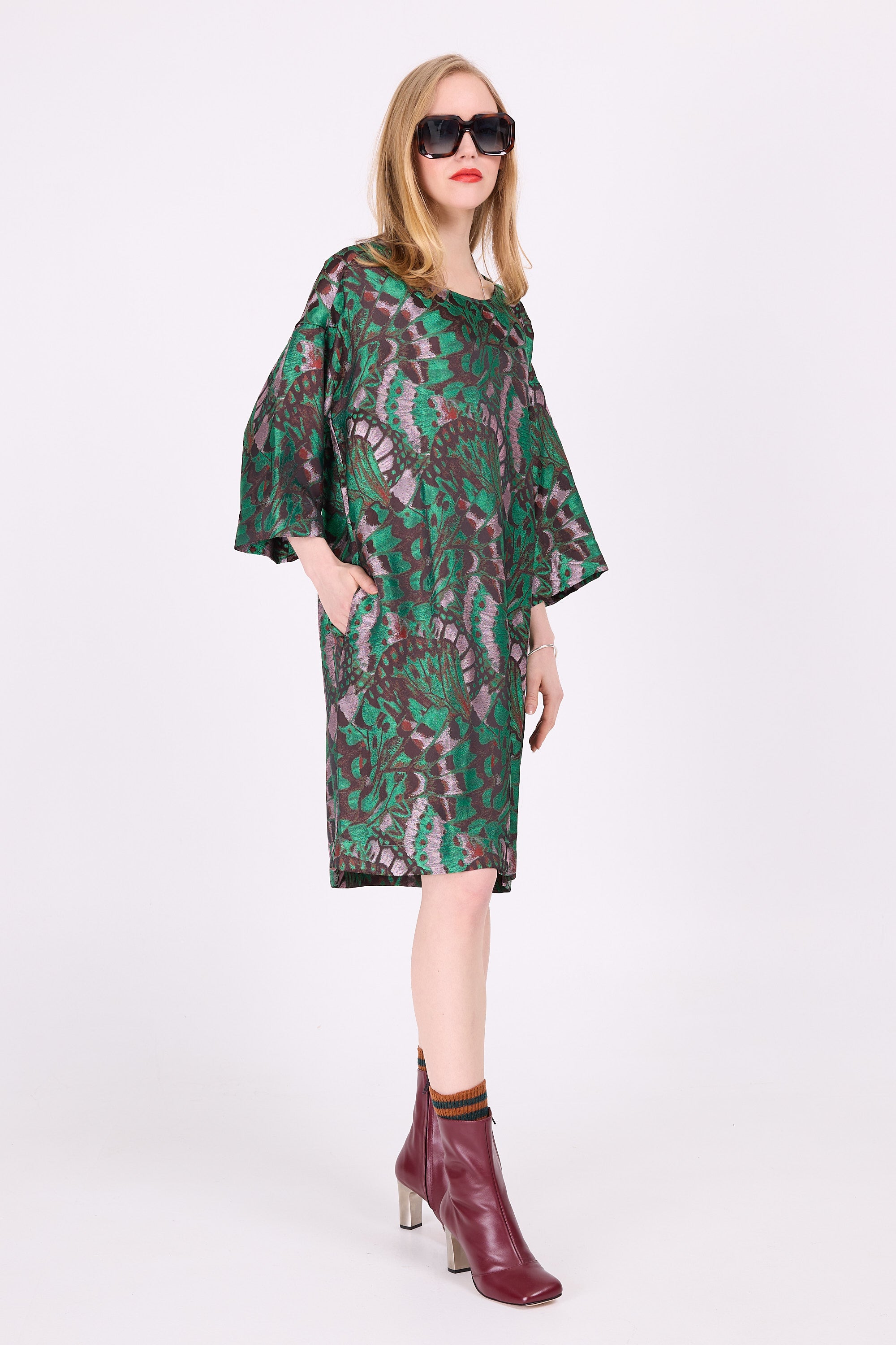 Losse jurk in een soepelvallende geweven jacquardstof met ingeweven vlinderprint, met prachtige kleurschakeringen die uitwaaieren van gifgroen en koper naar zachtroze en diepbruin.