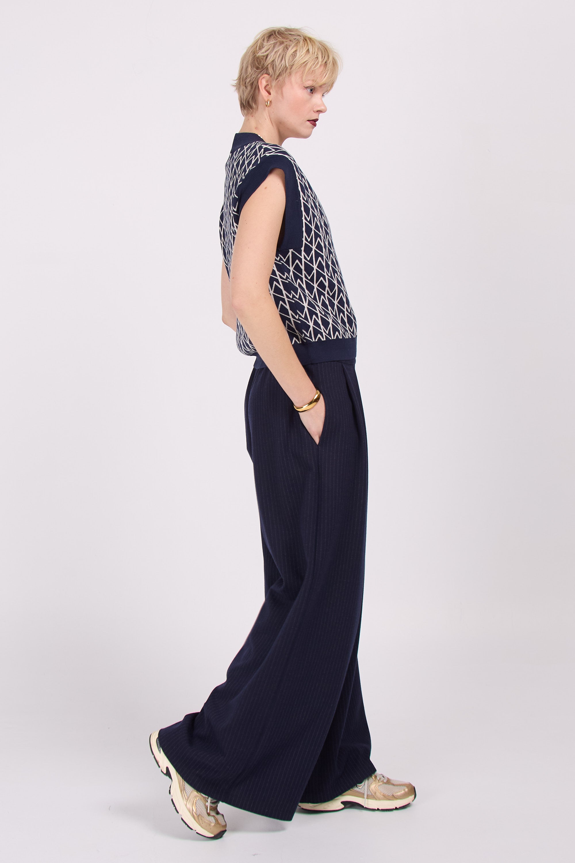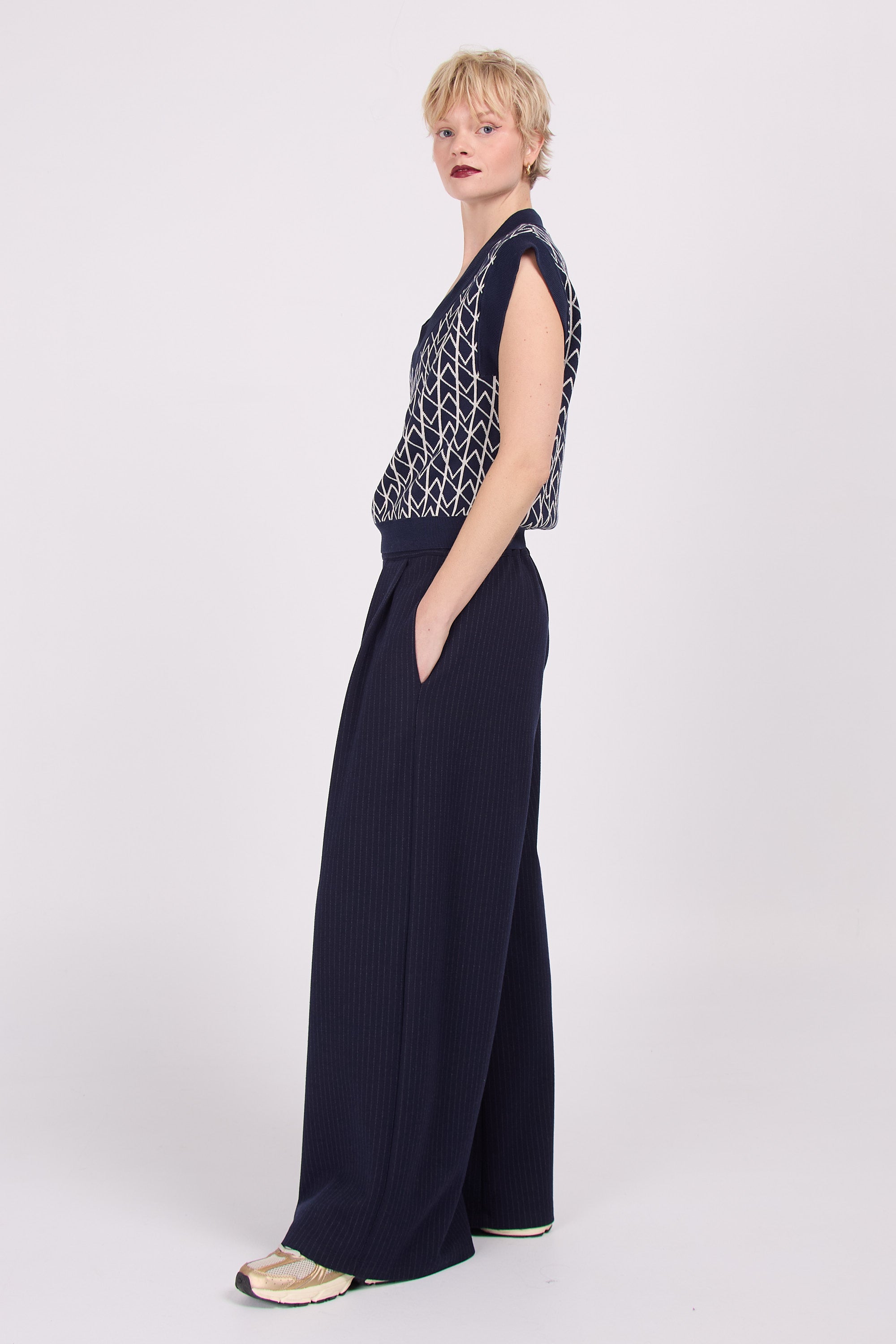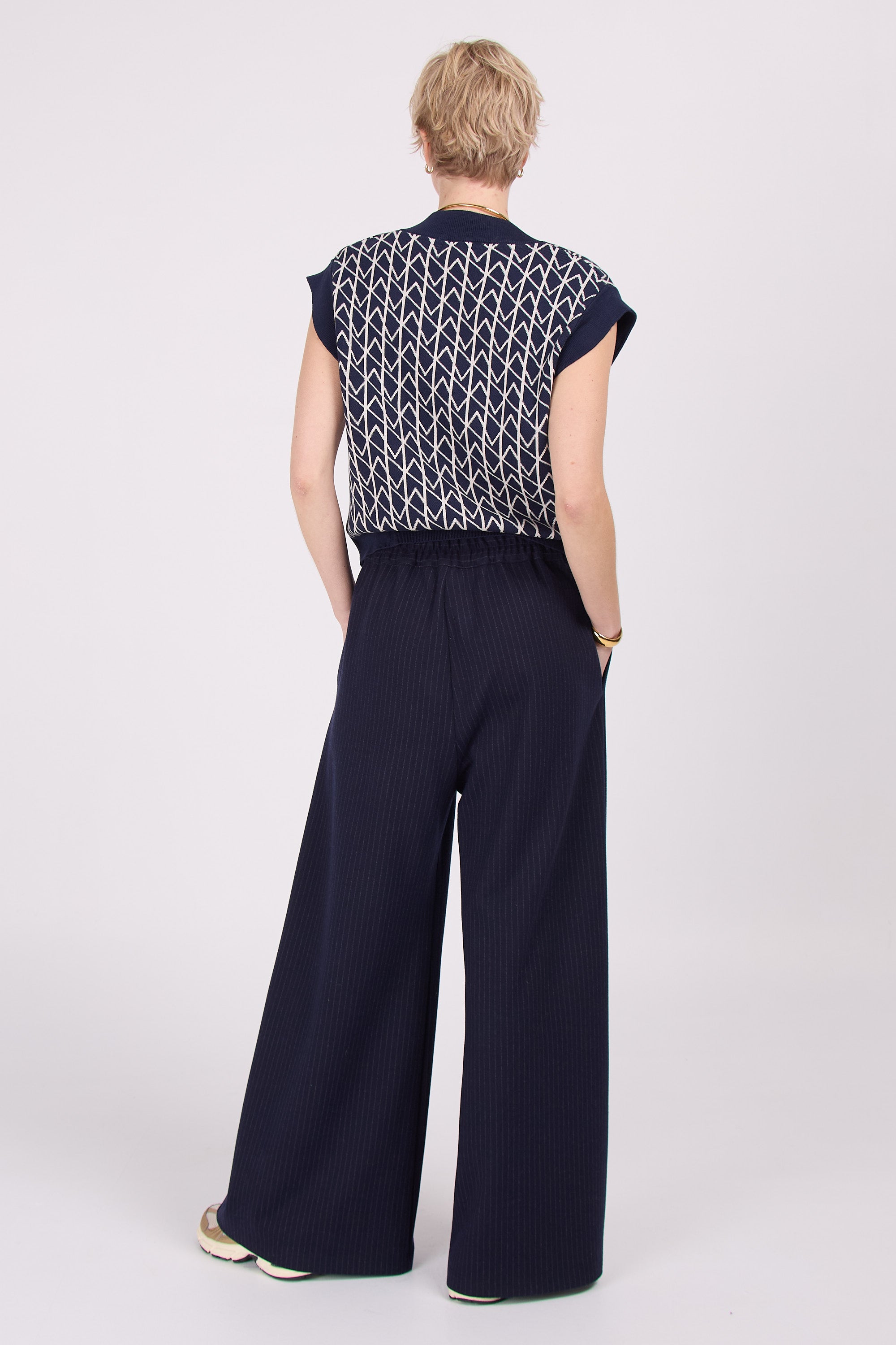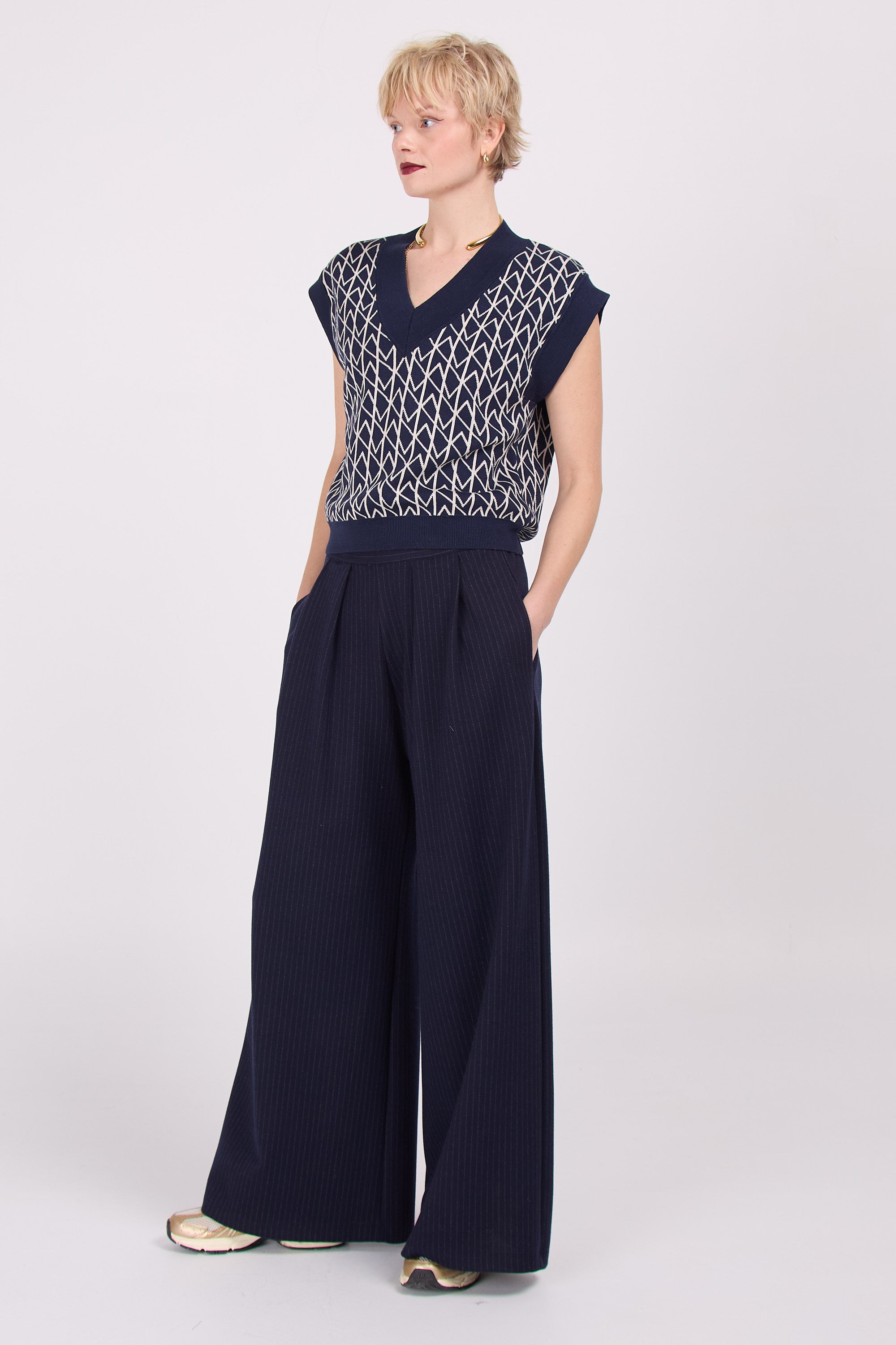 Volumineuze broek in soepele stof, waardoor het bijna een broekrok lijkt, zusje van broek Clinton, maar voor het eerst in een stretchstof. De subtiele krijtstrepen bepalen de comfy-chic look.