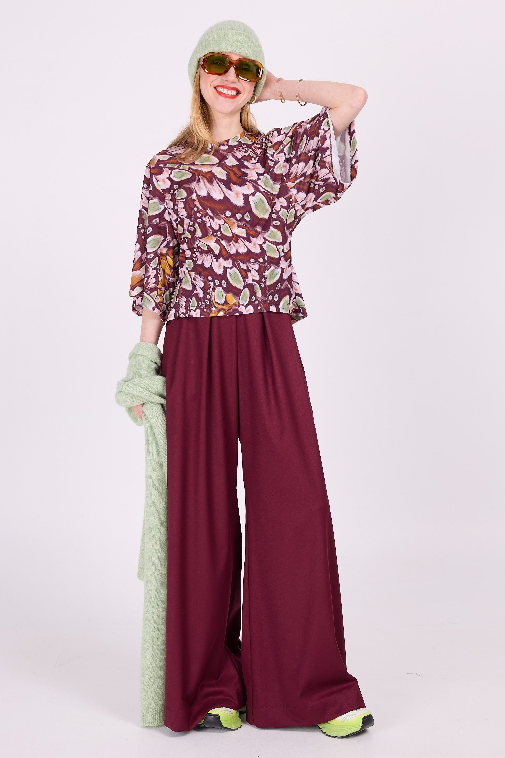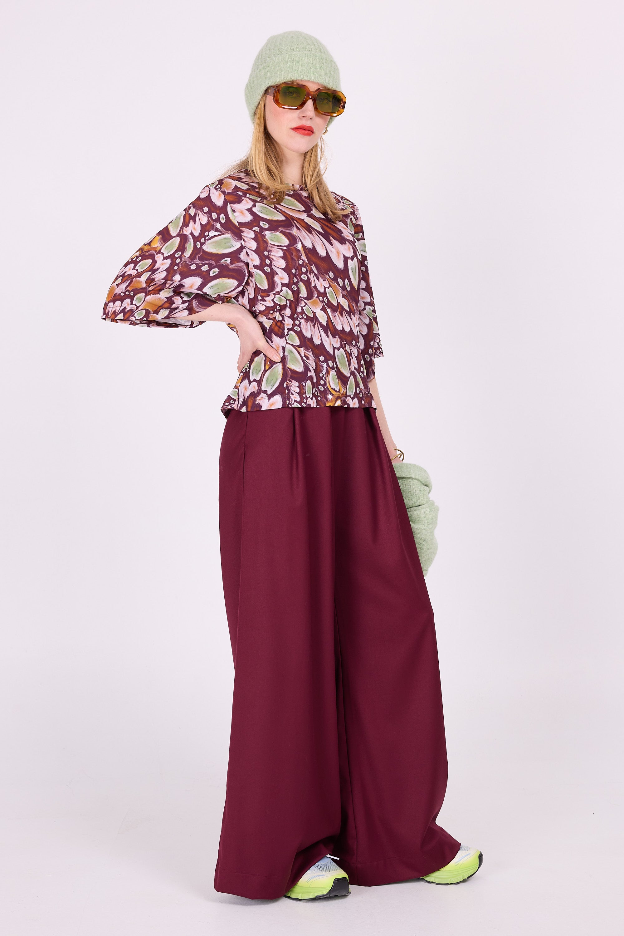 Gecentreerd T-shirt met vlindermouwen, een perfecte match met de print.