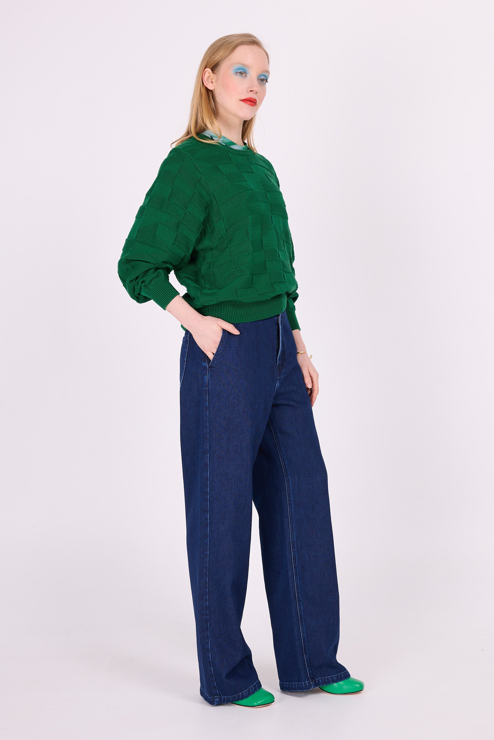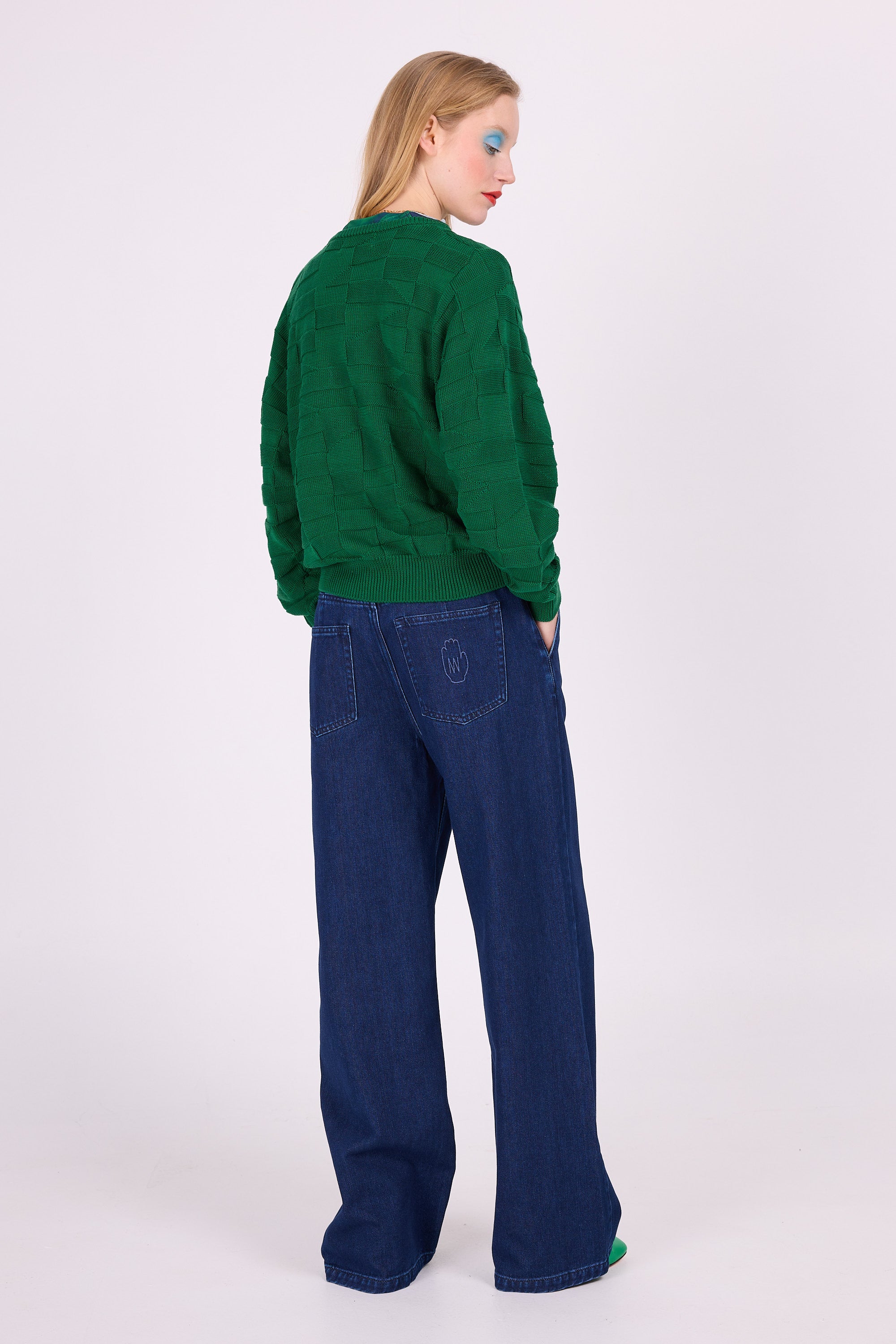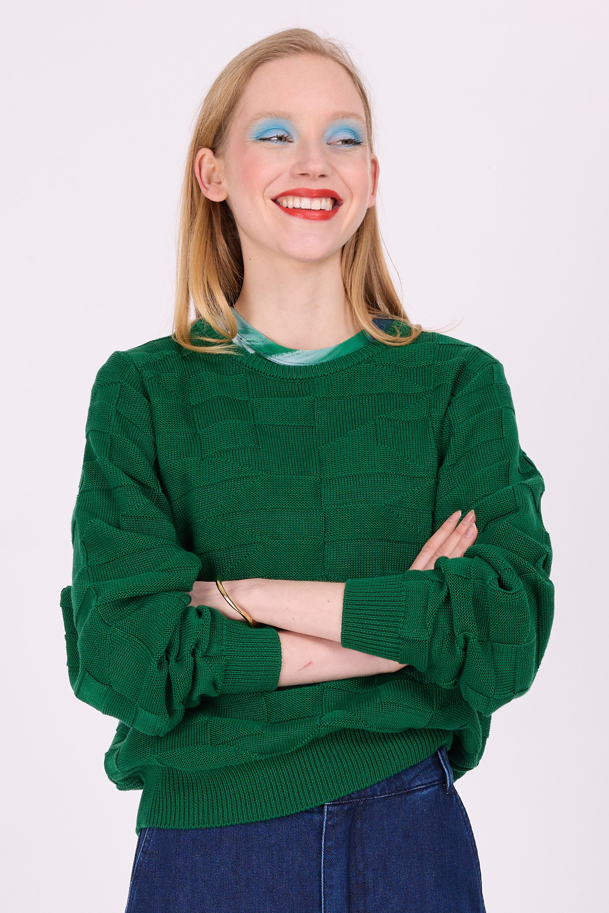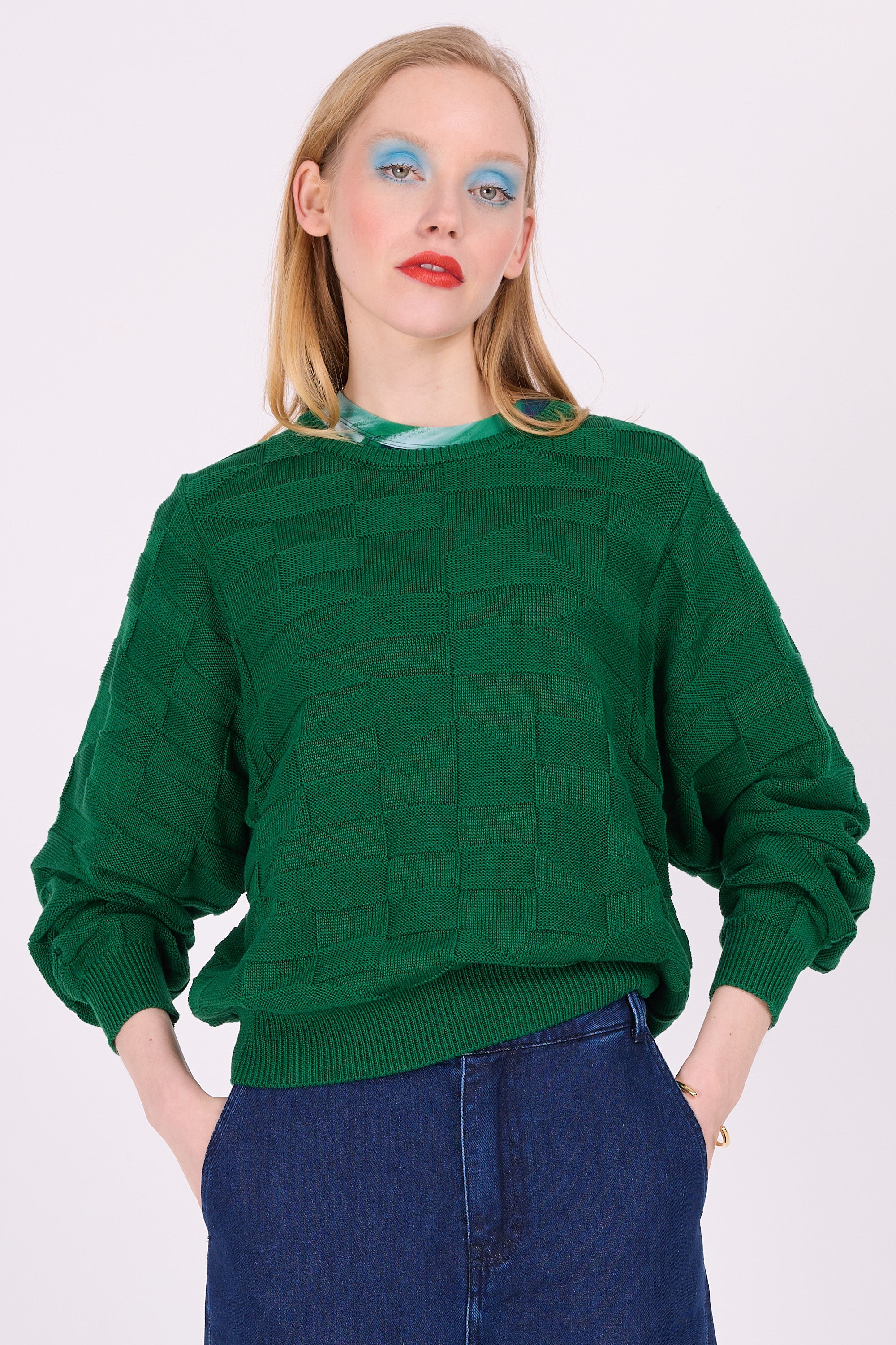 Losvallende trui in dubbeldraads gesatineerd katoengaren. Het abstracte bas-reliëf patroon geeft de trui een speelse twist.