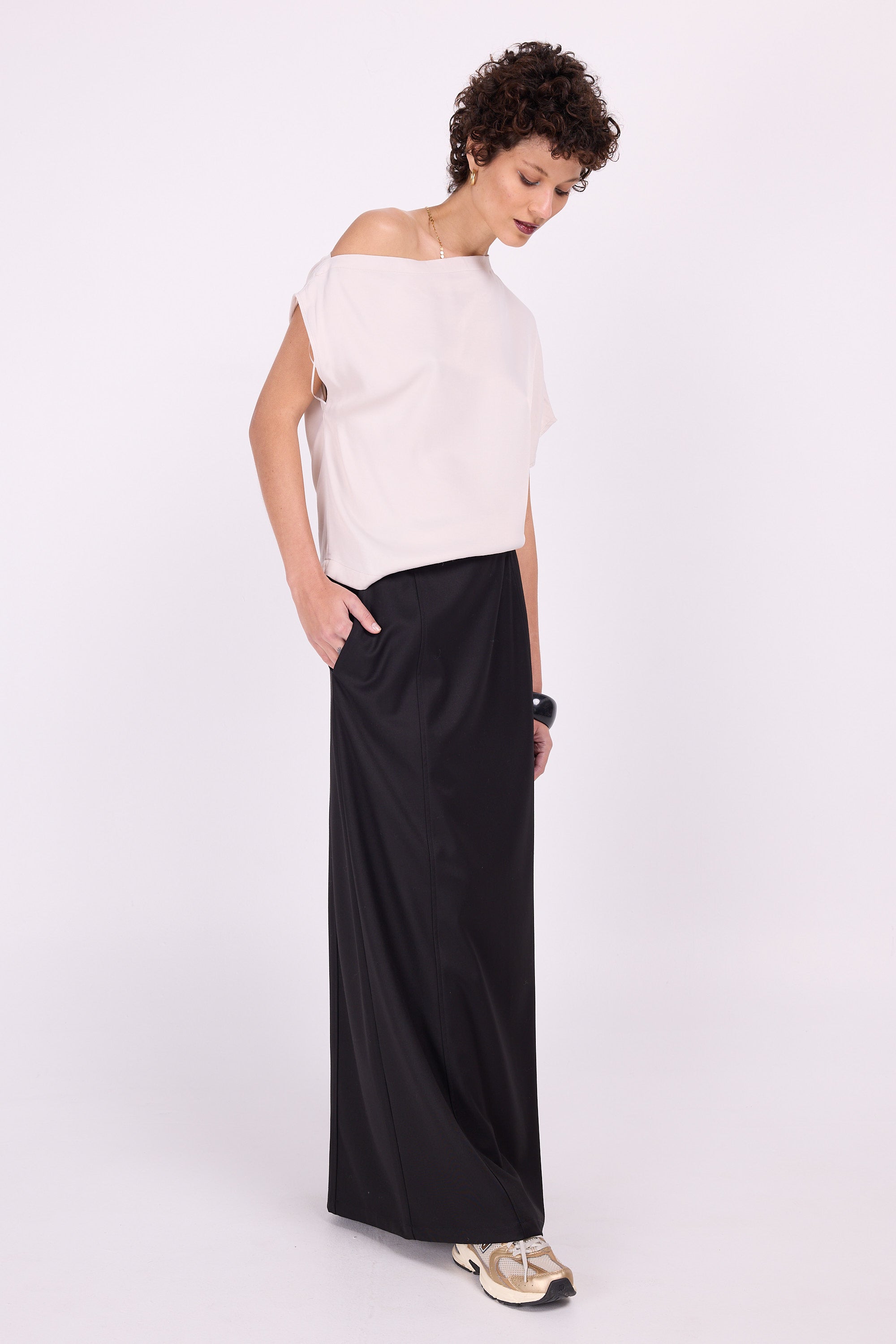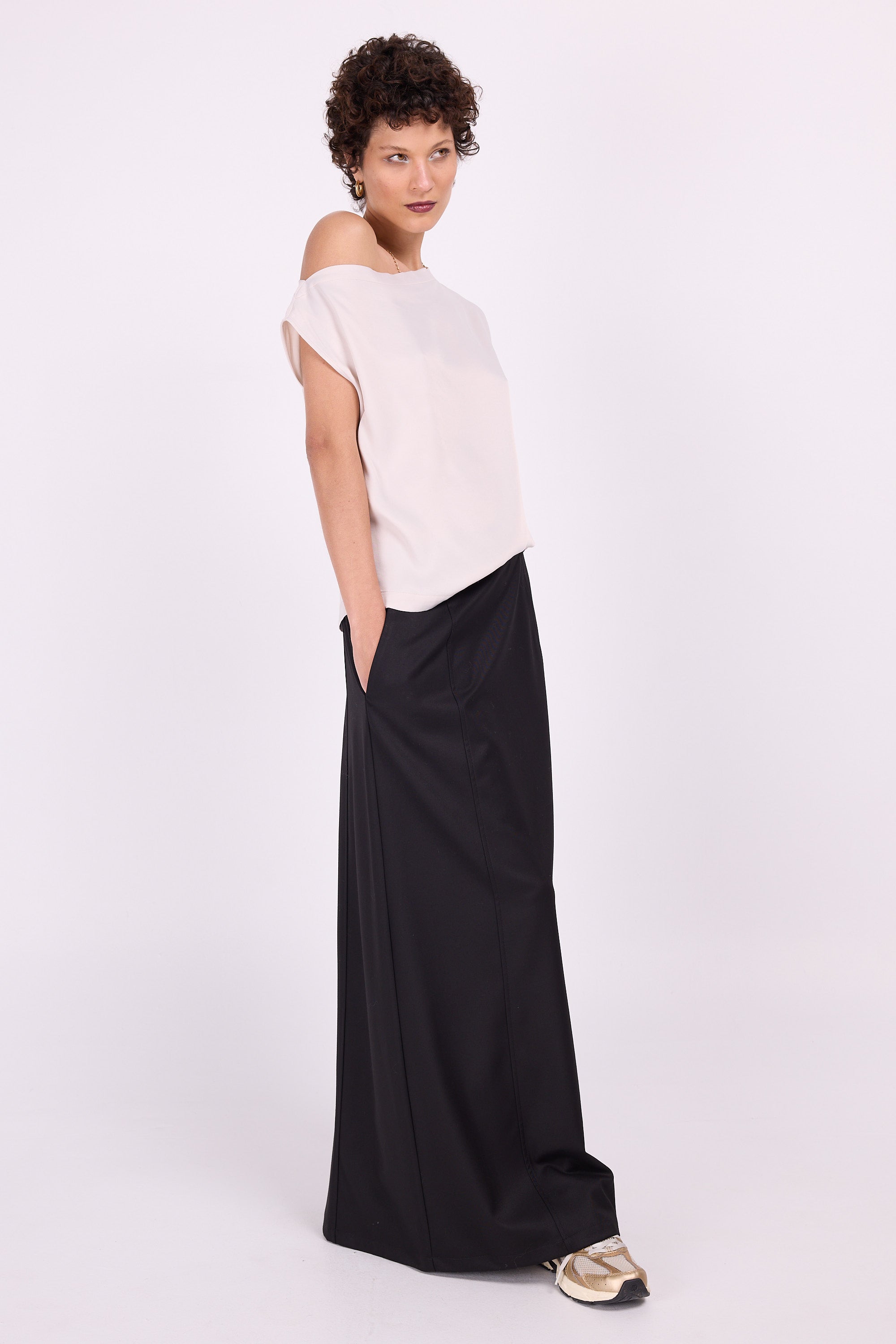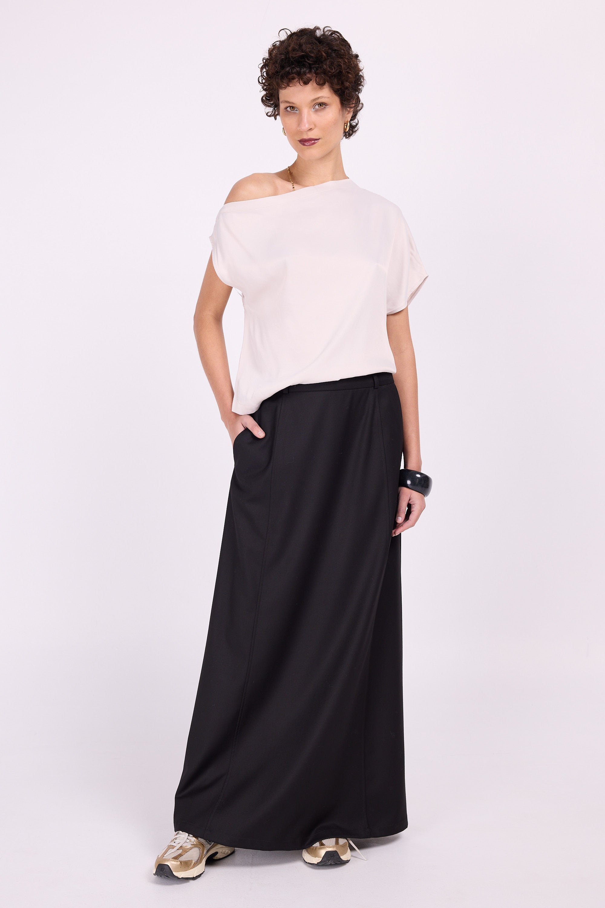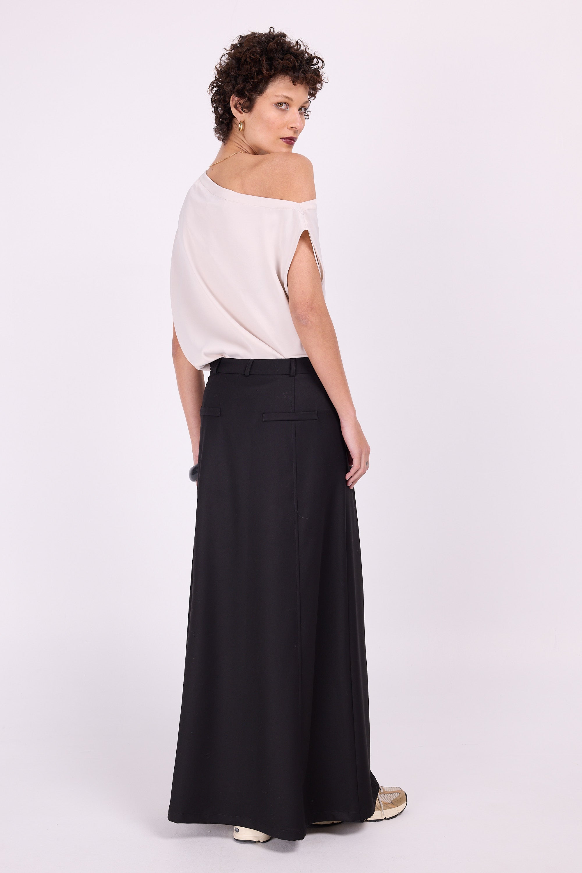 Enkellange brede rok in een mooie twill met subtiele glans.Een klassevol alternatief voor al die winterse broeken.