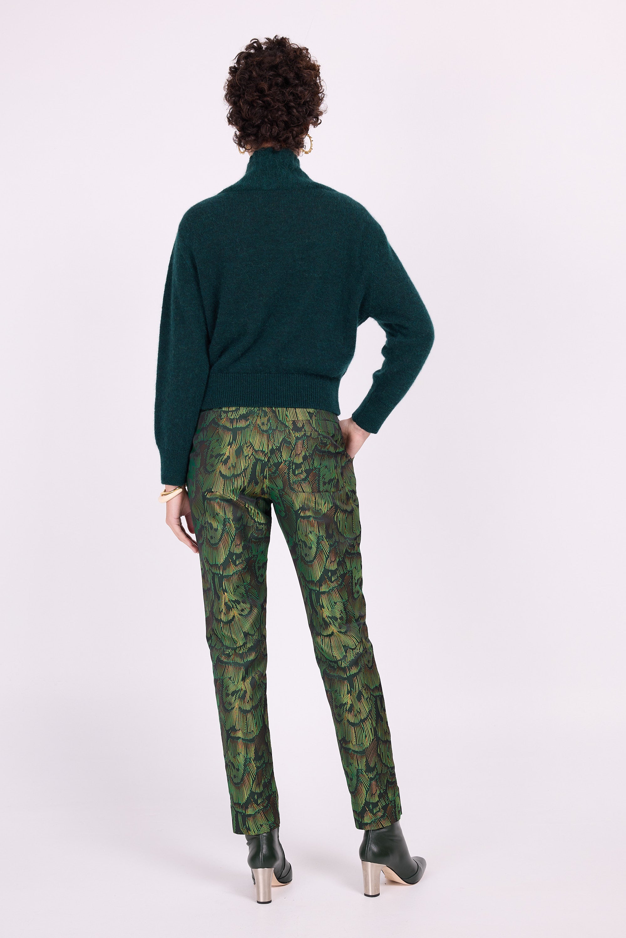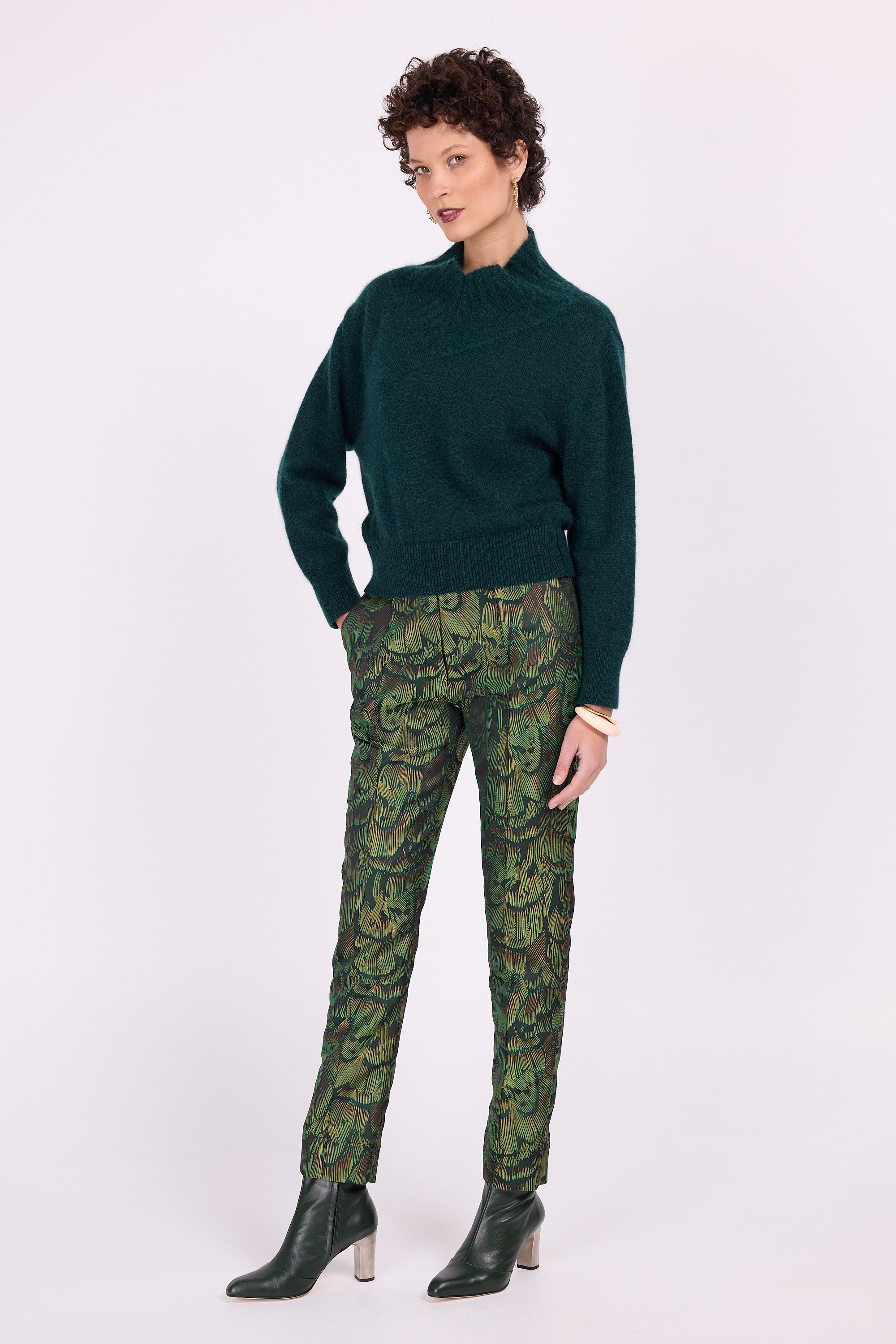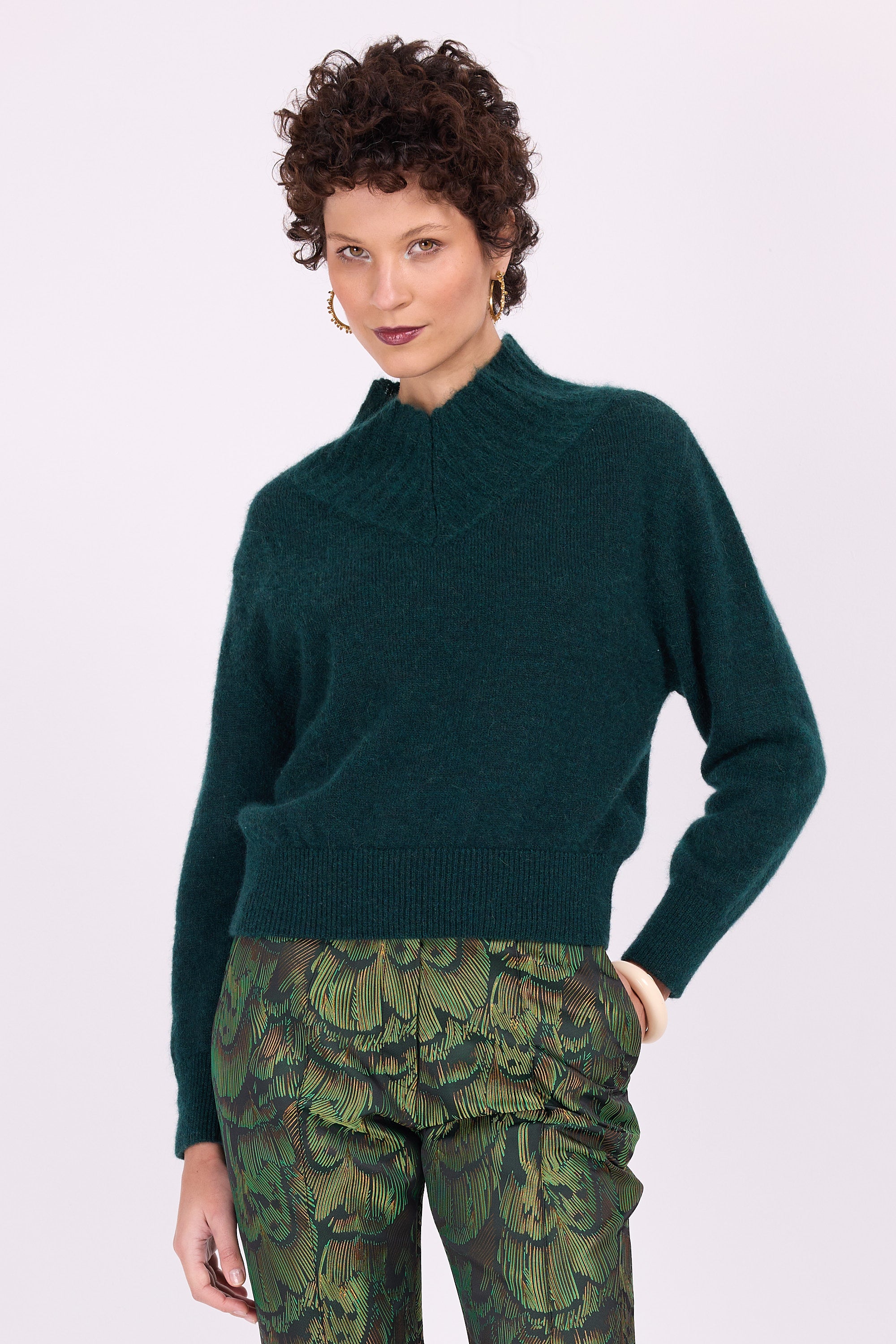 Gezellige trui in een alpaca wolmix, gebreid in België. Losvallend pasvorm met licht opstaande geribde V-hals kraag.
