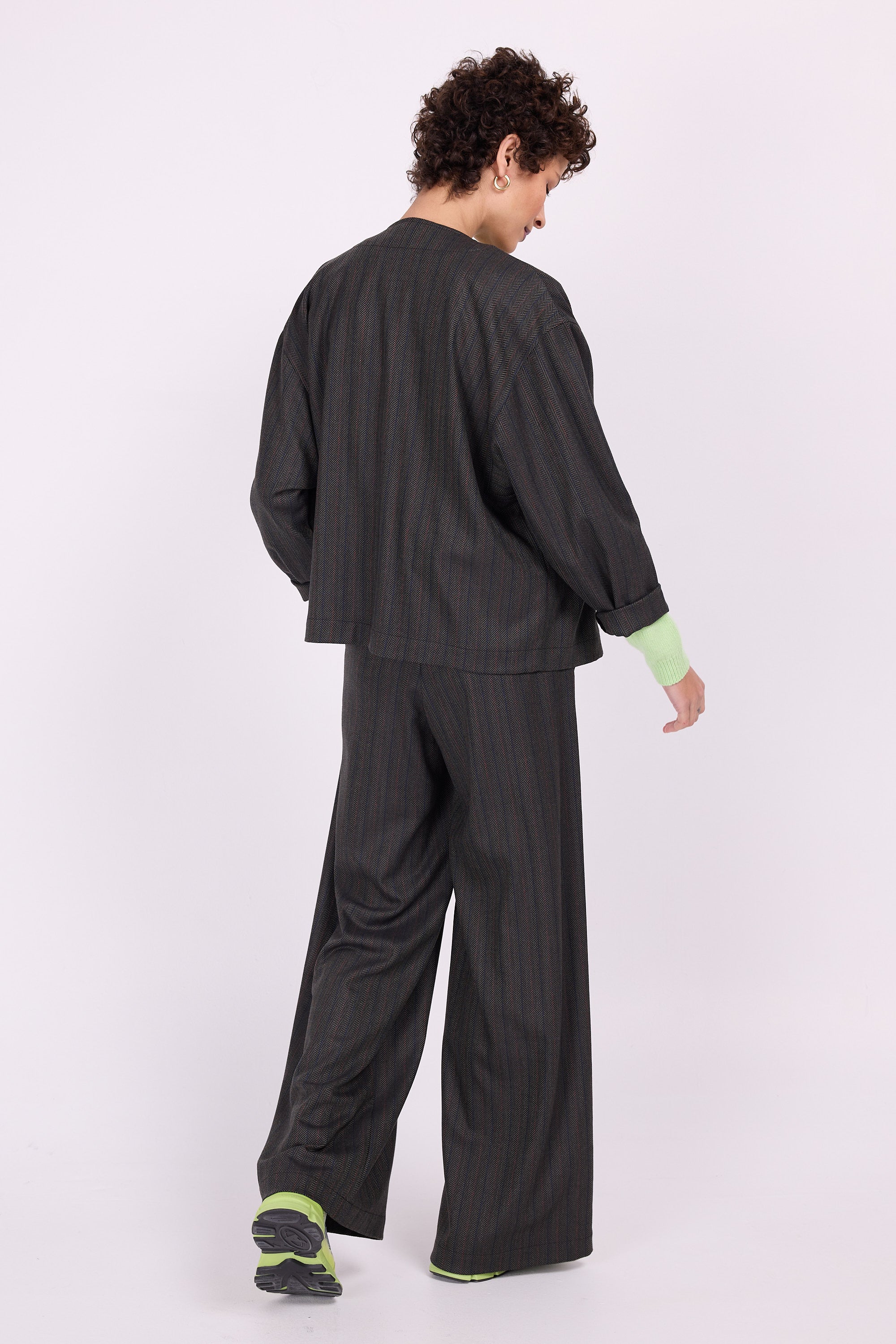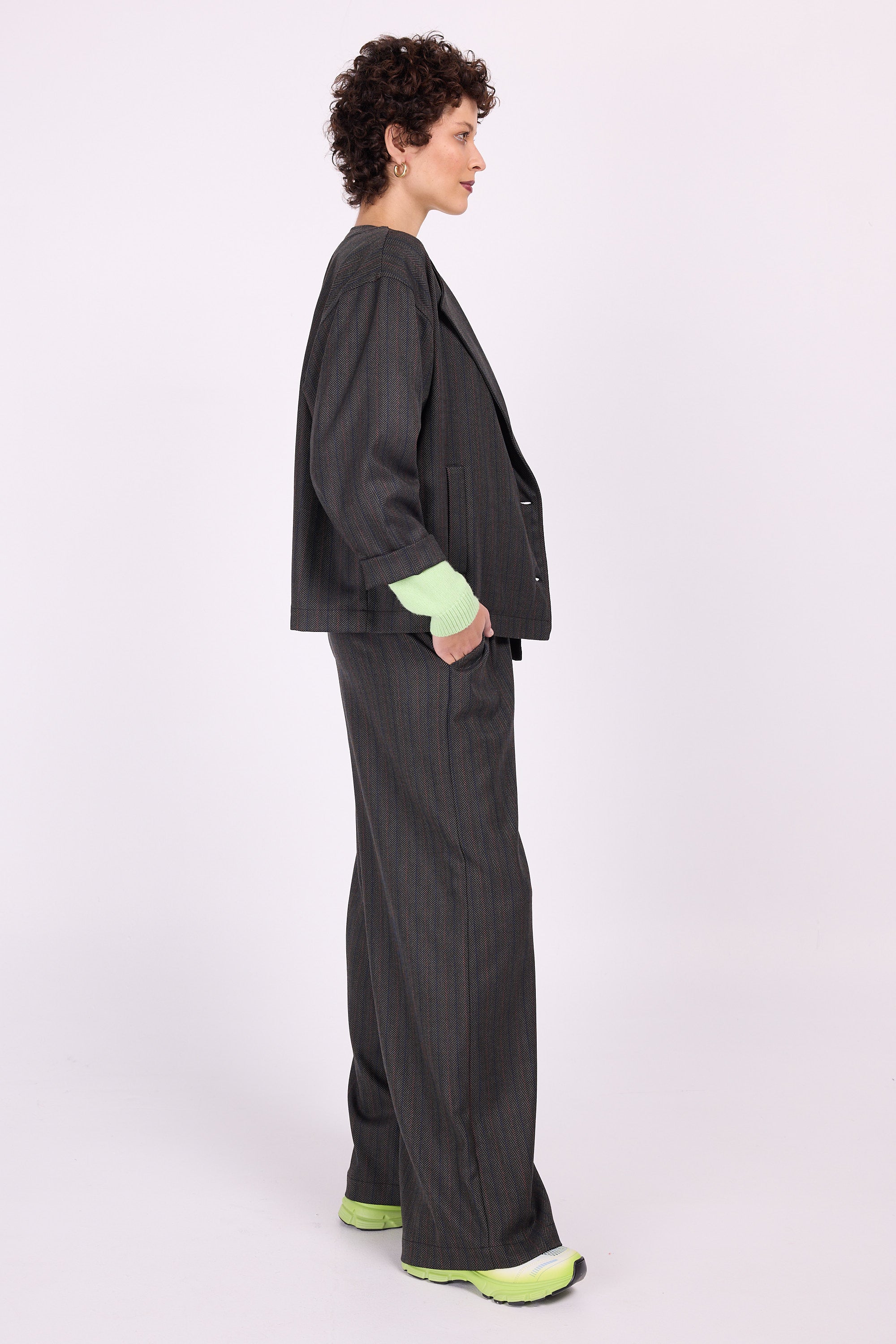 In deze uitvoering is het jasje gemaakt van een geweven stof met visgraatpatroon en roze accentstreep. Maak de look compleet door het te combineren met broek Zoëlla of Annie in dezelfde stof.