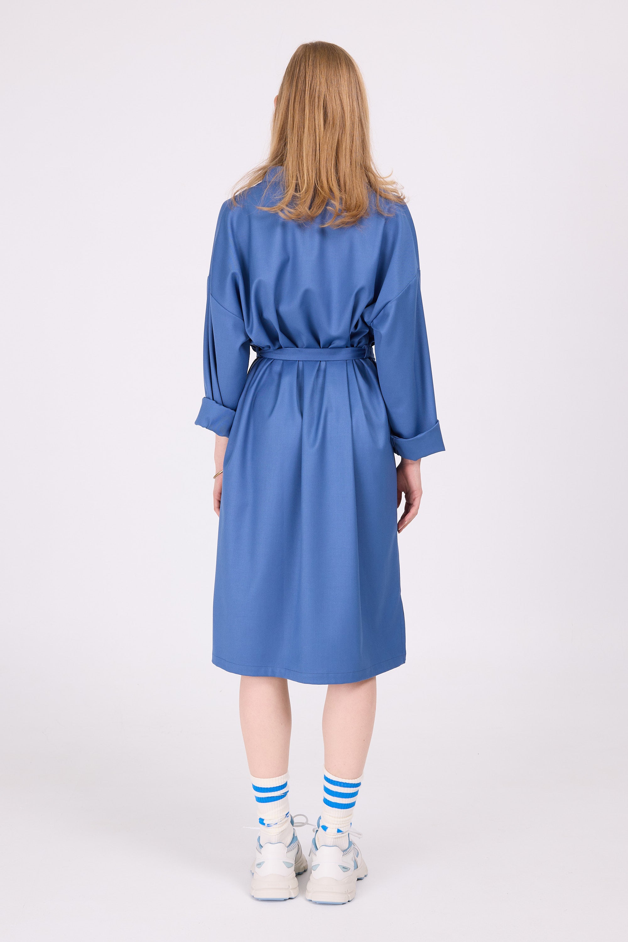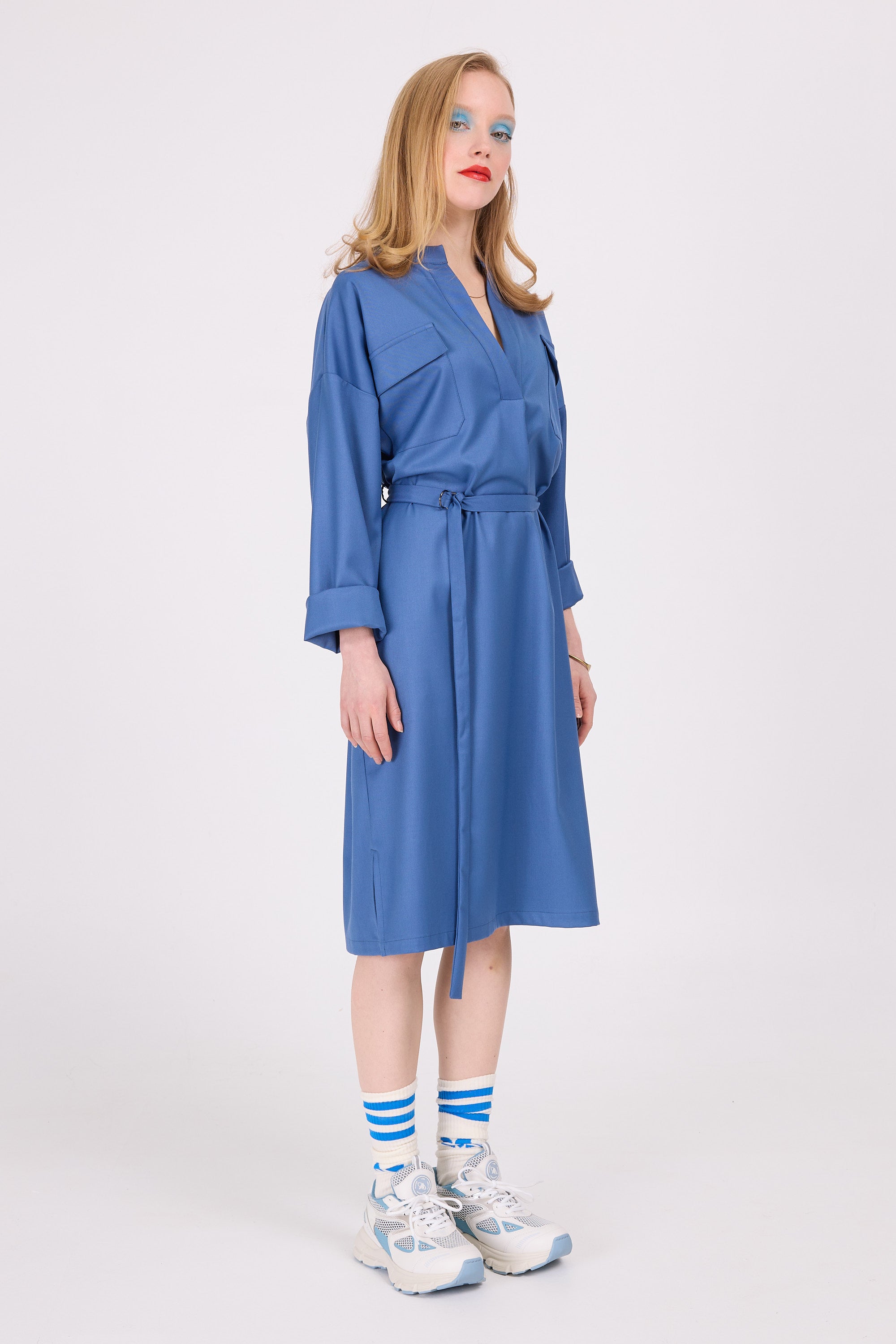 Knielange jurk met platte officierskraag en opgezette zakken. Met de losse riem bepaal je zelf hoe gecentreerd je de jurk wil en hoe hard je ze laat bloezen, hierdoor heb je zelf controle over de lengte.