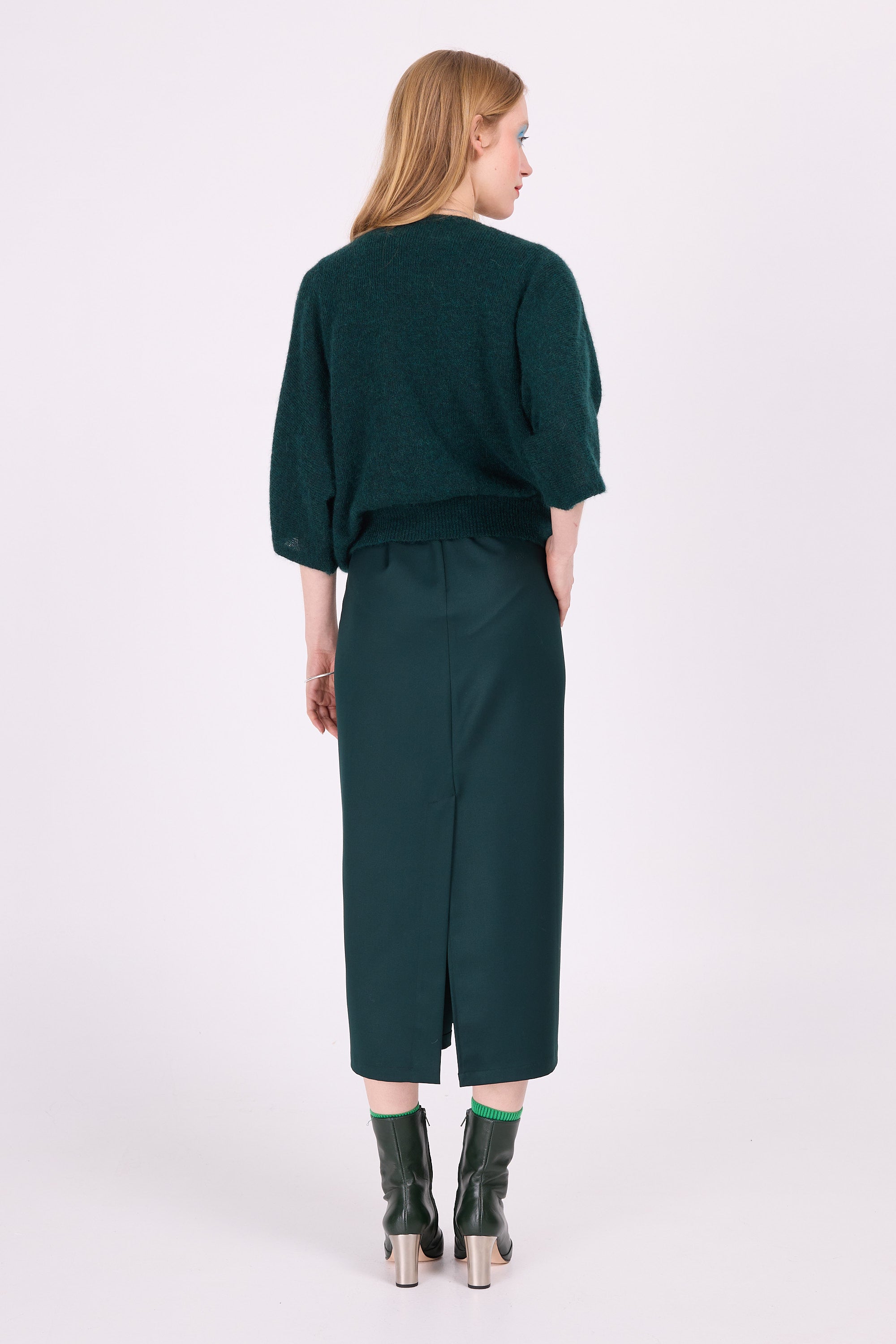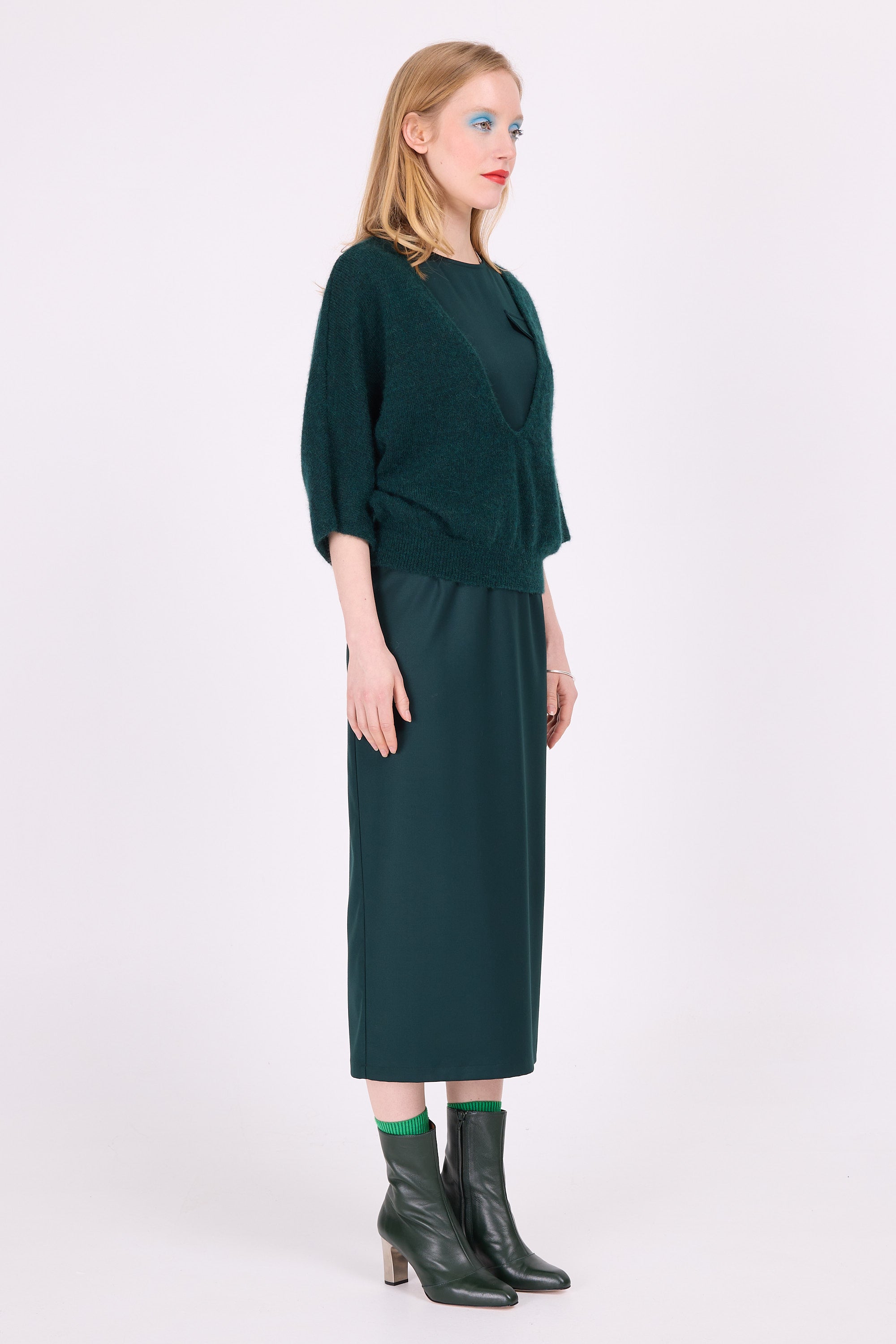 Gecentreerd model, opgezette borstflap (geen zakje), ritssluiting op de rug, midilengte.